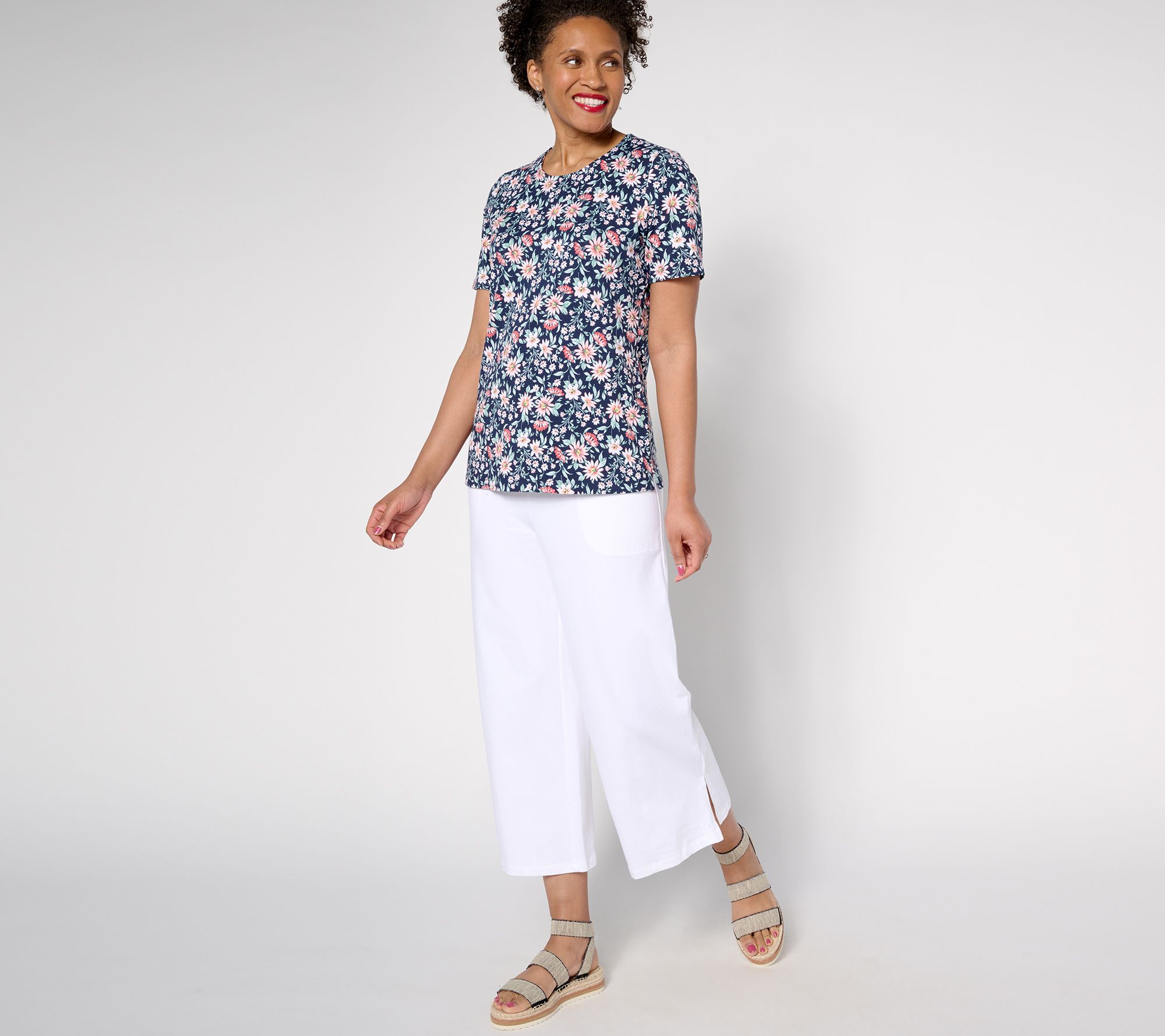 Your wardrobe just got an upgrade with this set of two classic tops. Designed with a round neckline, short sleeves, and side slits, the tops (one printed and one solid) are stylish staples for your wardrobe. From Denim & Co.® Fashions.