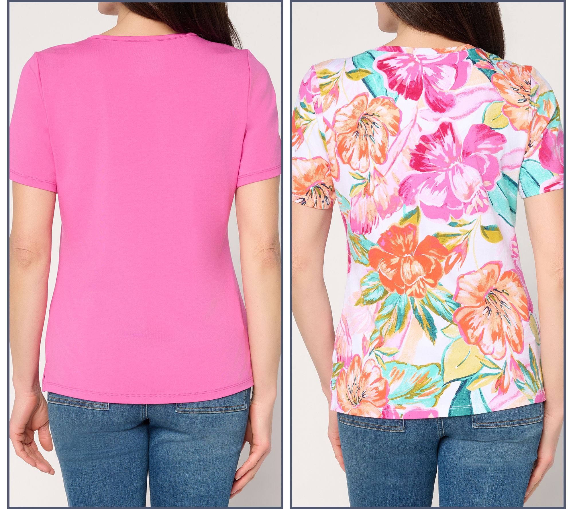 Enjoy versatile everyday style and comfort with this two-pack of jersey tops -- one playful print, one goes-with-everything solid. Soft knit with stretch and easy silhouettes makes these tops feel great for strolls around town, friendly get-togethers, or quiet nights at home. Mix and match for endless outfit combinations in every season. From Denim & Co.® Fashions.