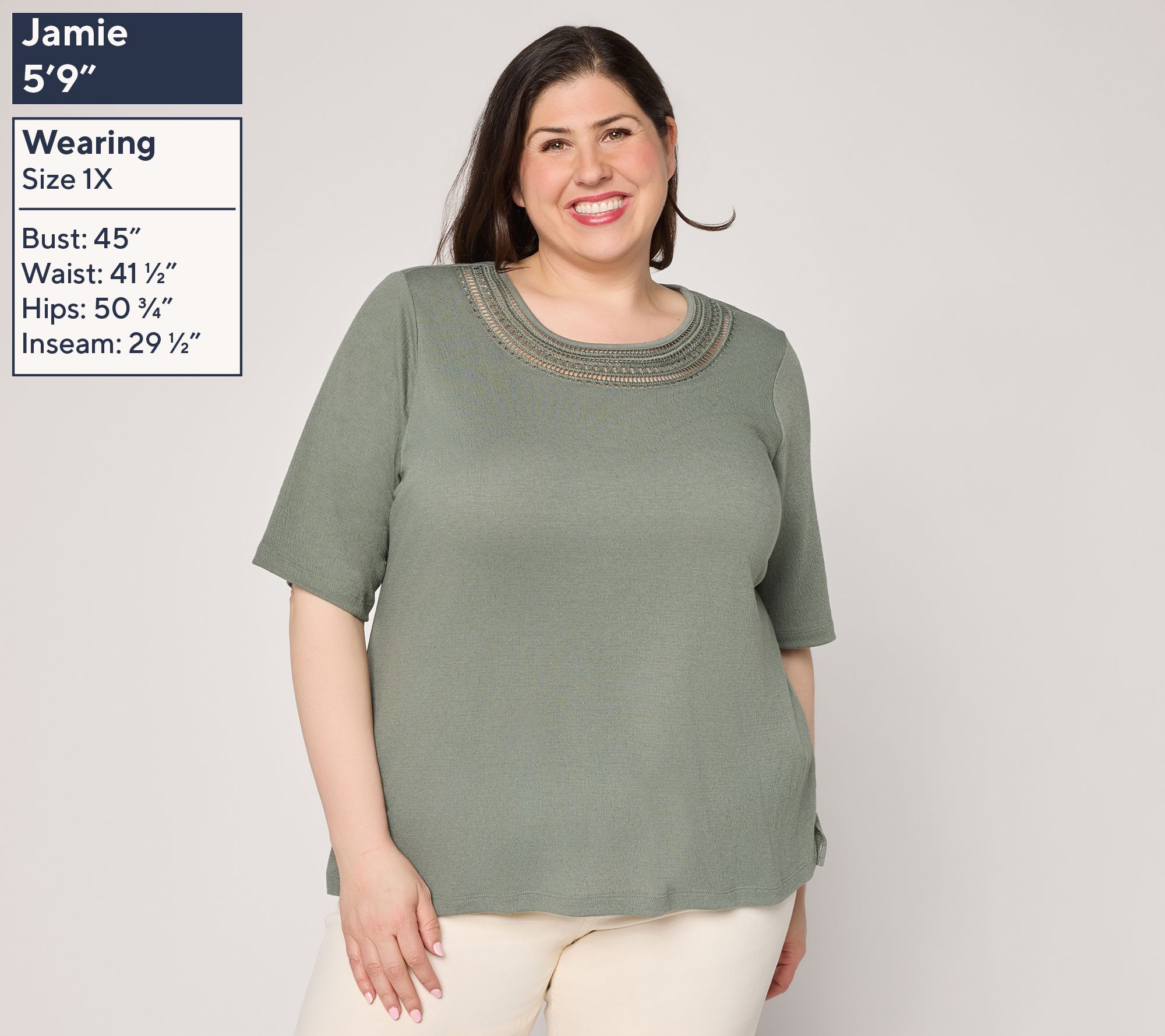 • Features: scoop neckline with top-applied crochet detail elbow-length sleeves, straight bottom hem, side slits