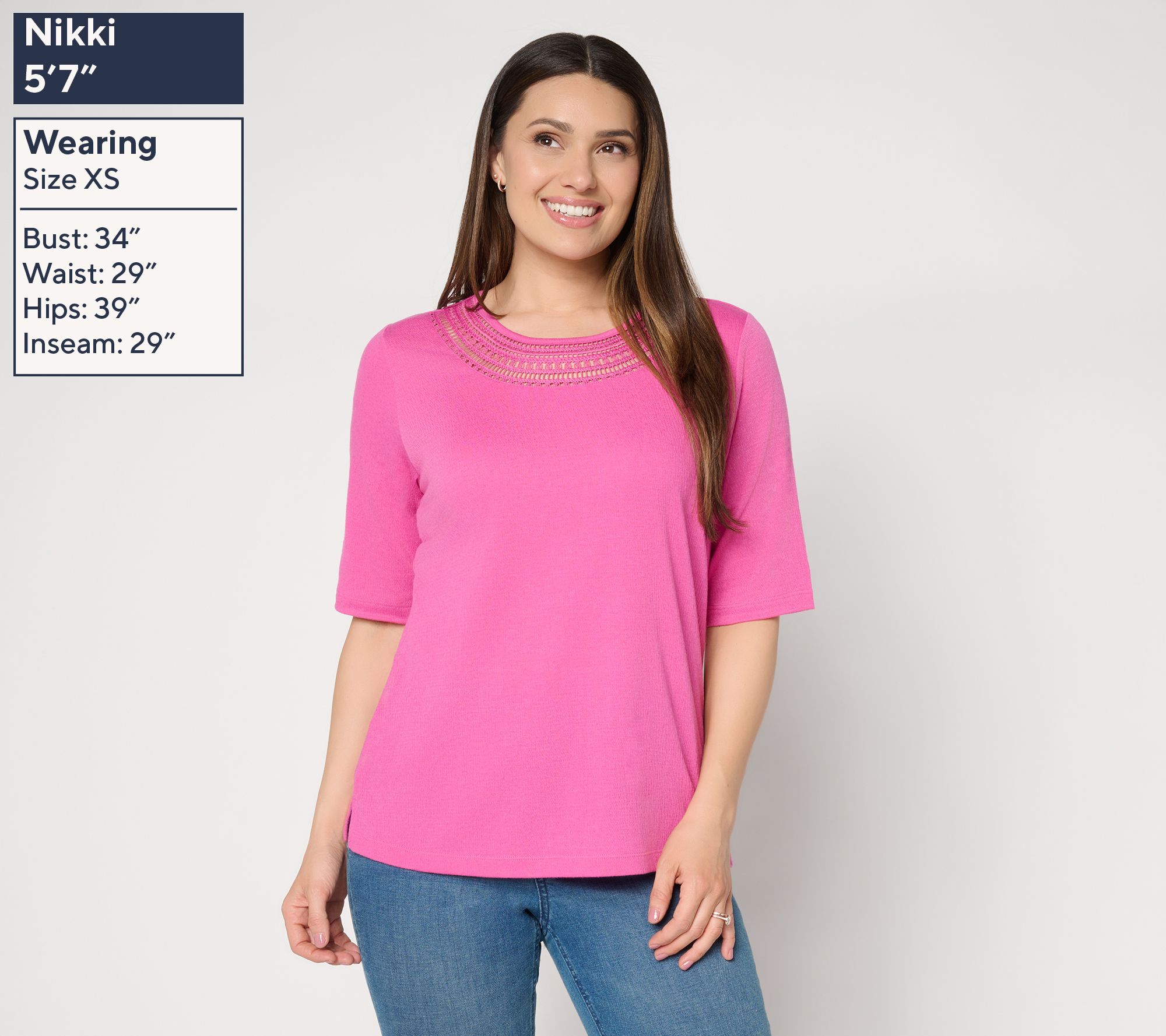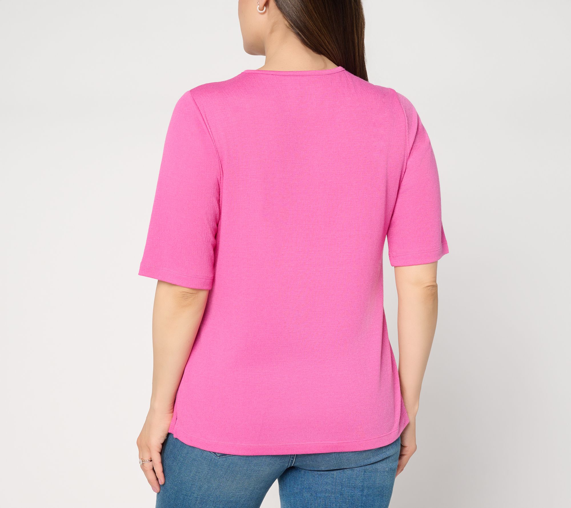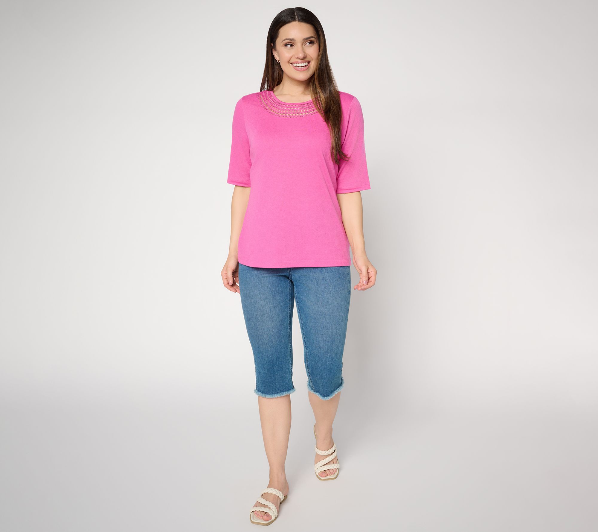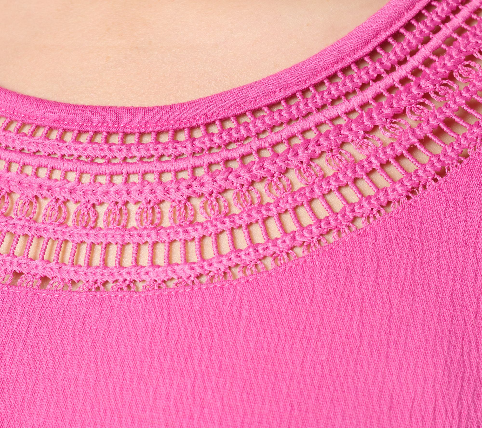 Sun-soaked strolls along the boardwalk or low-key lunches call for lightweight comfort -- and this knit gauze top is up to the task. Elbow-length sleeves allow for breezy feels while a hint of crochet at the neckline adds feminine charm. From Denim & Co.® Fashions.