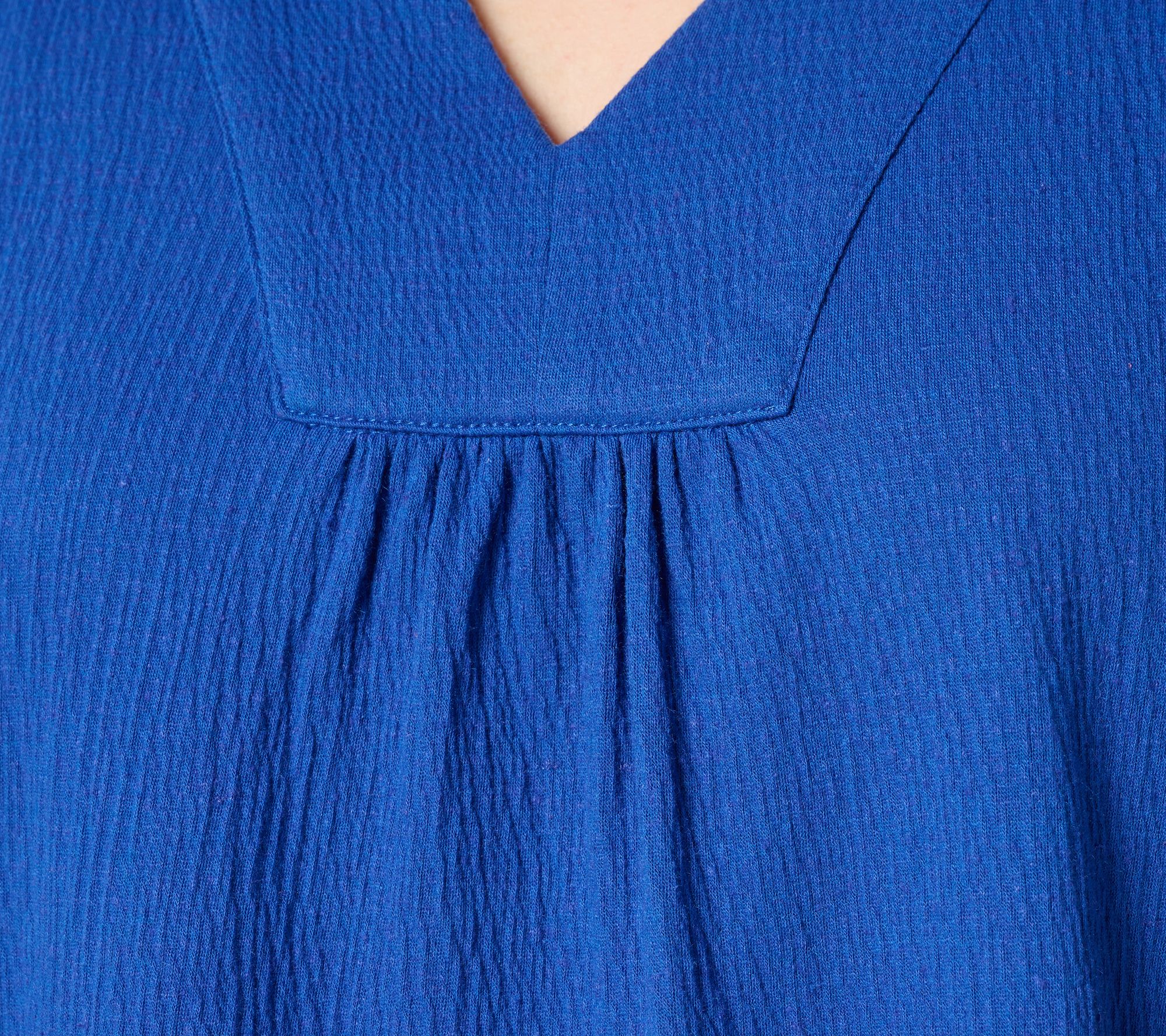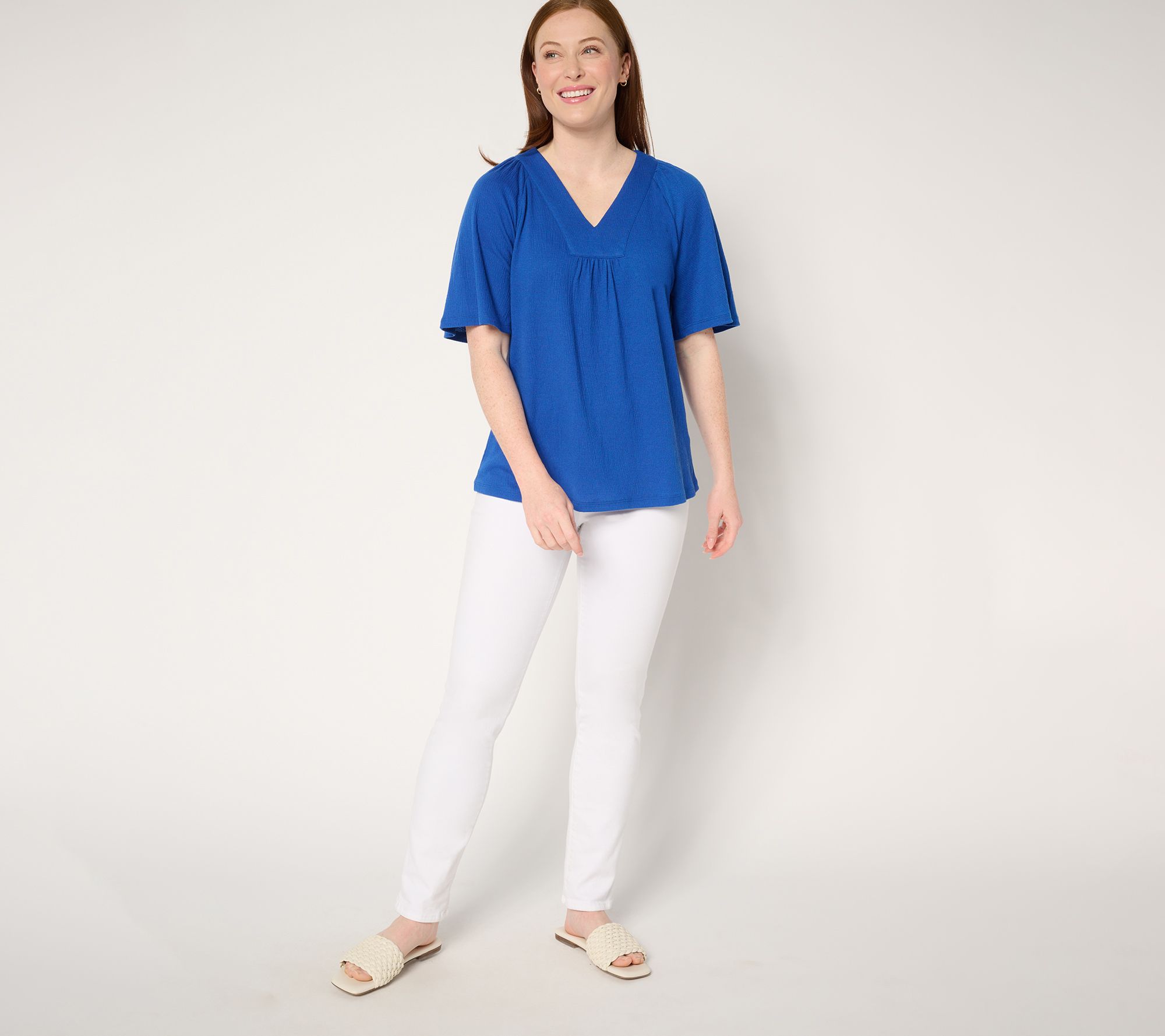 Add a breezy vibe to your weekend wardrobe with this knit gauze top. Elbow-length flutter sleeves and shirring at the shoulder and center front bust bring a playful touch to this light and airy separate (perfect for sun-soaked days!). From Denim & Co.® Fashions.