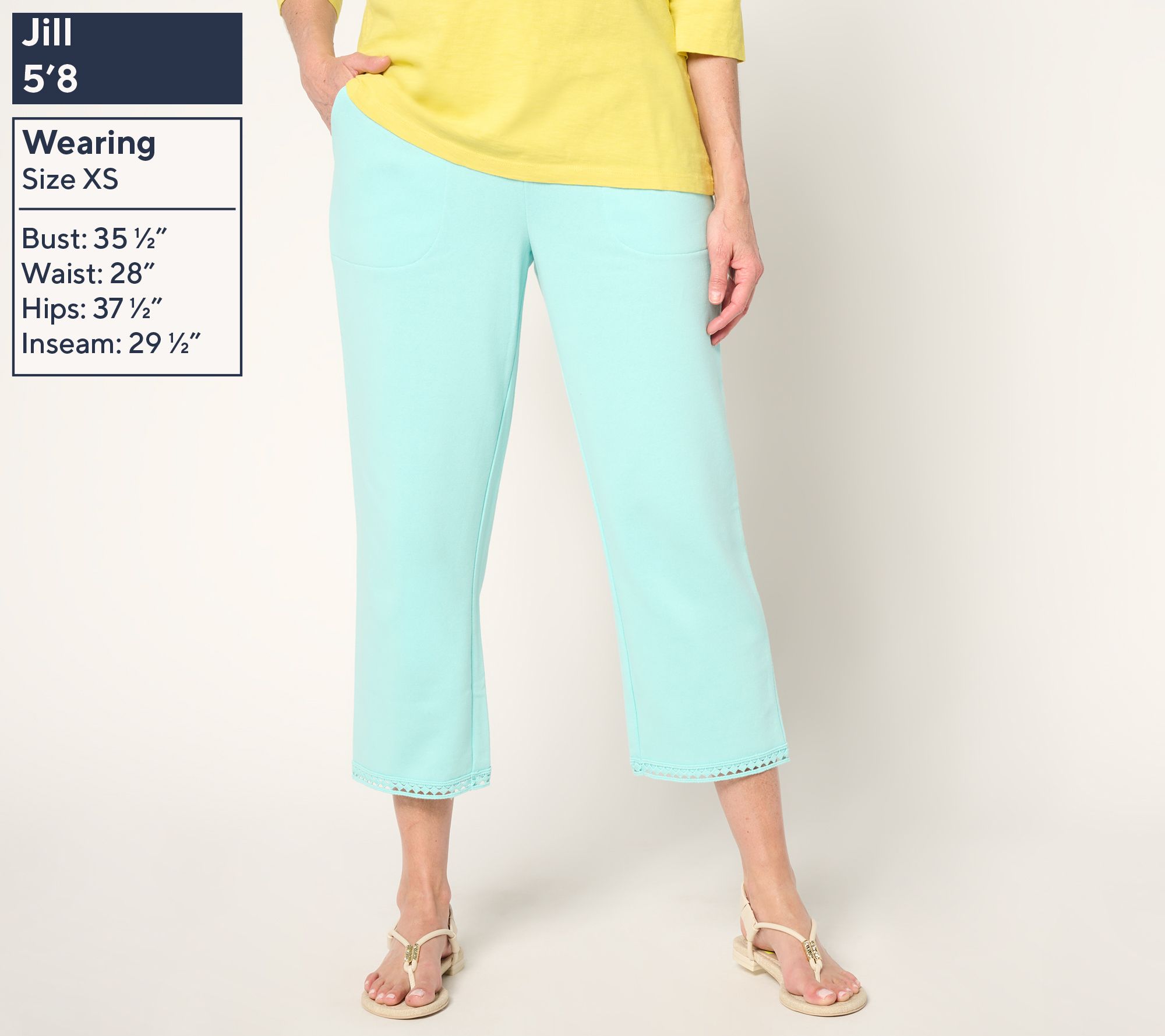 Features: pull-on pant, wide elastic waistband, front pockets, lace trim at hem, crop length