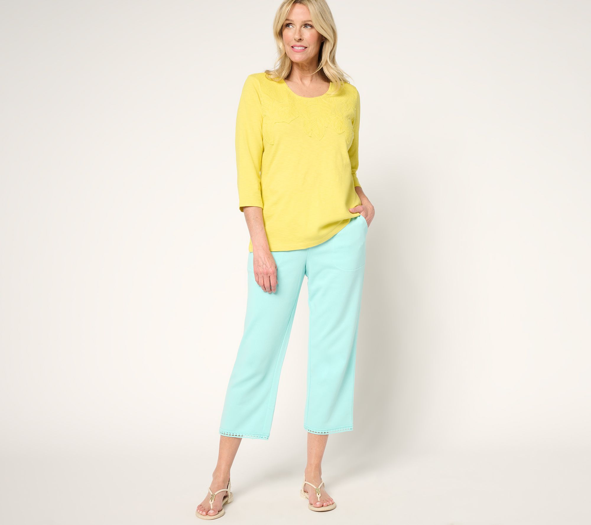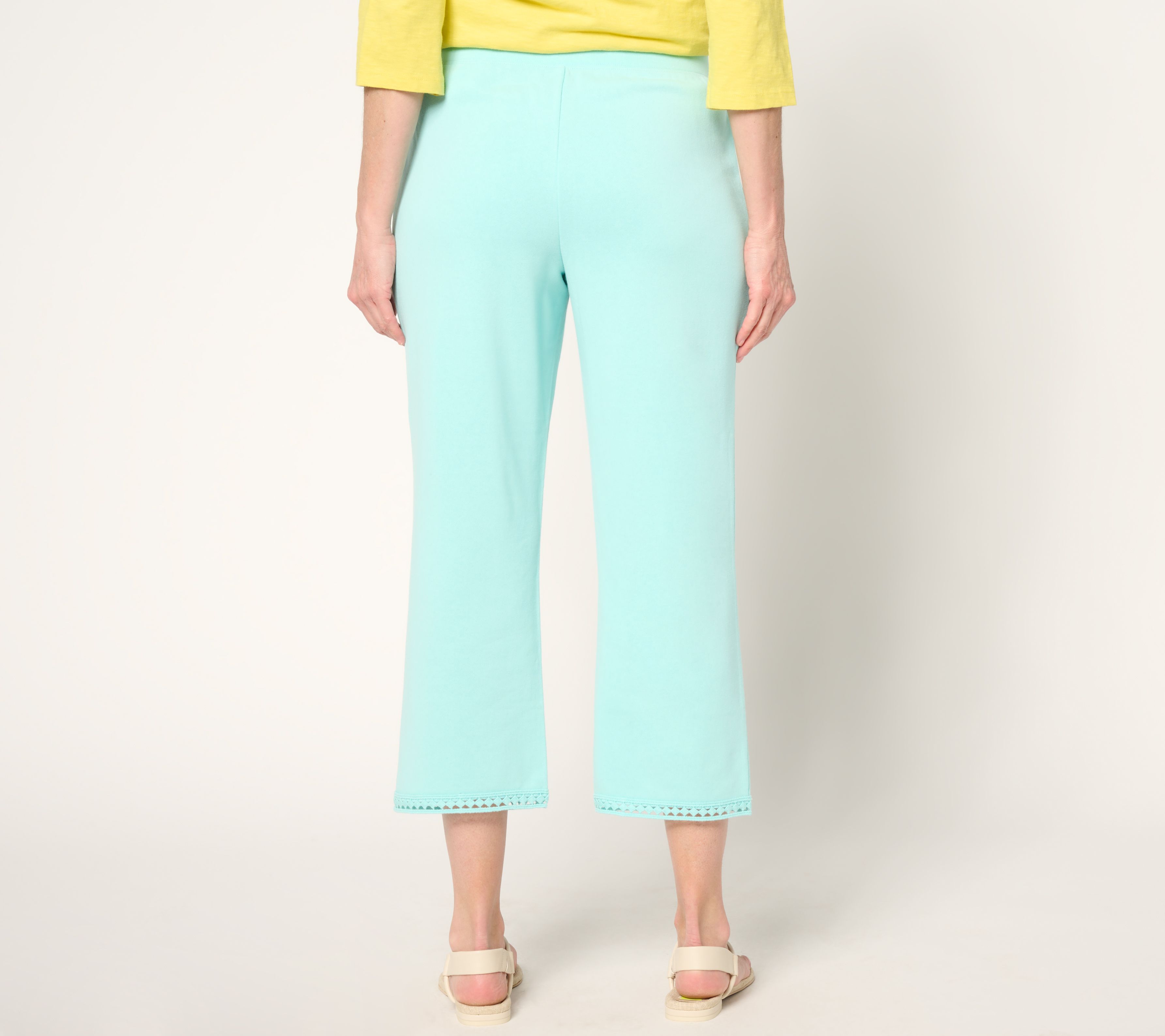 Transitioning from beach days to city strolls are a breeze with these chic knit crop pants in your summer closet. Featuring a playful lace trim at the hem, along with an easy pull-on design and practical front pockets, these straight-leg picks seamlessly swing from laid-back to dressed up -- with just a quick change of footwear. From Denim & Co.® Fashions.