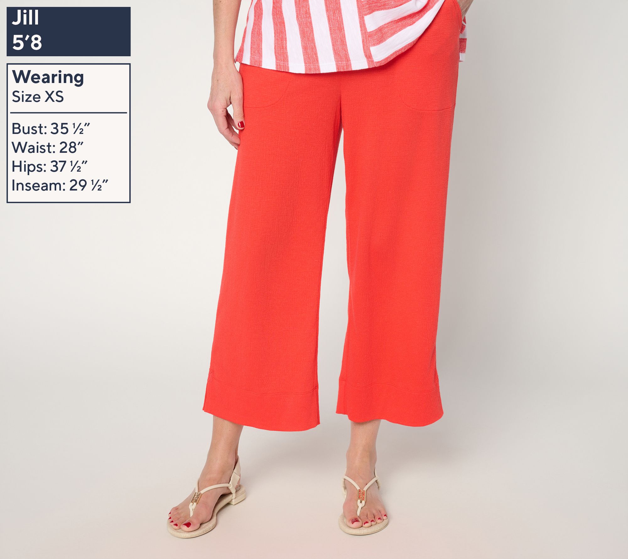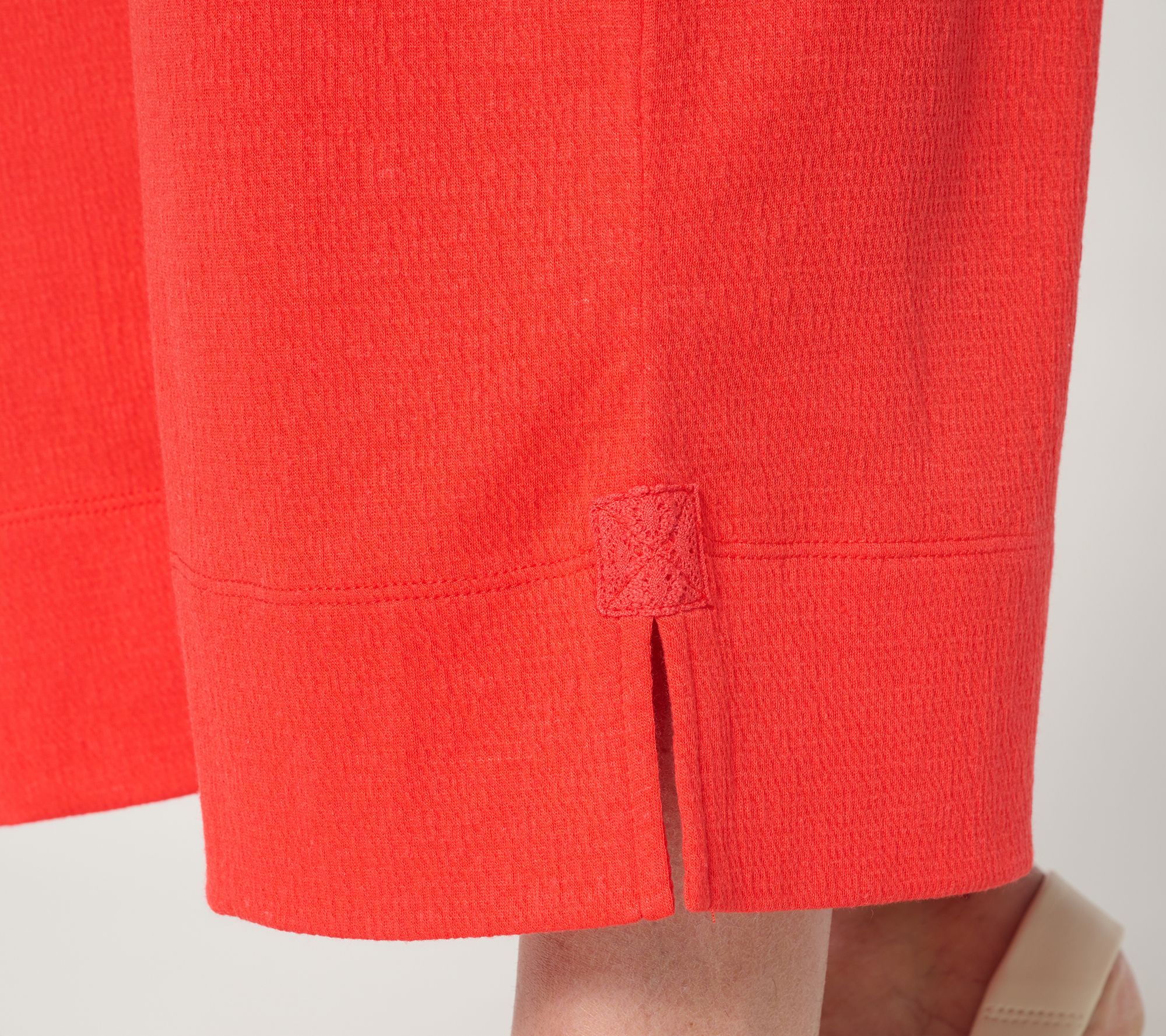 Features: elastic waistband, on-seam pockets with stitched-down pocket bags, straight bottom hemline with side slits, crochet overlay above side slit, crop length