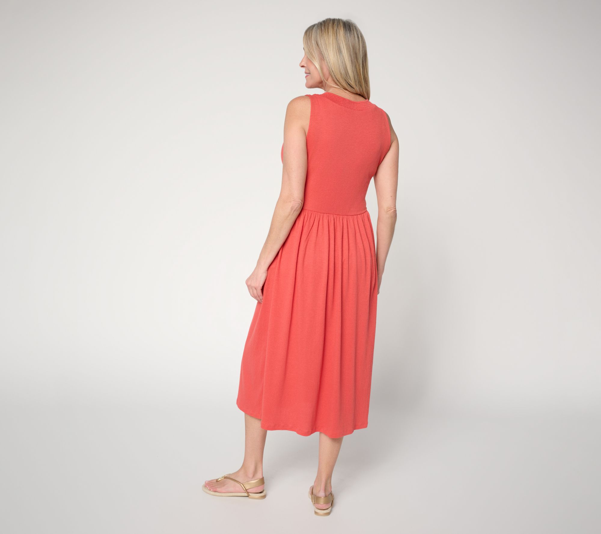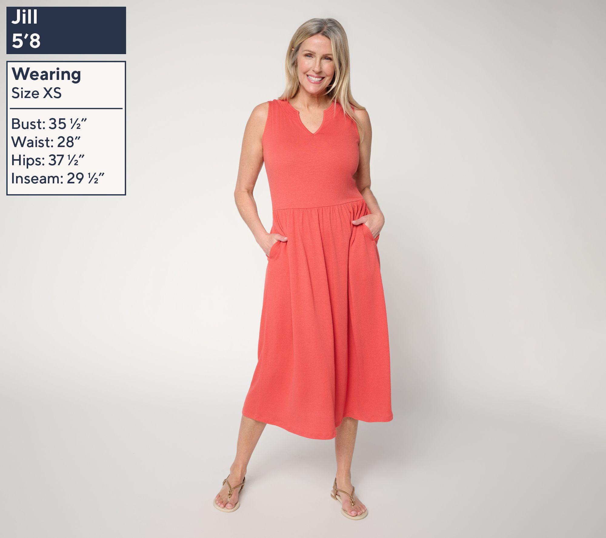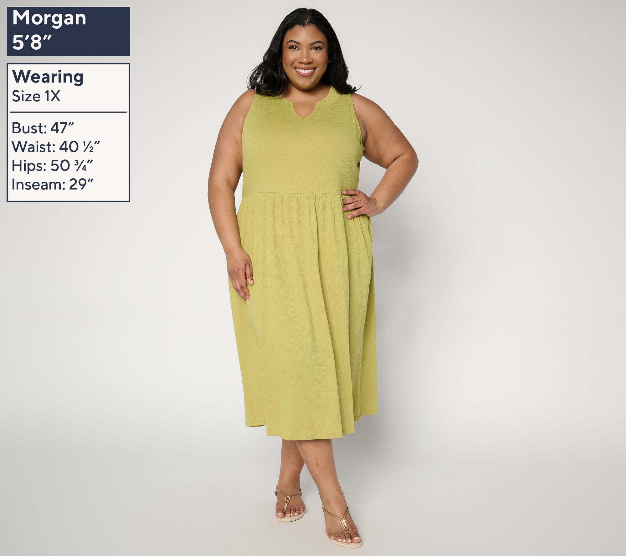 Get set for a summer social calendar like no other with this knit gauze midi dress ready to keep you stylish while making the rounds. The sleeveless design with a split V-neckline lends itself to layering, so when sunny days turn to cooler nights, just throw on a lightweight sweater or cozy cardigan and continue to mix and mingle. From Denim & Co.® Fashions.