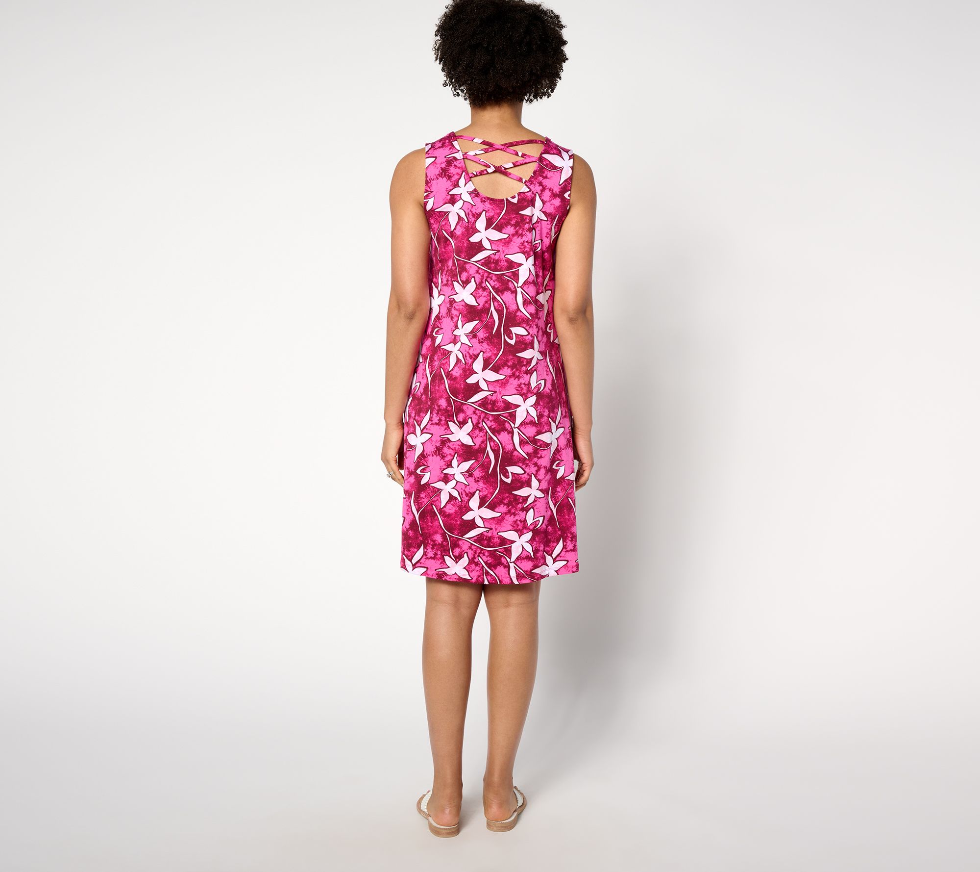 • Features: print, knee-length, tank-style dress with swing silhouette, crisscross detail at back, on-seam pockets