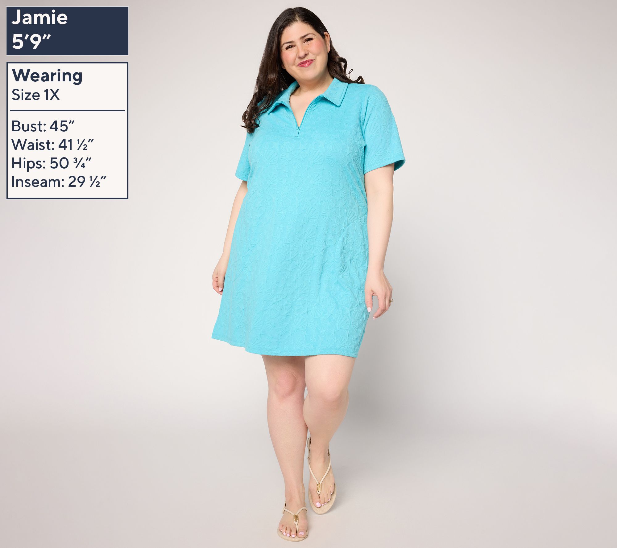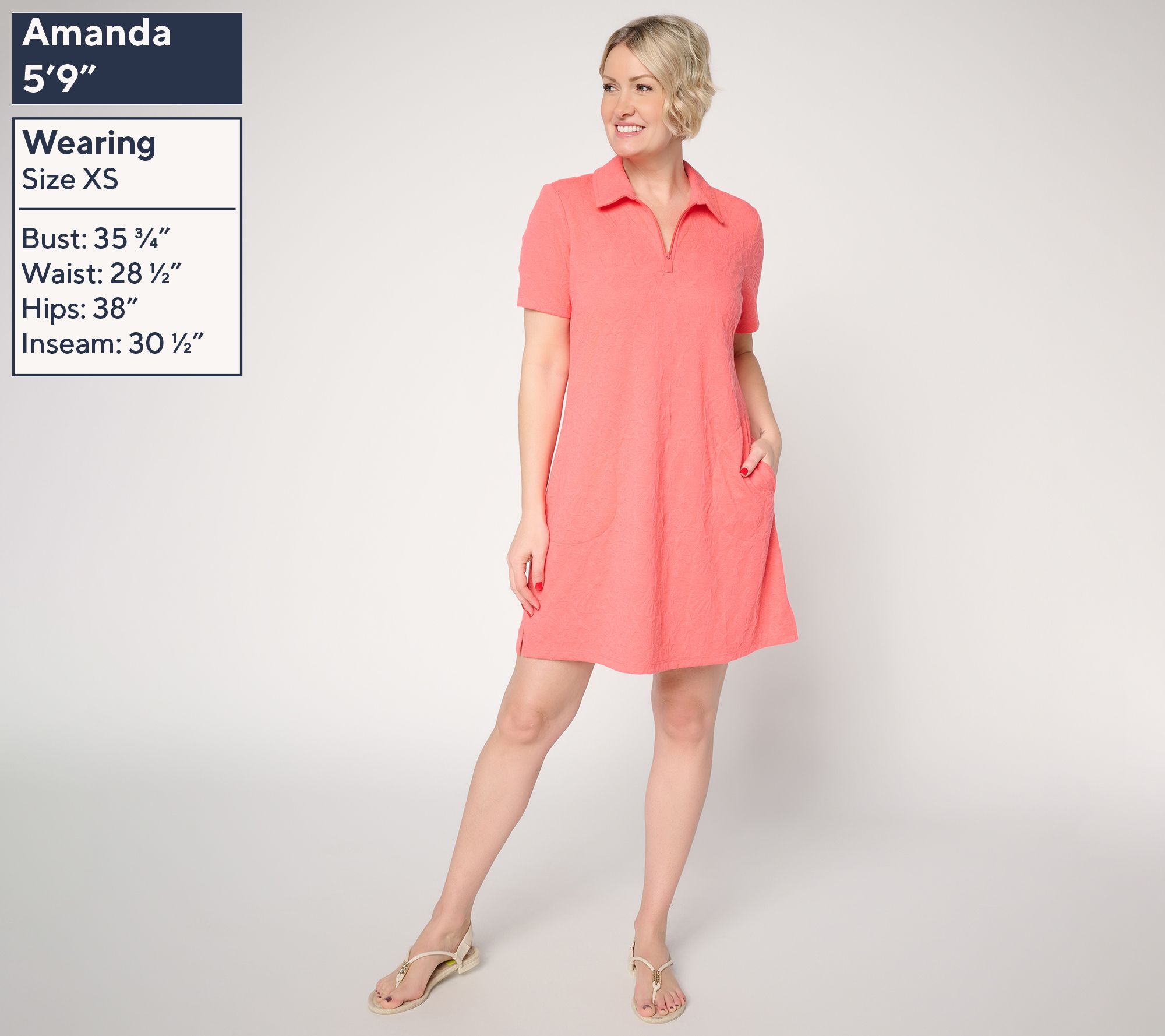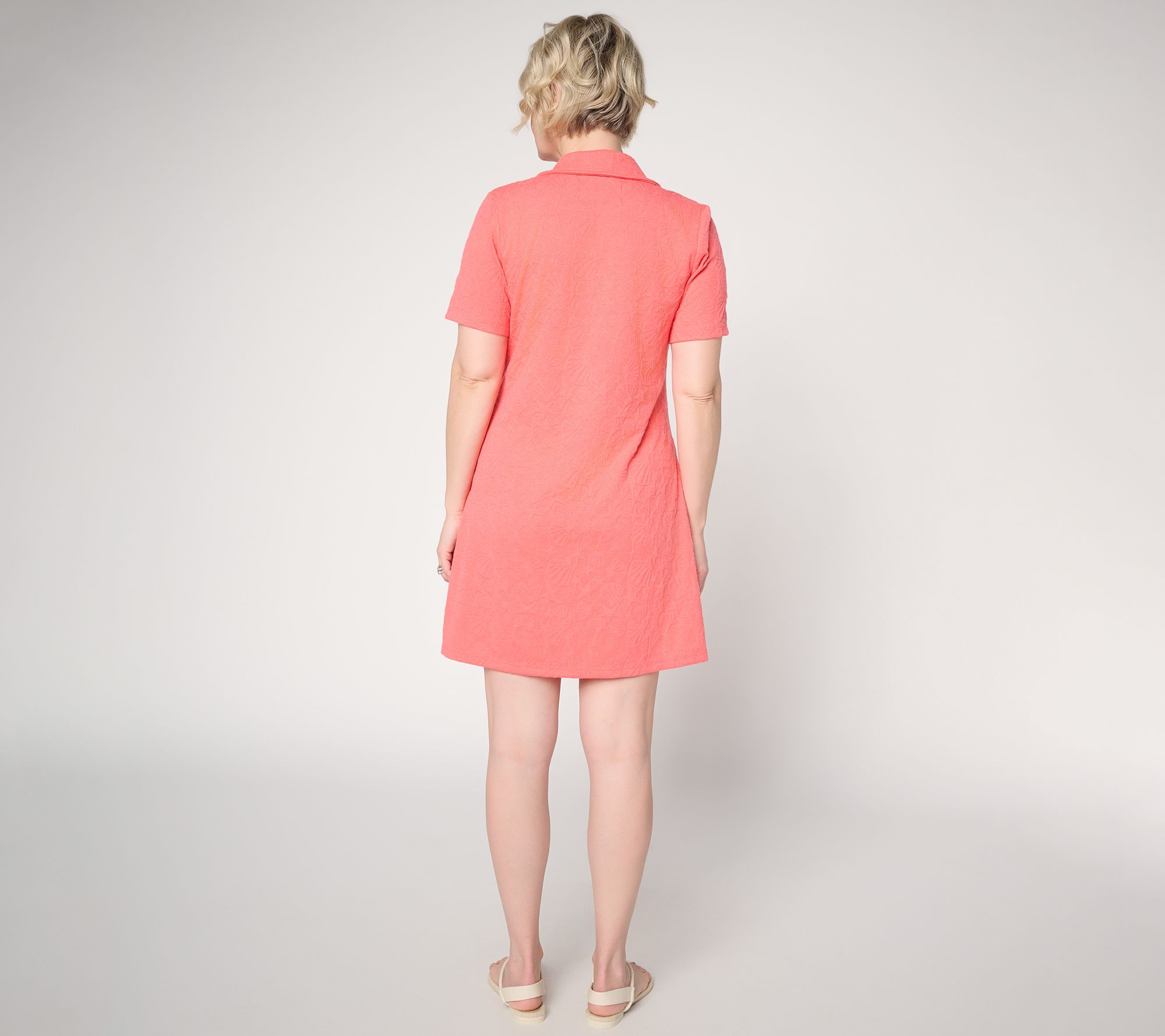 Sunny afternoons by the shore or a breezy boardwalk stroll call for a relaxed knit dress that feels right at home. Designed with a collared neckline, easy side pockets, and a playful seashell jacquard texture, this short cover-up slips on for drive-through mornings, lunch at the beach cafe, or unwinding after a swim. From Denim & Co.® Fashions.