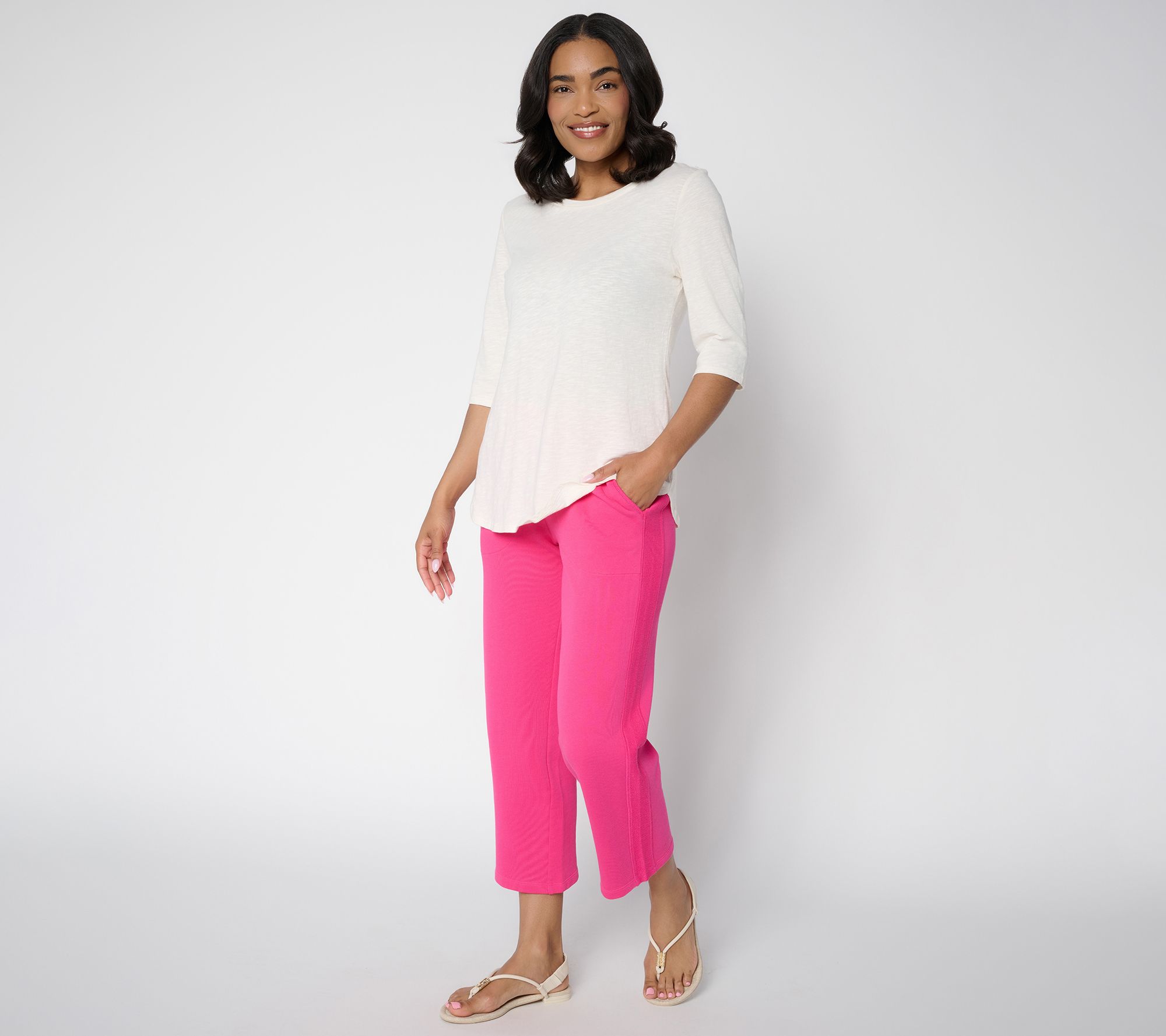 Whether you're strolling along the boardwalk or relaxing by the sea, these crop pants offer easy comfort and vacation-ready style. Soft knit fabrication and front pockets make every outing feel casual and breezy, while the straight-bottom leg opening adds a laid-back touch for warm-weather adventures. From Denim & Co.® Fashions.
