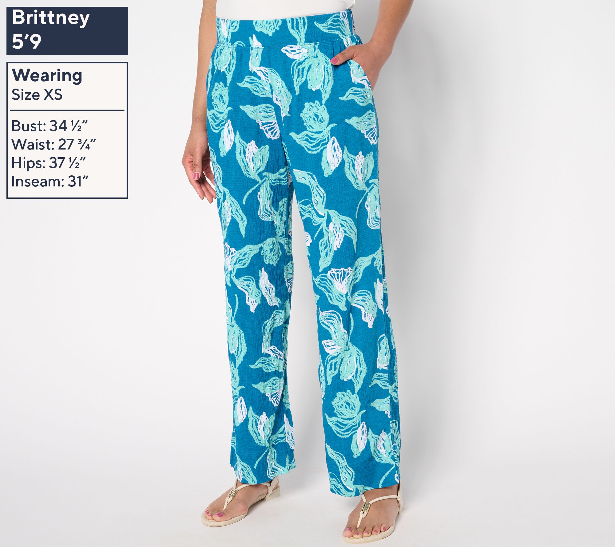 Features: allover leaf print, pull-on style, flat front waistband with encased elastic at back, front slash pockets, wide hem with side slit/button and loop closure detail, full length