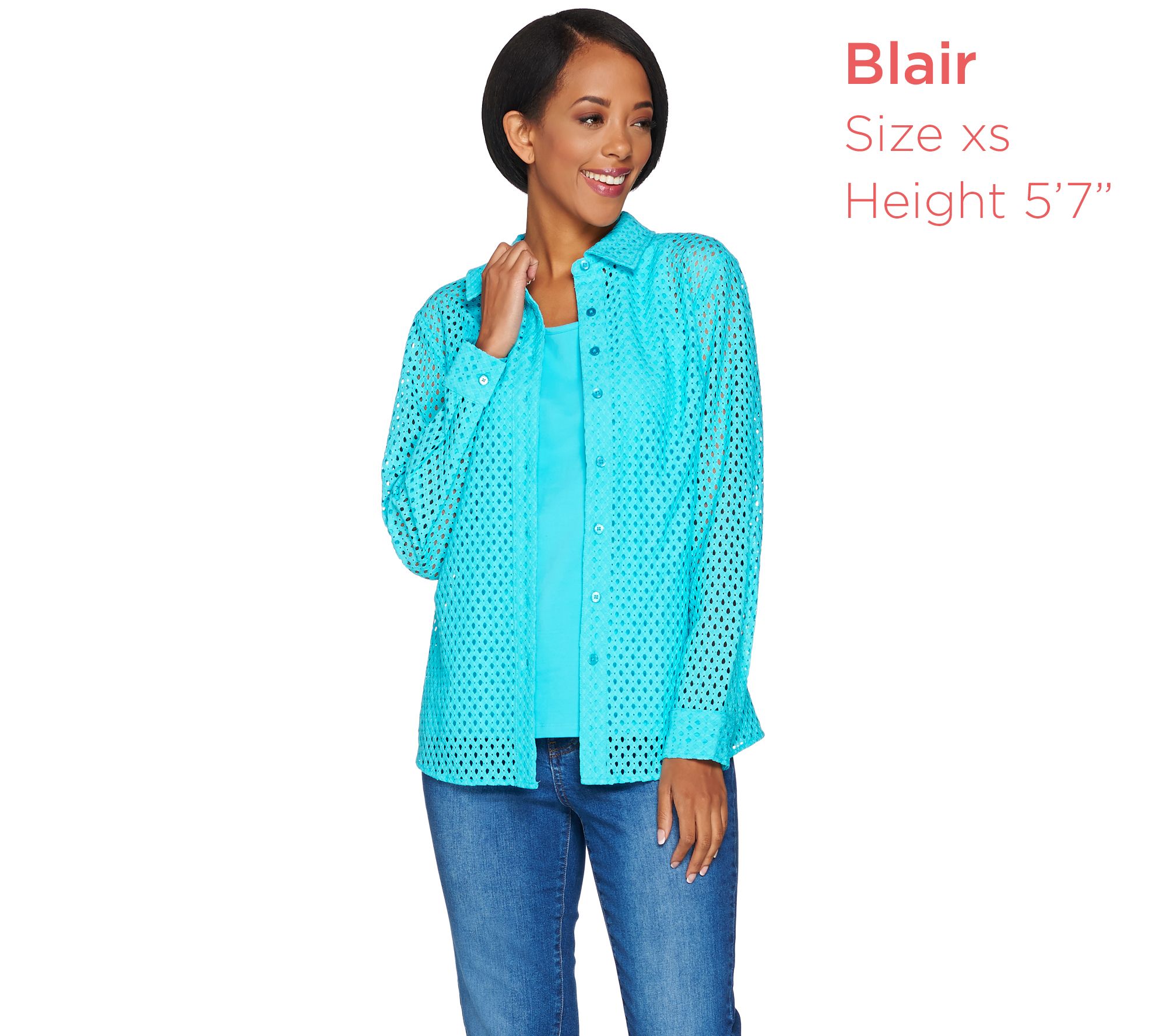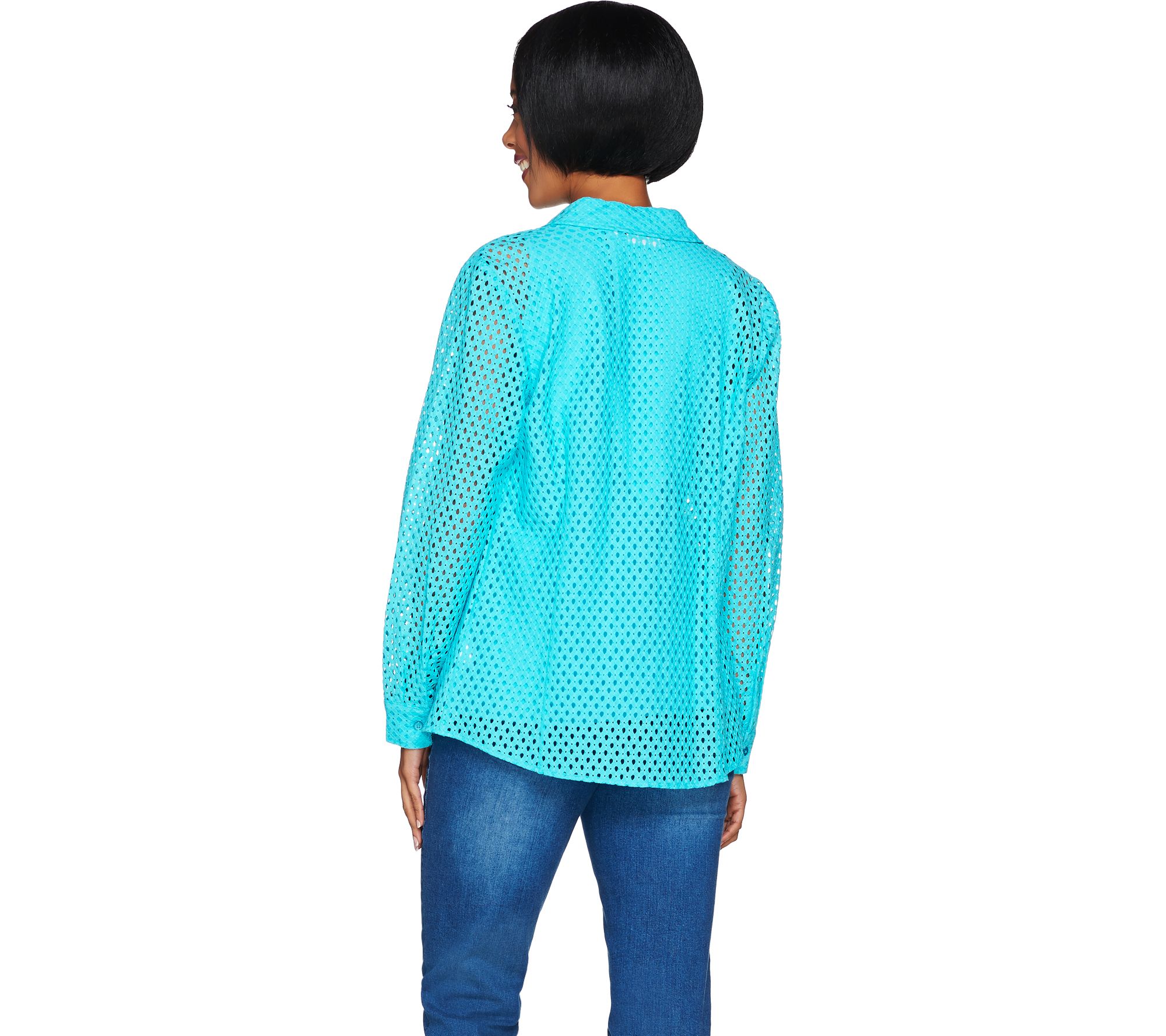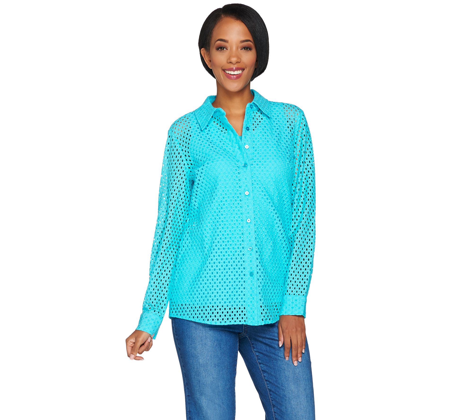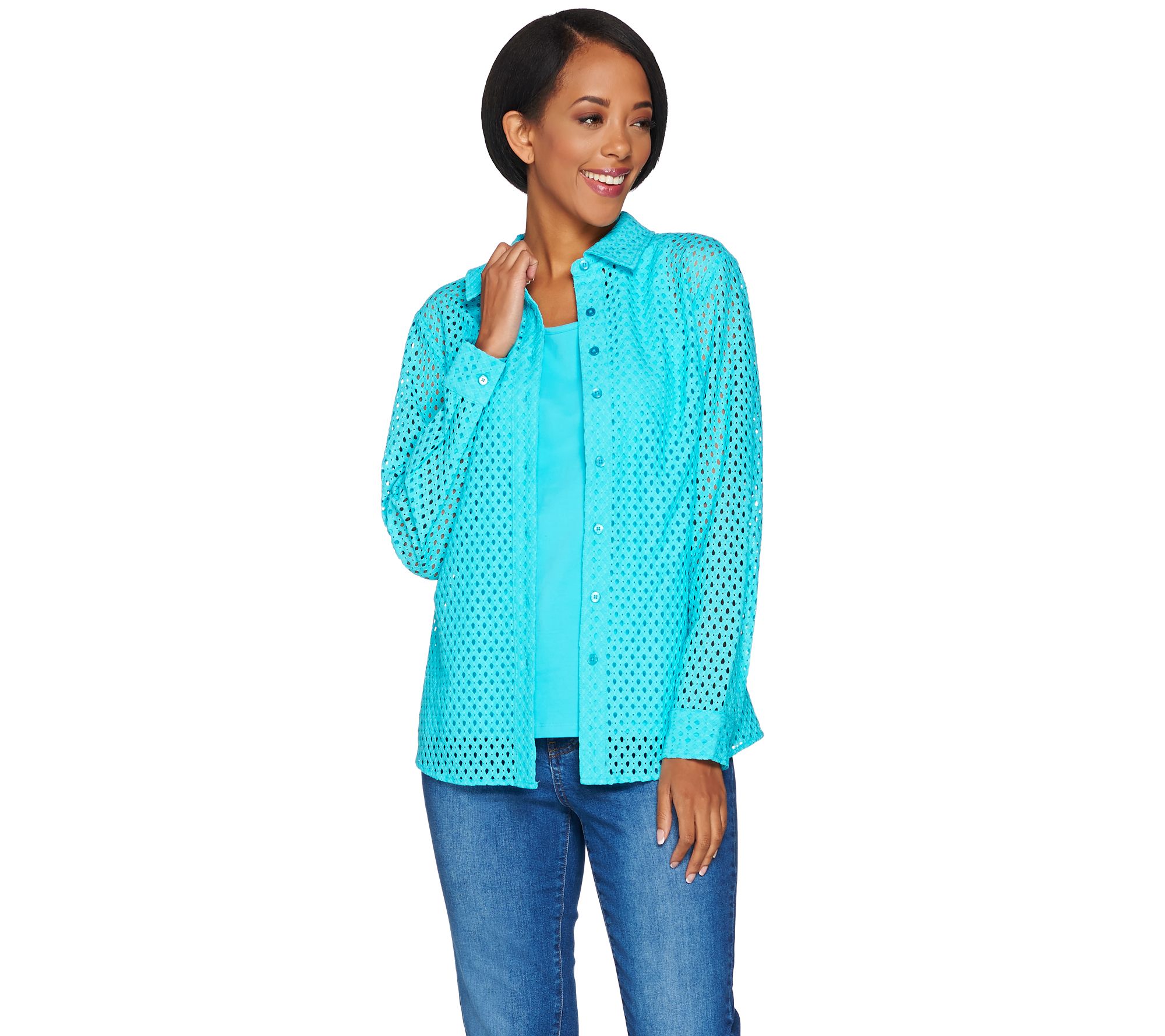 Denim & Co, set. Knit Tank: scoop neck, sleeveless. Shirt: eyelet, button front closure, long sleeve, collar. Semi-Fitted(TANK):Follows the lines of the body w/added wearing ease. Relaxed-Fit(SHIRT):Generously cut w/maximum wearing ease.____________ Length:TANK:Missy Range:24 1/2"-26 5/8".Plus Range:27"-28 3/4". SHIRT:Missy Range:27"-29 1/8". Plus Range: 29 1/2"-31 1/4". Cntnt:SHIRT:54% Cttn/46% Nylon,TANK:95% Cttn/5% Spndx.Care:SHIRT: MWC/GC/WS/ONCBWN/TDL/LIIN.TANK:MWC/GC/WS/ONCBWN/TDL/WIIN.Imported.(S).