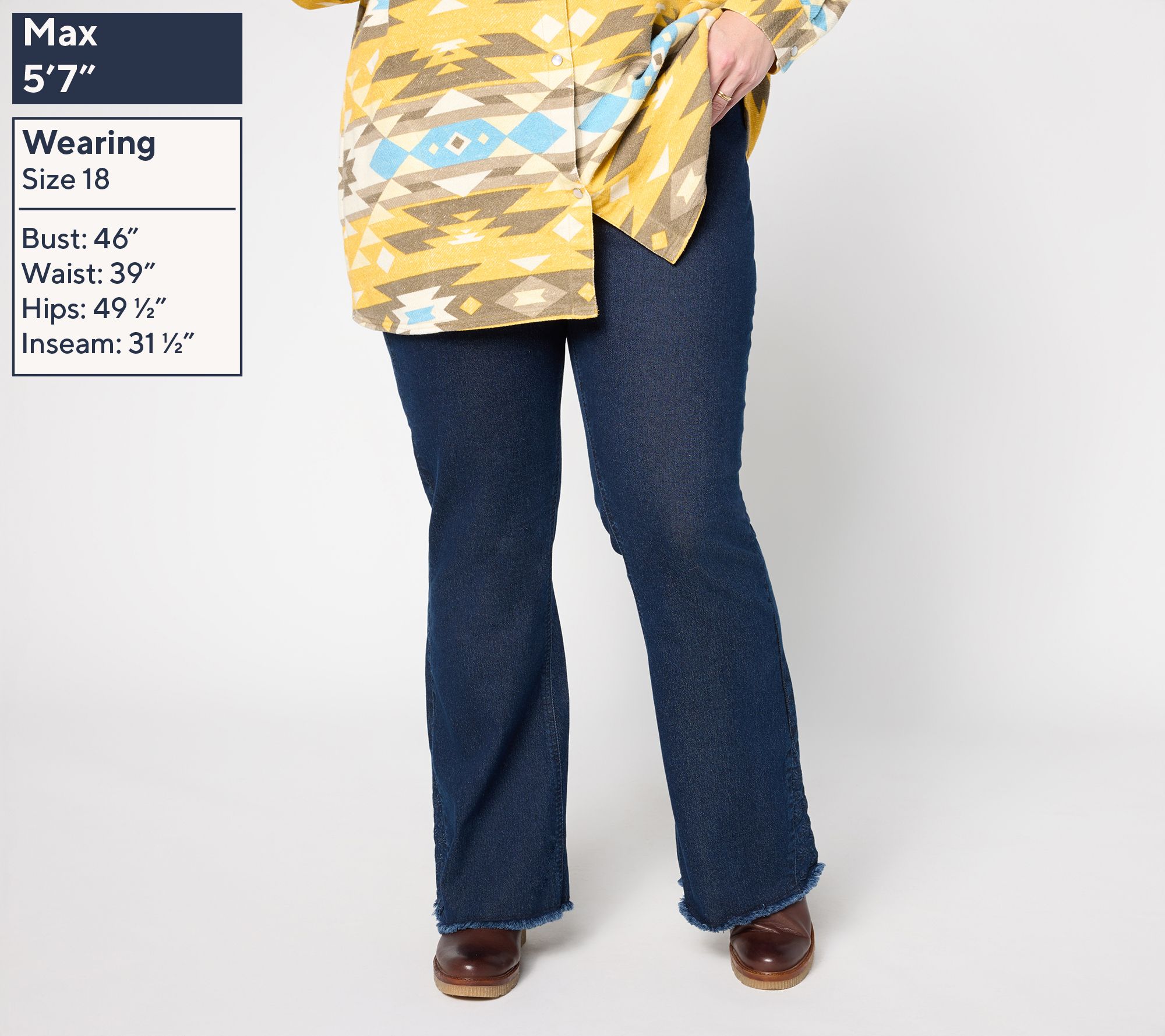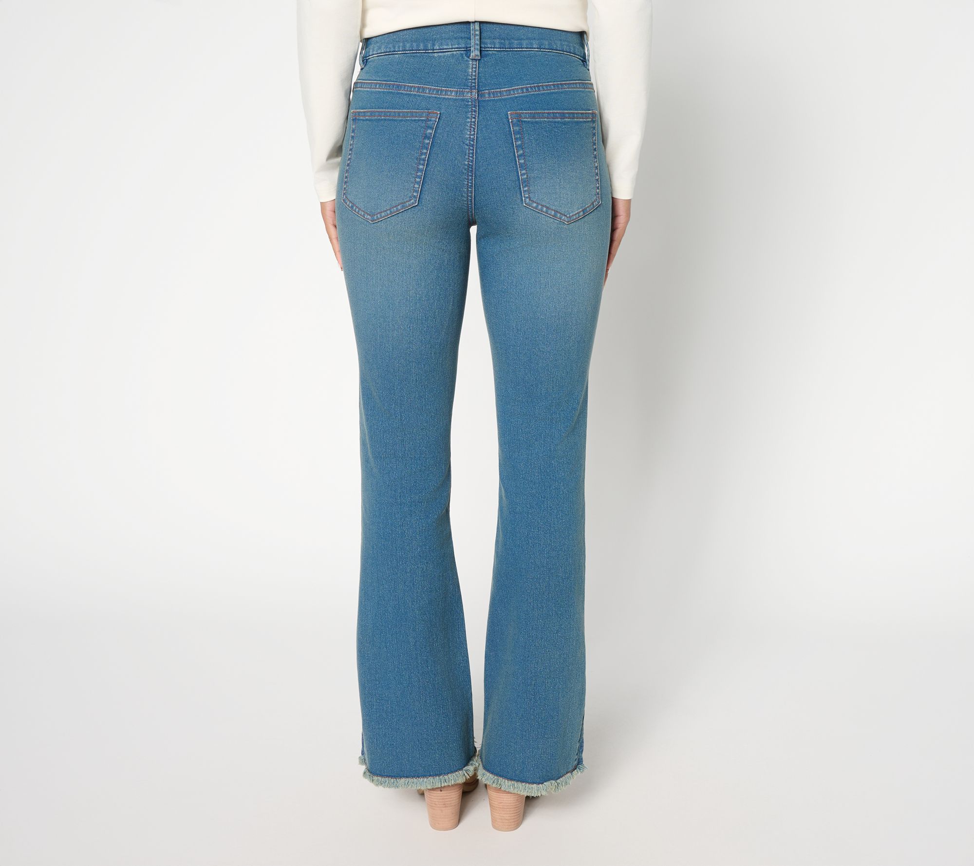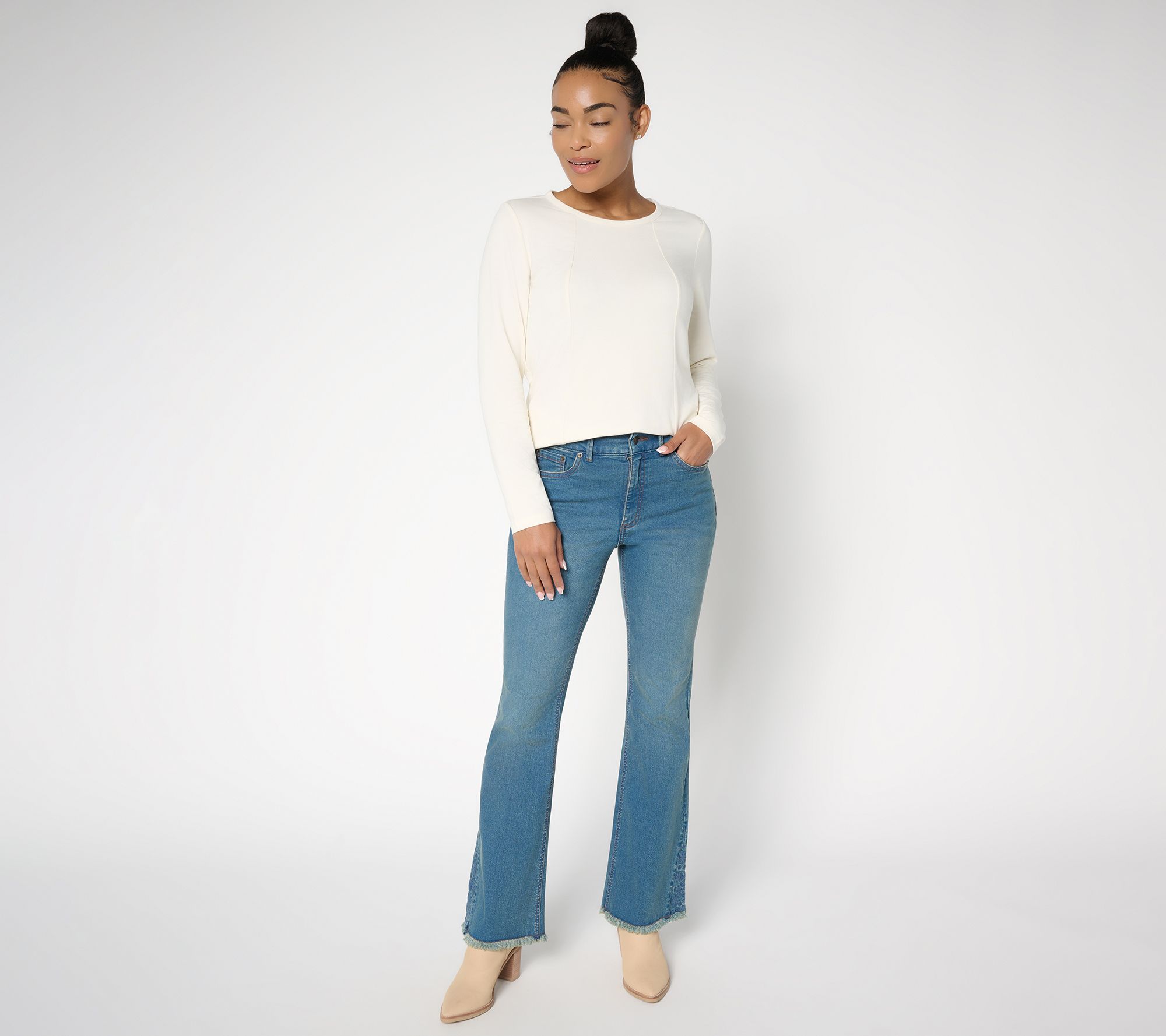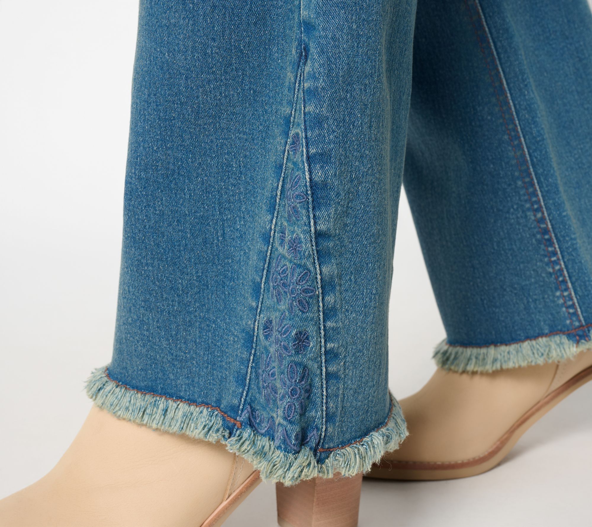 From sunset strolls to weekend trips, these boot-cut jeans work a Western moment into every style sitch. Eyelet godets and raw hems add a helping of flair -- 'cause it's not your first denim rodeo. From Denim & Co.® Fashions.