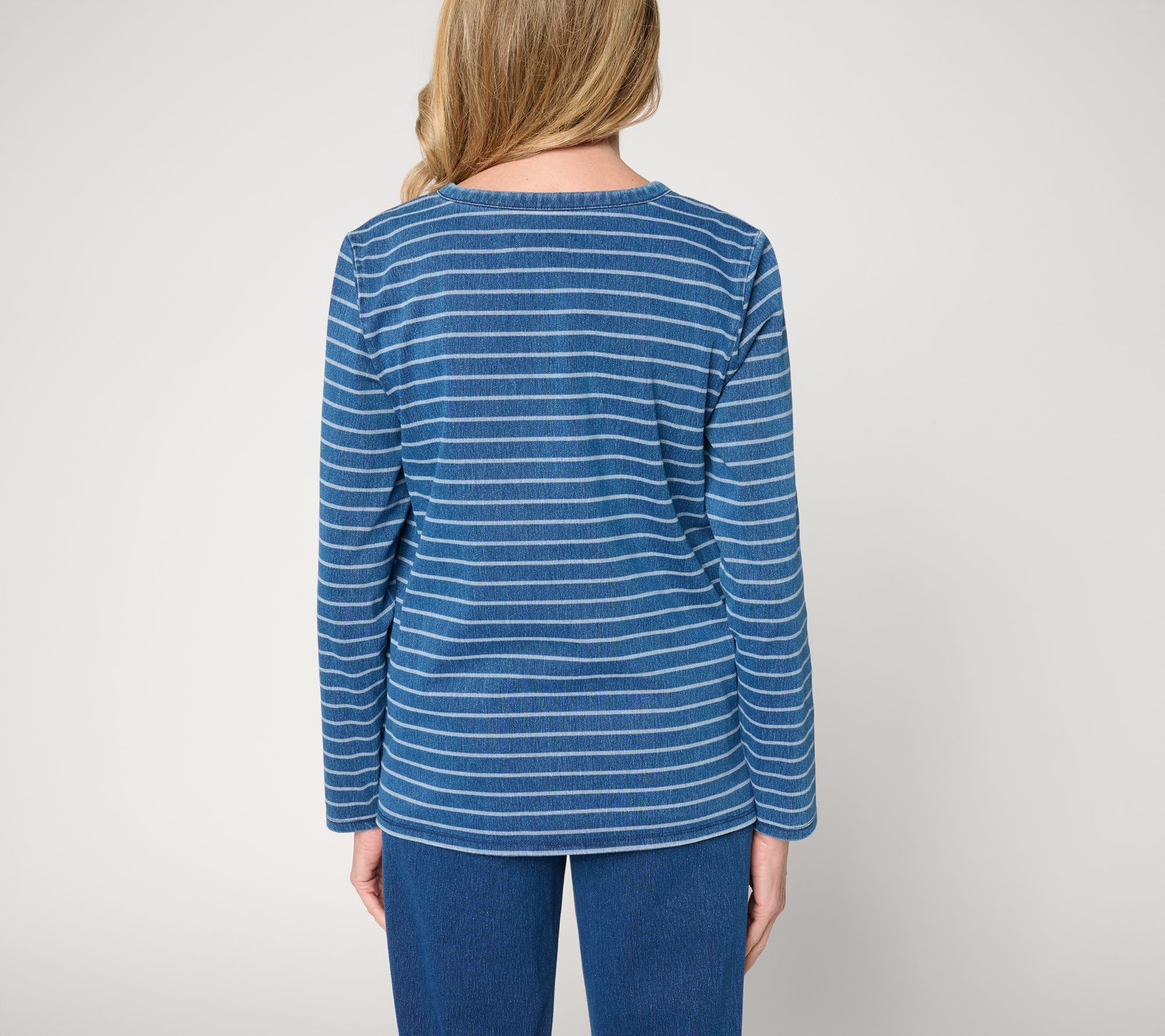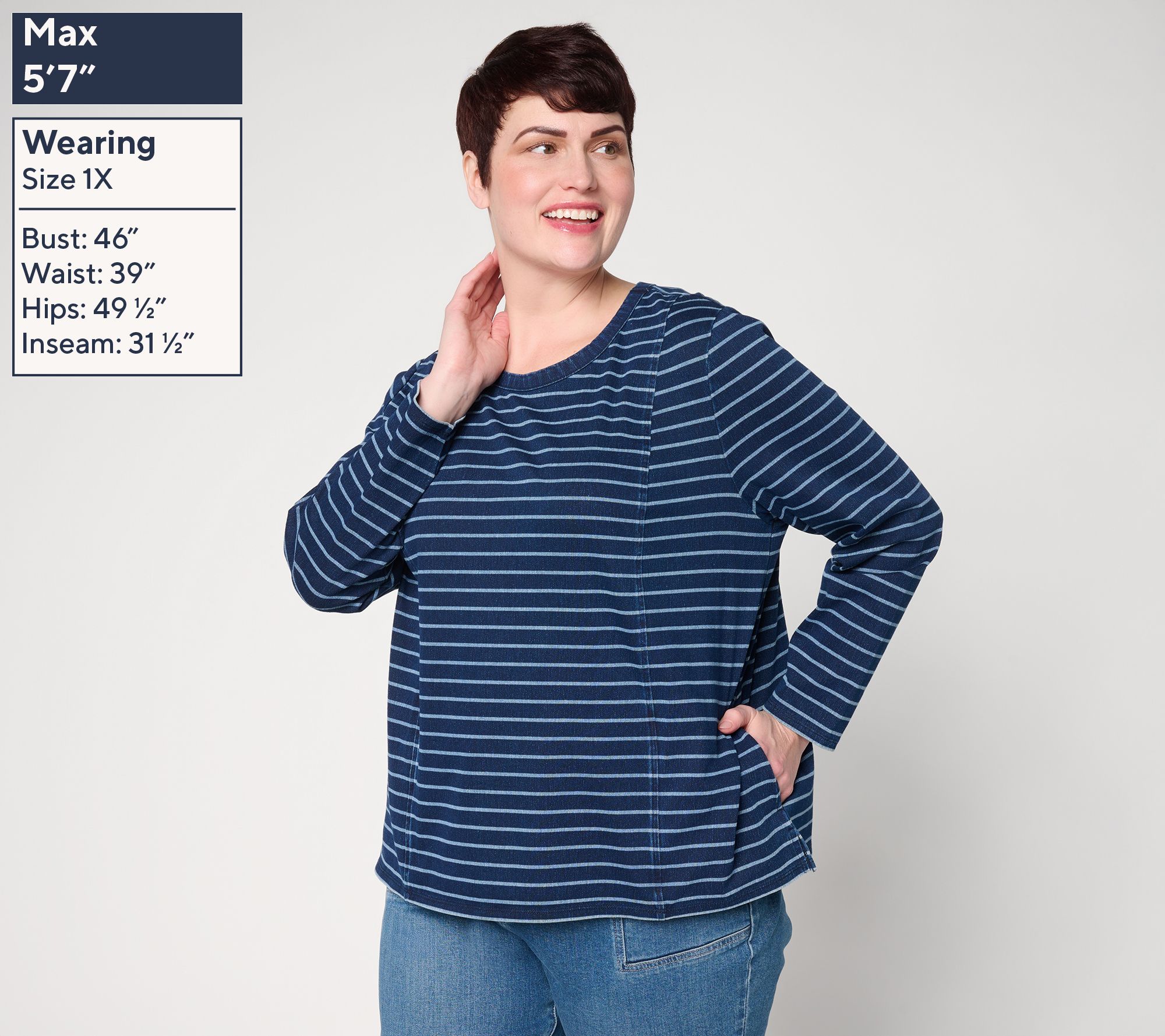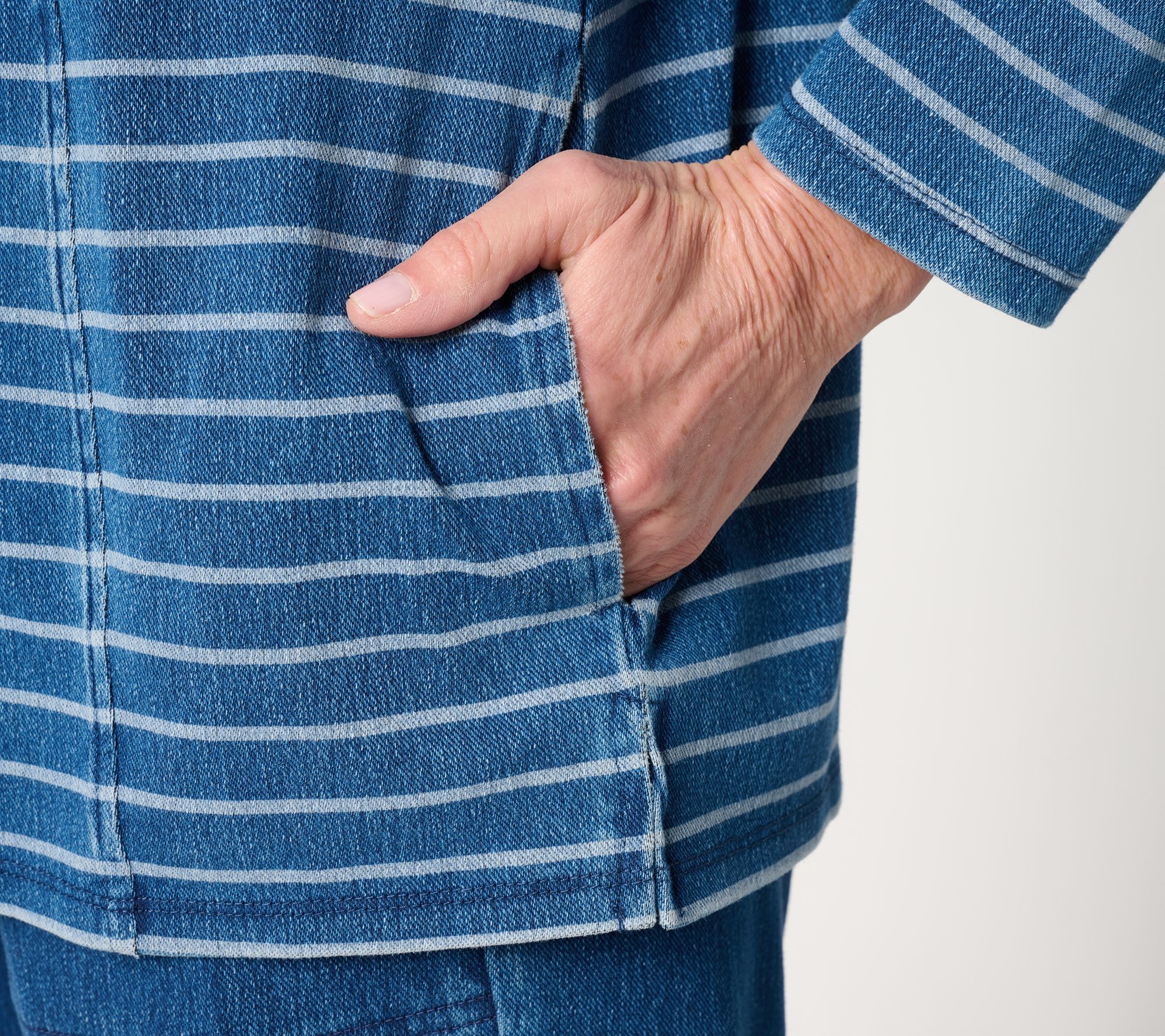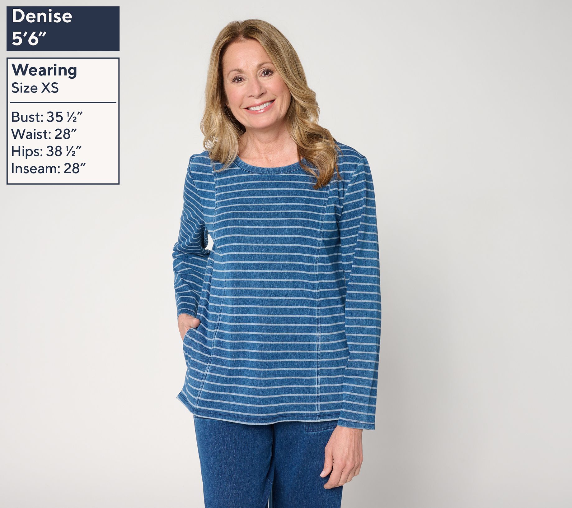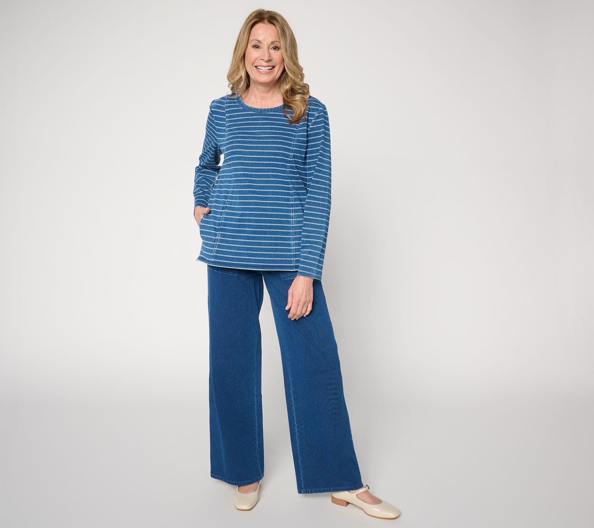 A go-to choice for casual days, this striped knit top pairs soft comfort with functional style thanks to its easy-moving stretch and handy side-seam pockets. Dressed up with jeans or tossed over leggings, the long sleeves and straight hemline lend coverage and versatility for relaxed weekday outings or weekend errands. From Denim & Co.® Fashions.