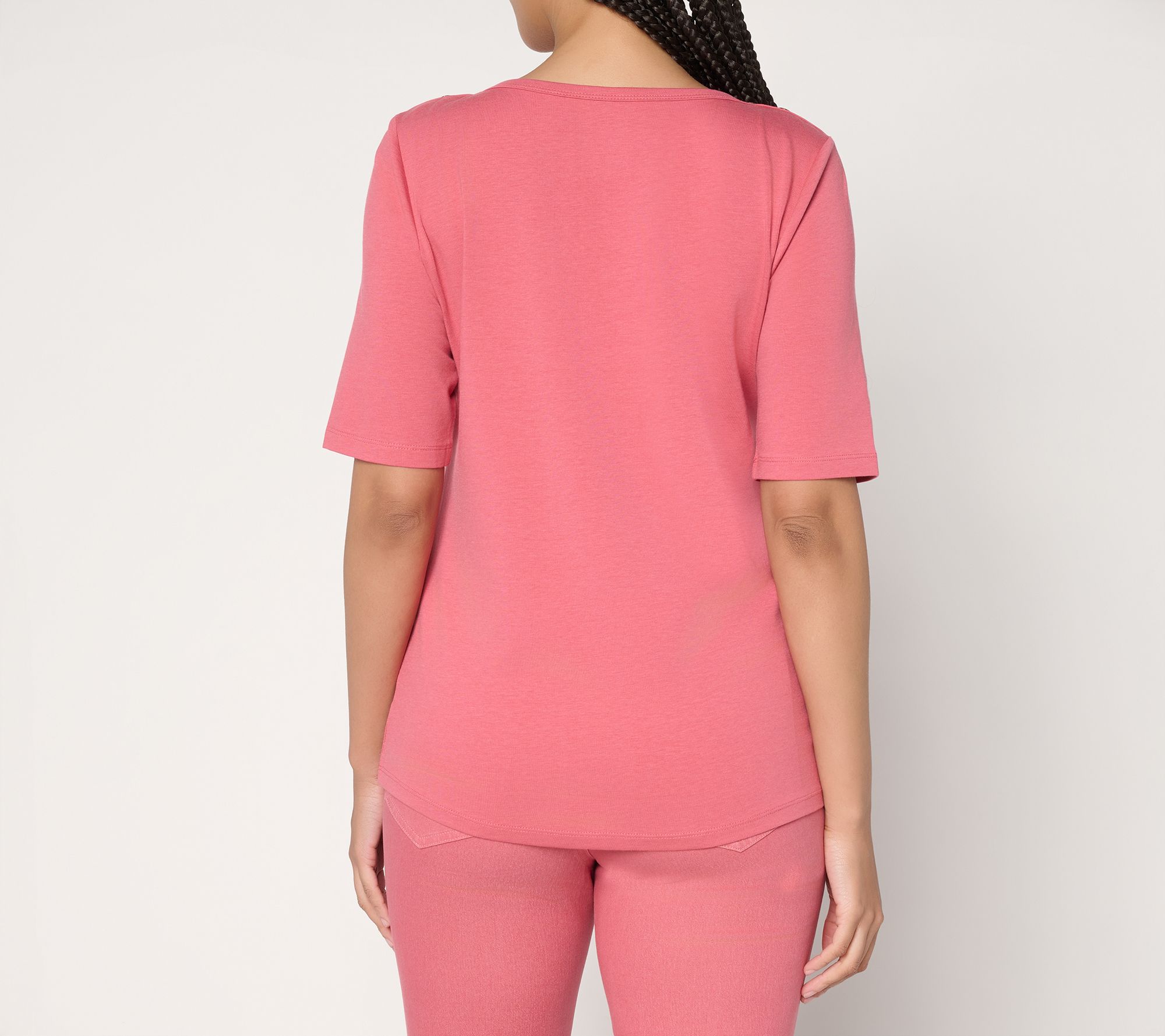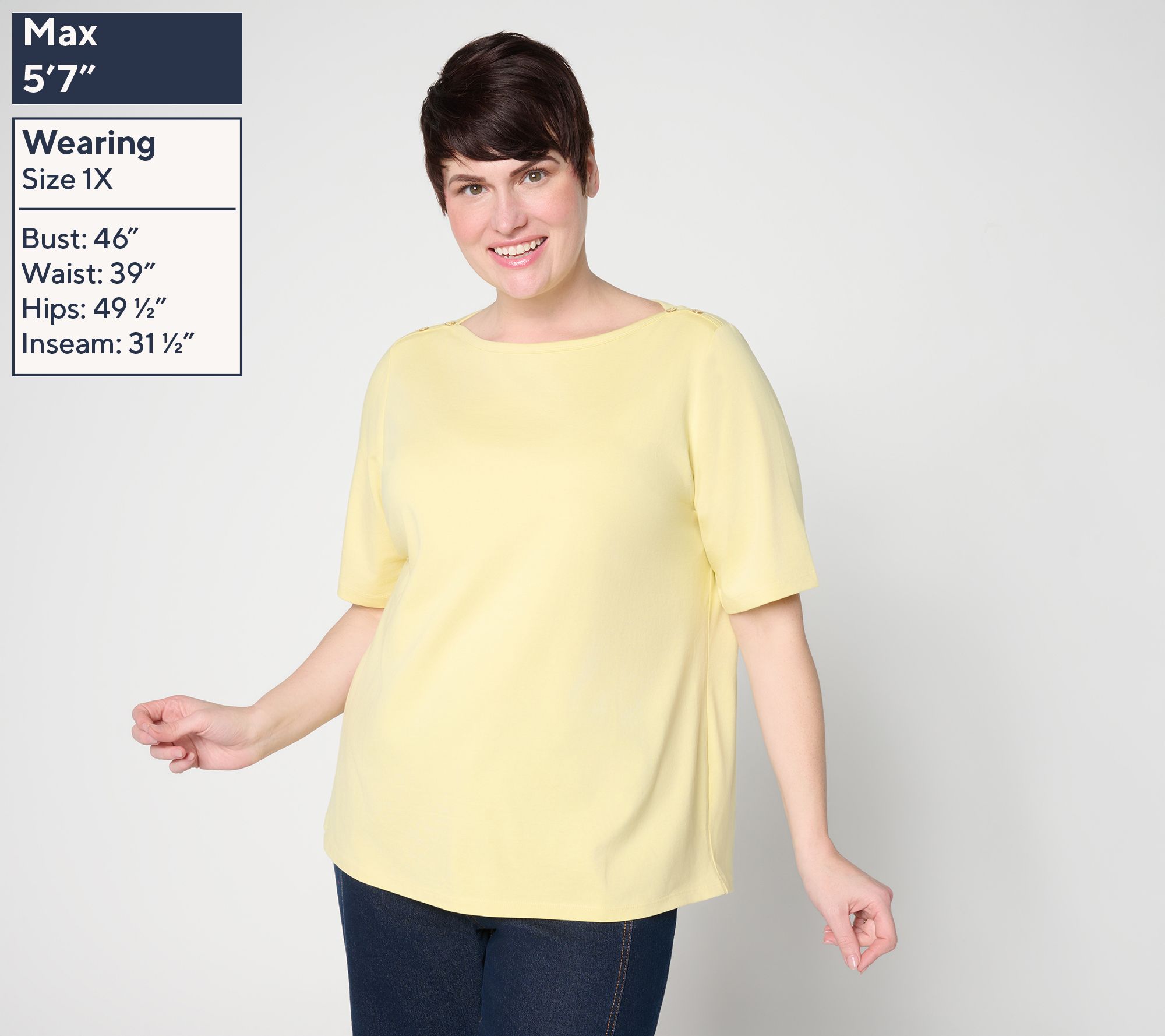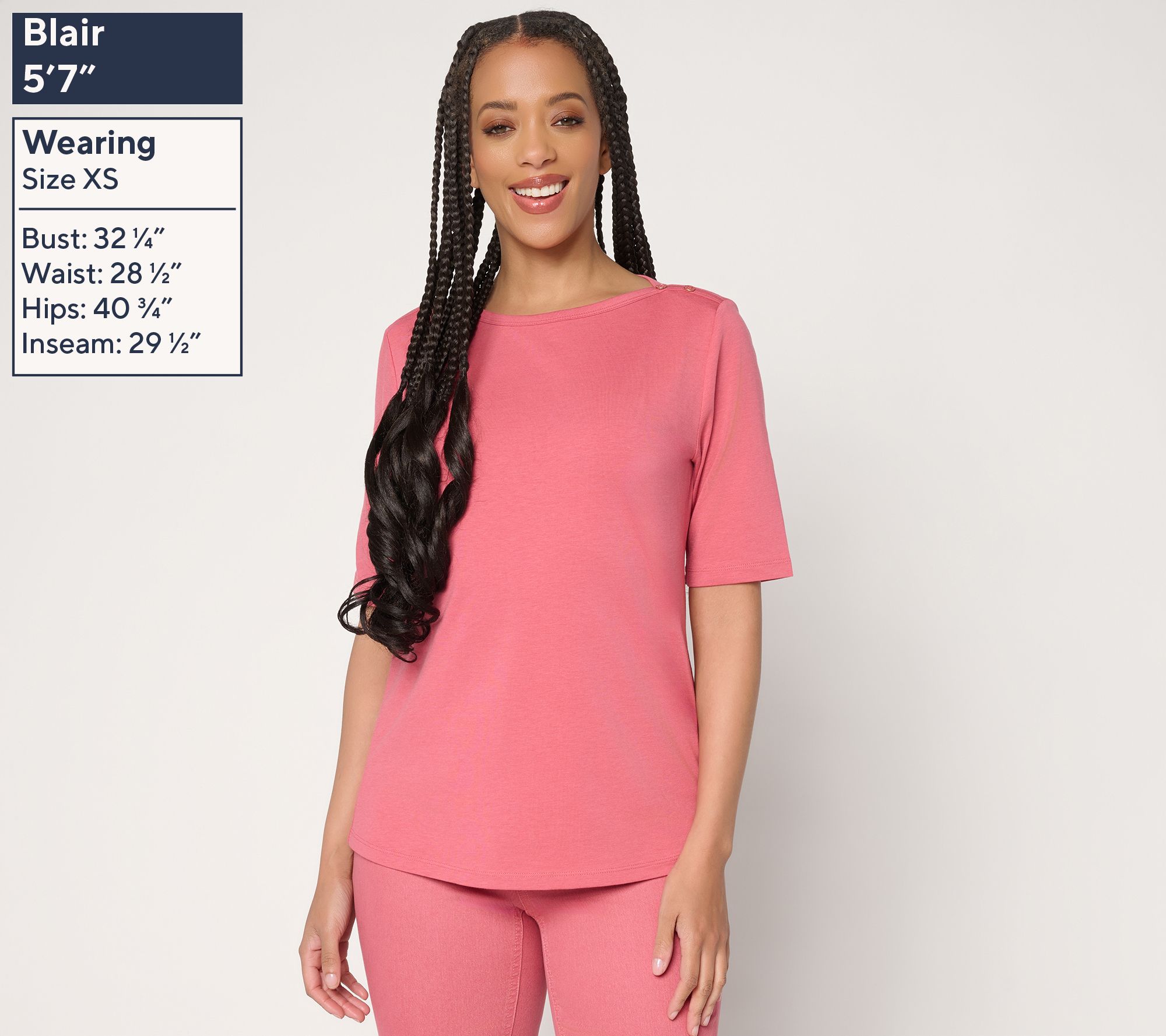 Refresh your everyday wardrobe with this Favorite Jersey boatneck top -- an easy choice for relaxed days at the office or weekend outings. Soft stretch fabric pairs with a clean neckline and button detail at the shoulder, while elbow sleeves offer just the right amount of coverage. A simple straight hem keeps the look polished yet unfussy. From Denim & Co.® Fashions.