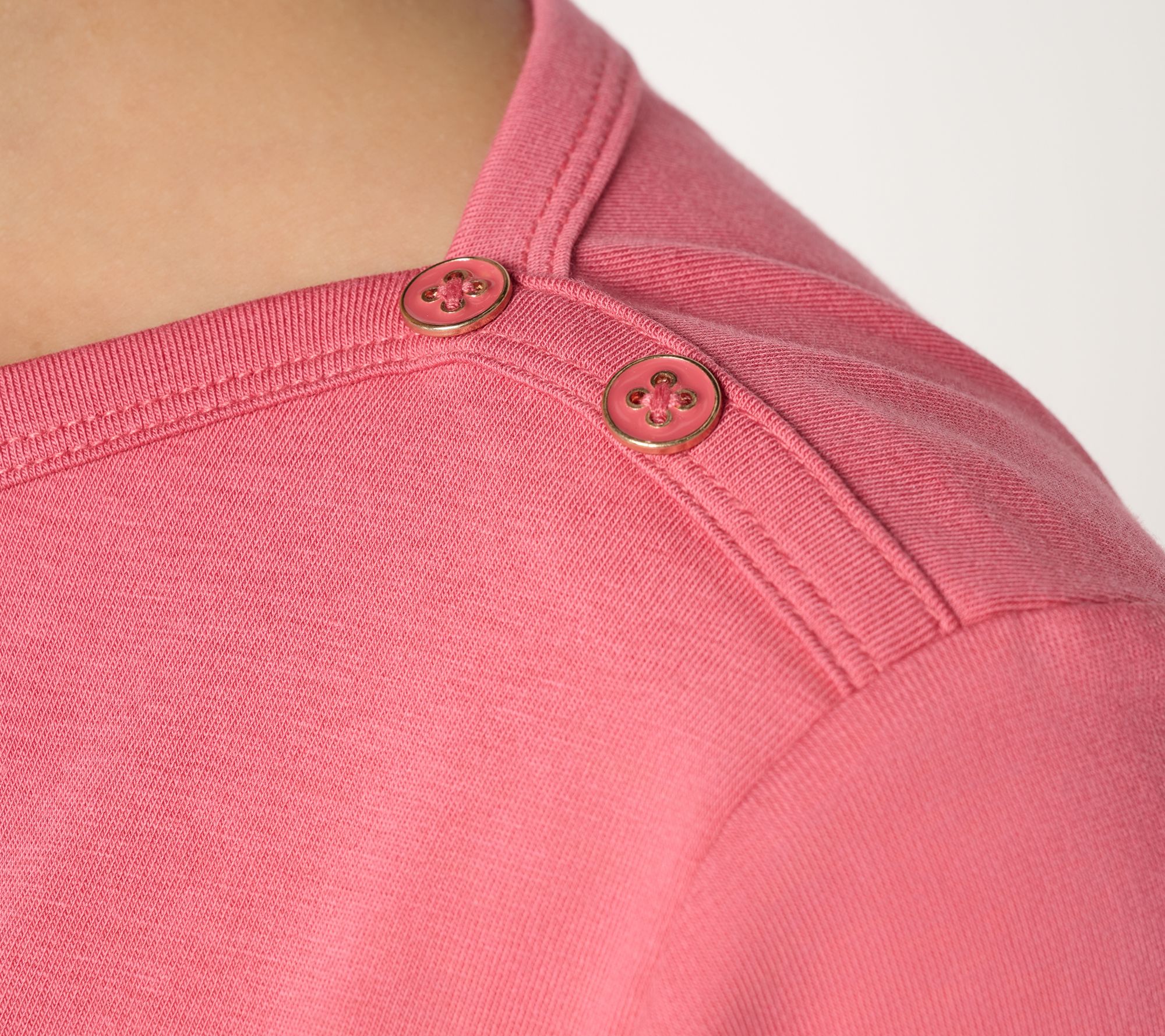 • Features: boat neckline, non-functional button detail at shoulder, elbow-length sleeves, straight bottom hemline