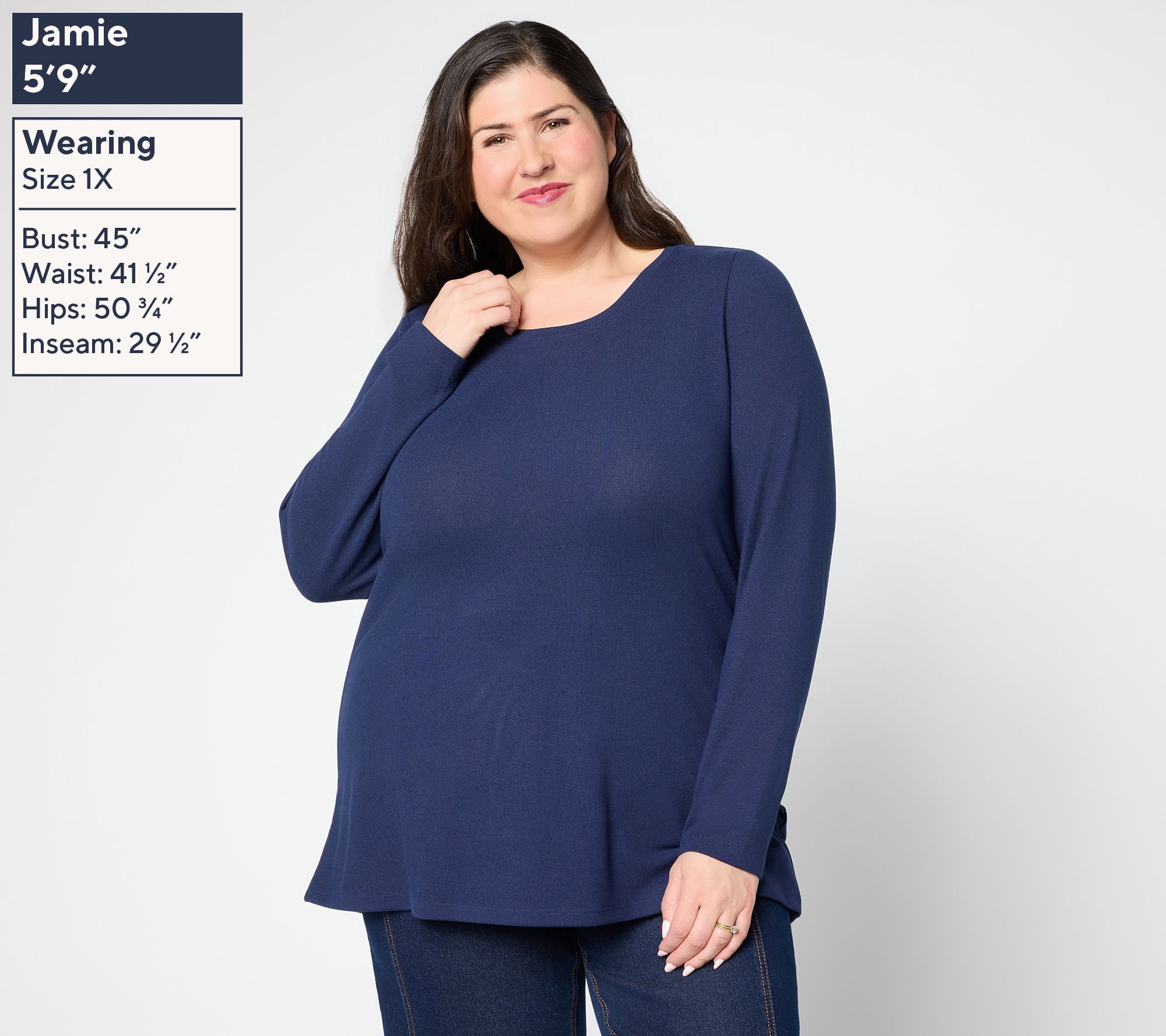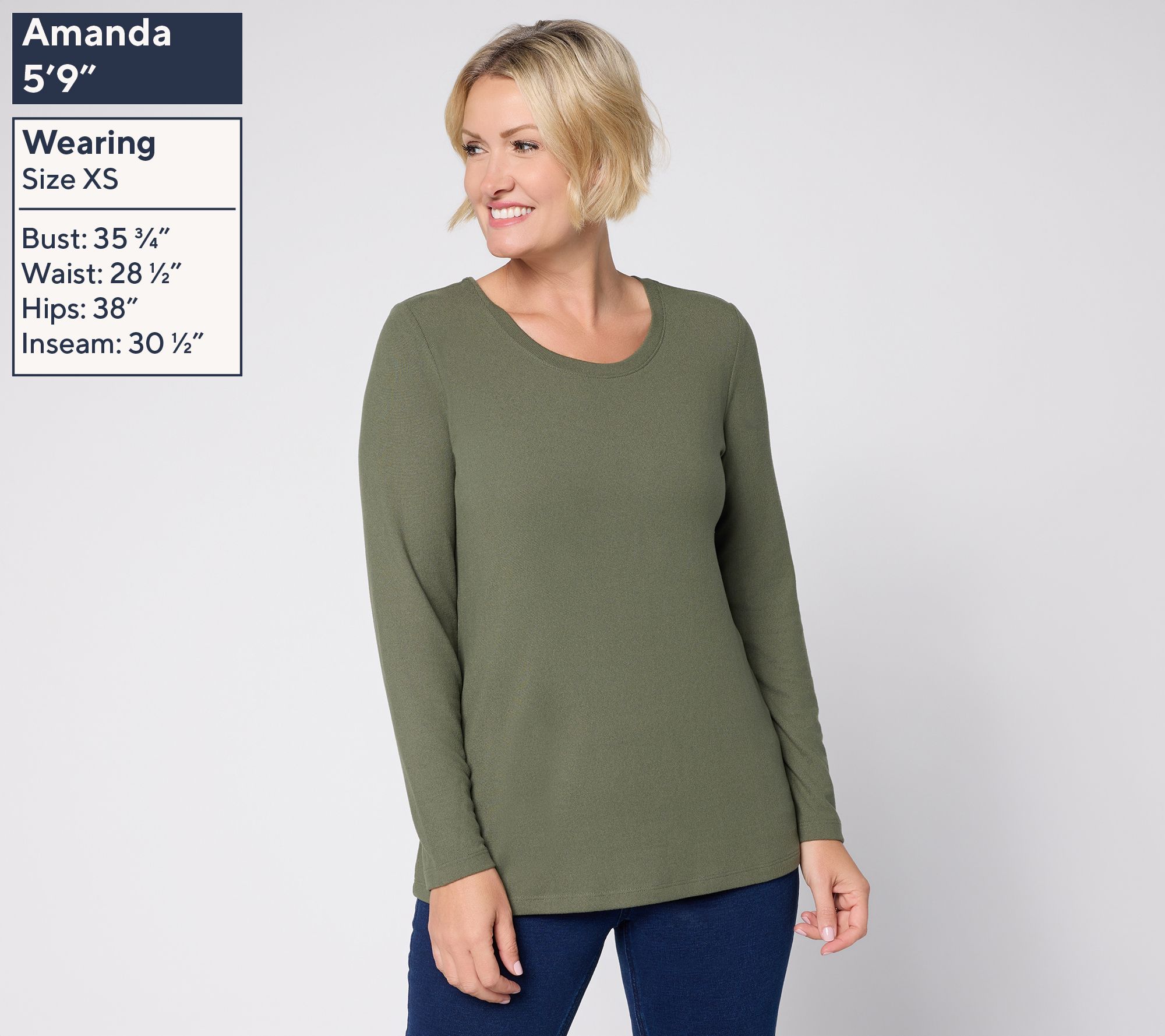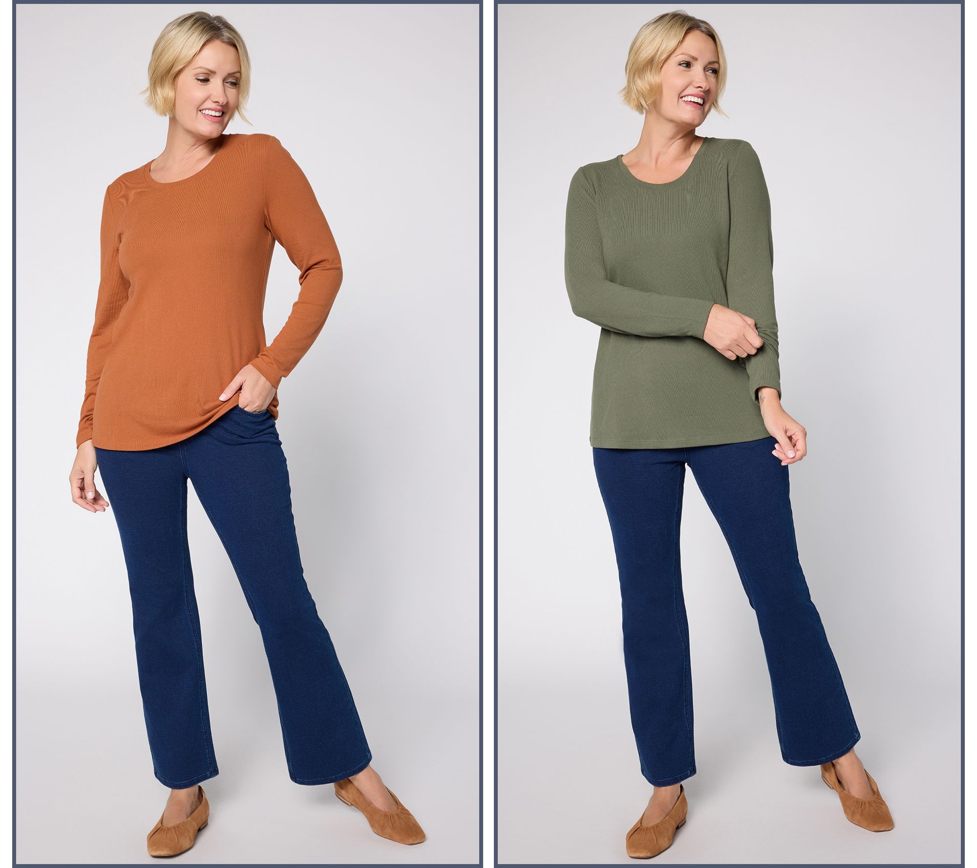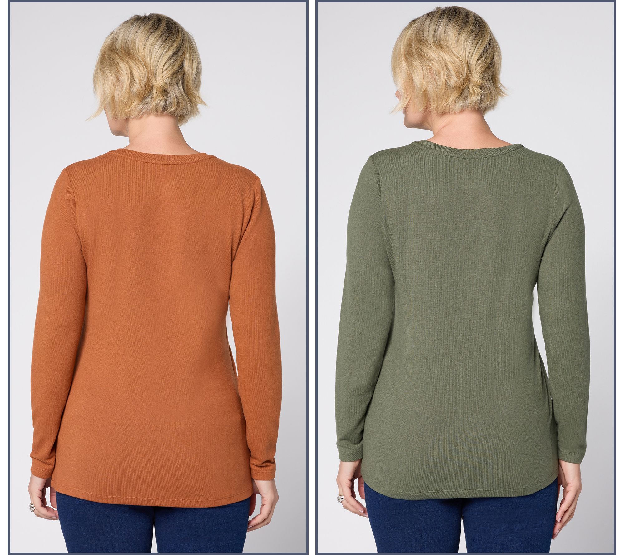 Restock your wardrobe essentials with this sweet set. A soft, stretchy knit makes these scoop neck tops stand out for casual days and everyday plans. Layer them under cardigans for work or add jewelry to dress up for dinner out. Long sleeves offer coverage through changing seasons, while the two-pack gives you effortless wardrobe options. From Denim & Co.® Fashions.