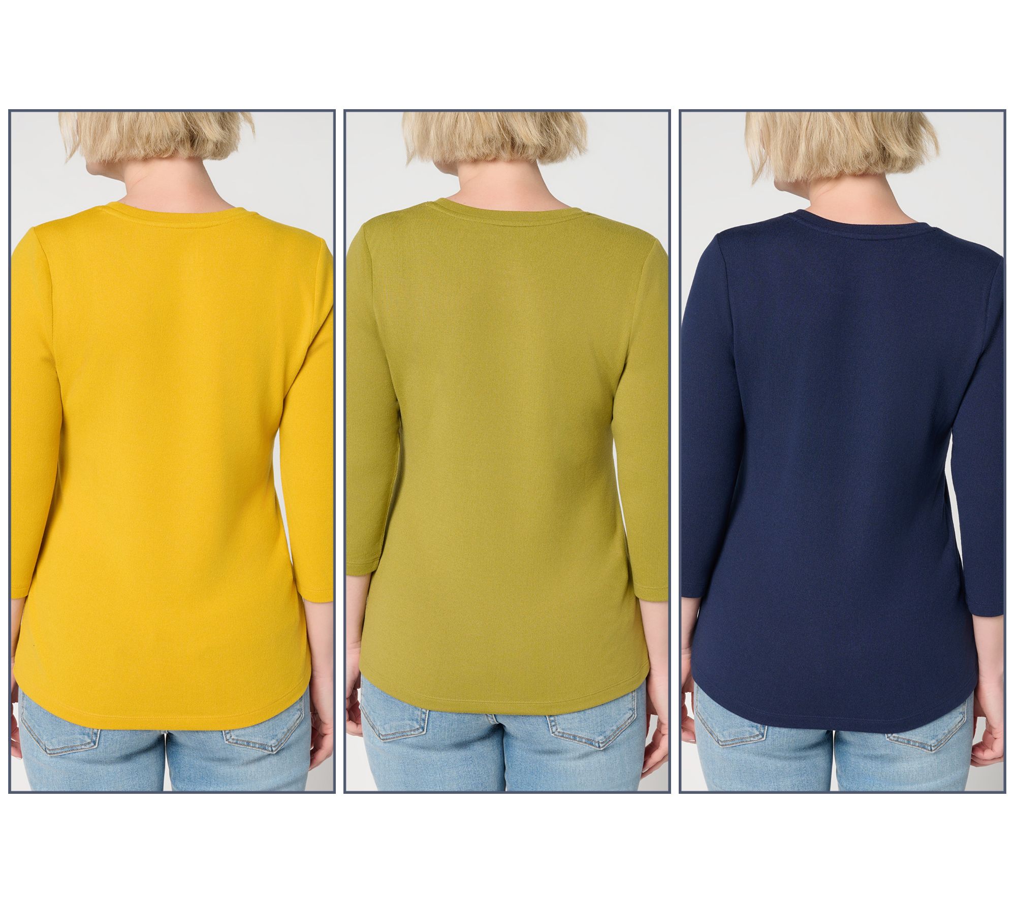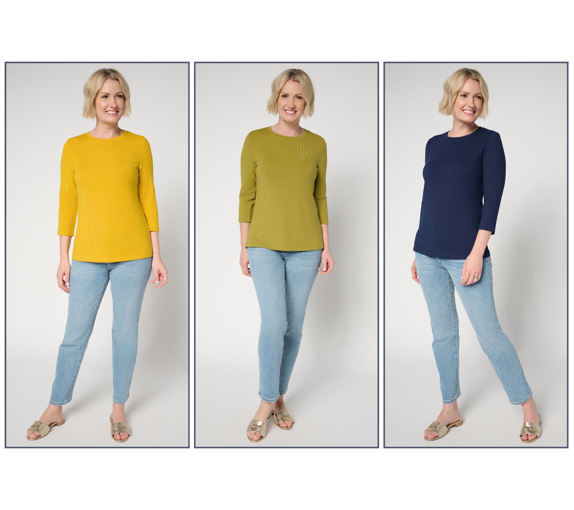 What a gal (and a closet) needs: options! When comfort -- and color choice -- is the name of the game, this assorted-hue trio of Heavenly Jersey tops comes in clutch for mixing, matching, and layering season after season. From Denim & Co.® Fashions.