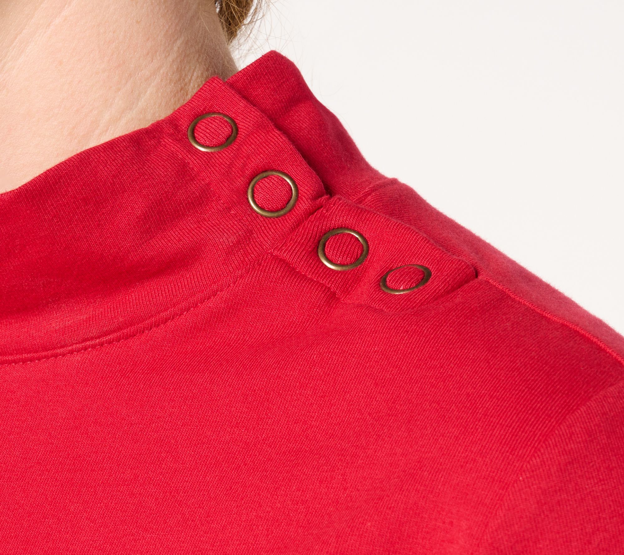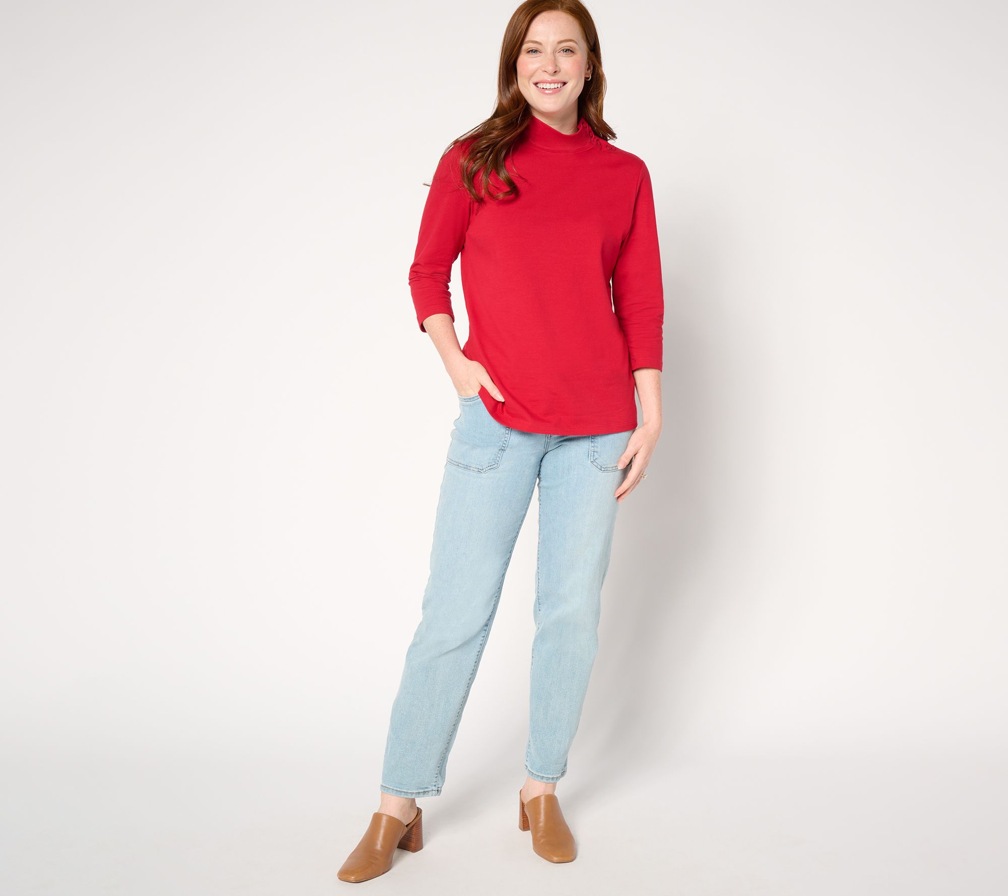 Whether you're heading to the office or out for a casual lunch, the Denim & Co. Essentials perfect jersey mock neck top will be your new go-to. The 3/4-length sleeves and mock neck design add a touch of sophistication, while the snap closure at the neck and shoulder adds a stylish flair. Comfortable and chic, it's perfect for layering or wearing on its own. From Denim & Co.® Fashion.