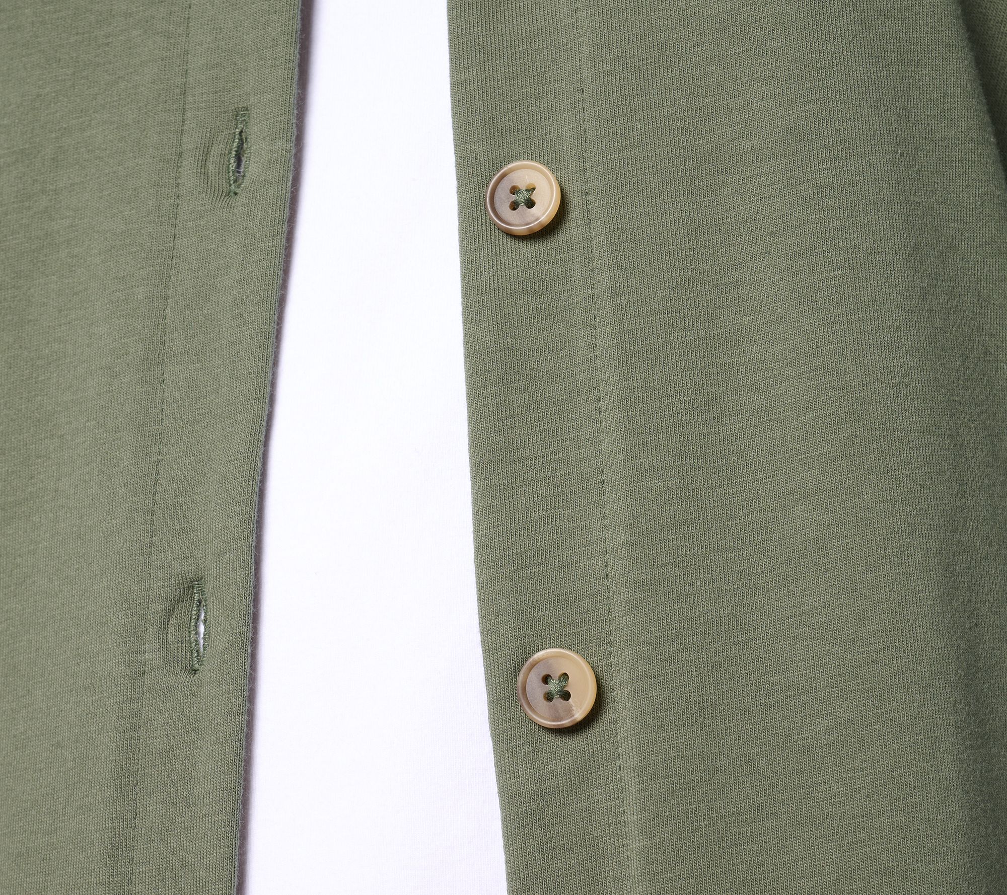 • Features: relaxed set-in long sleeves, V-neckline, functional tortoise button front placket