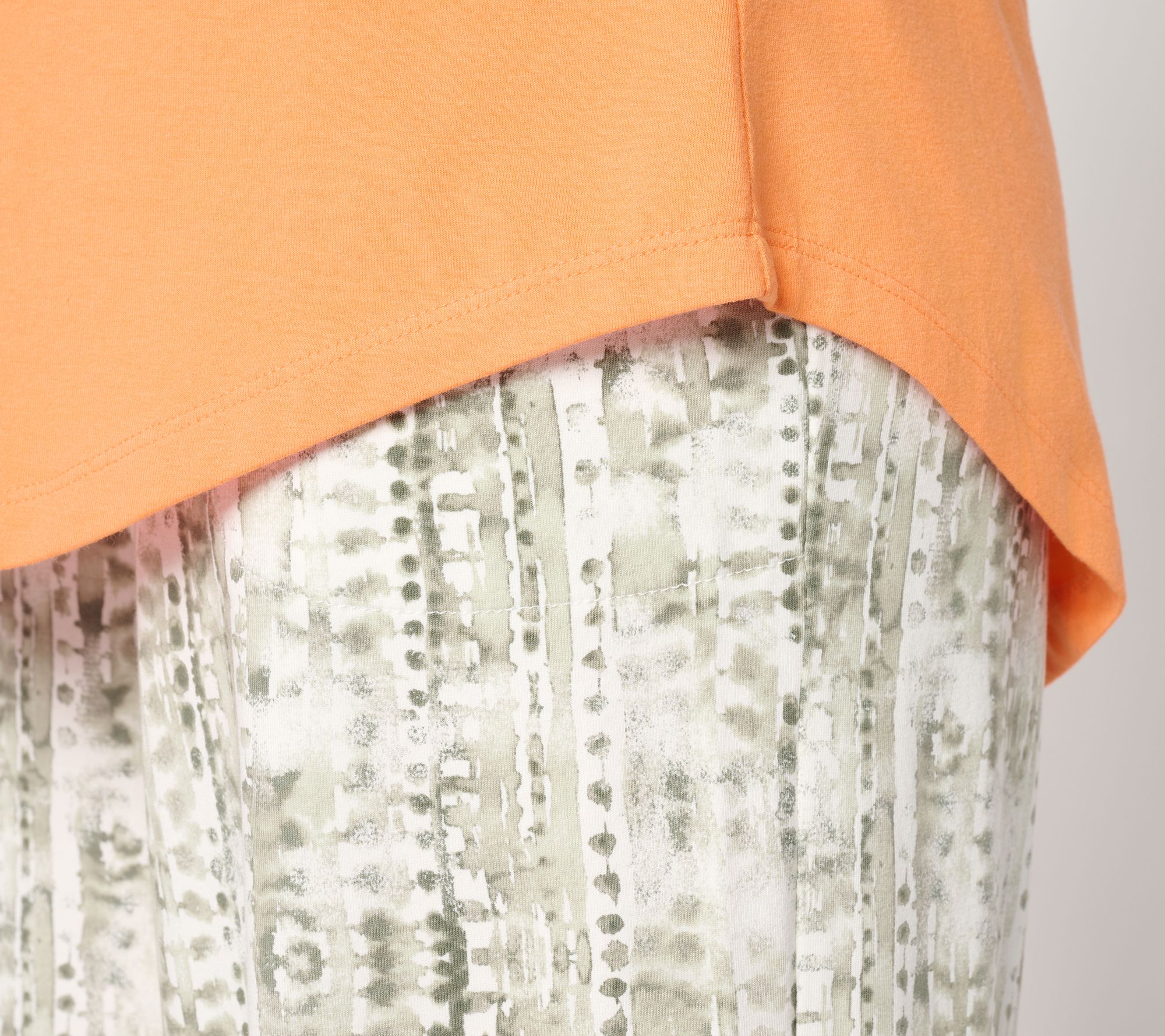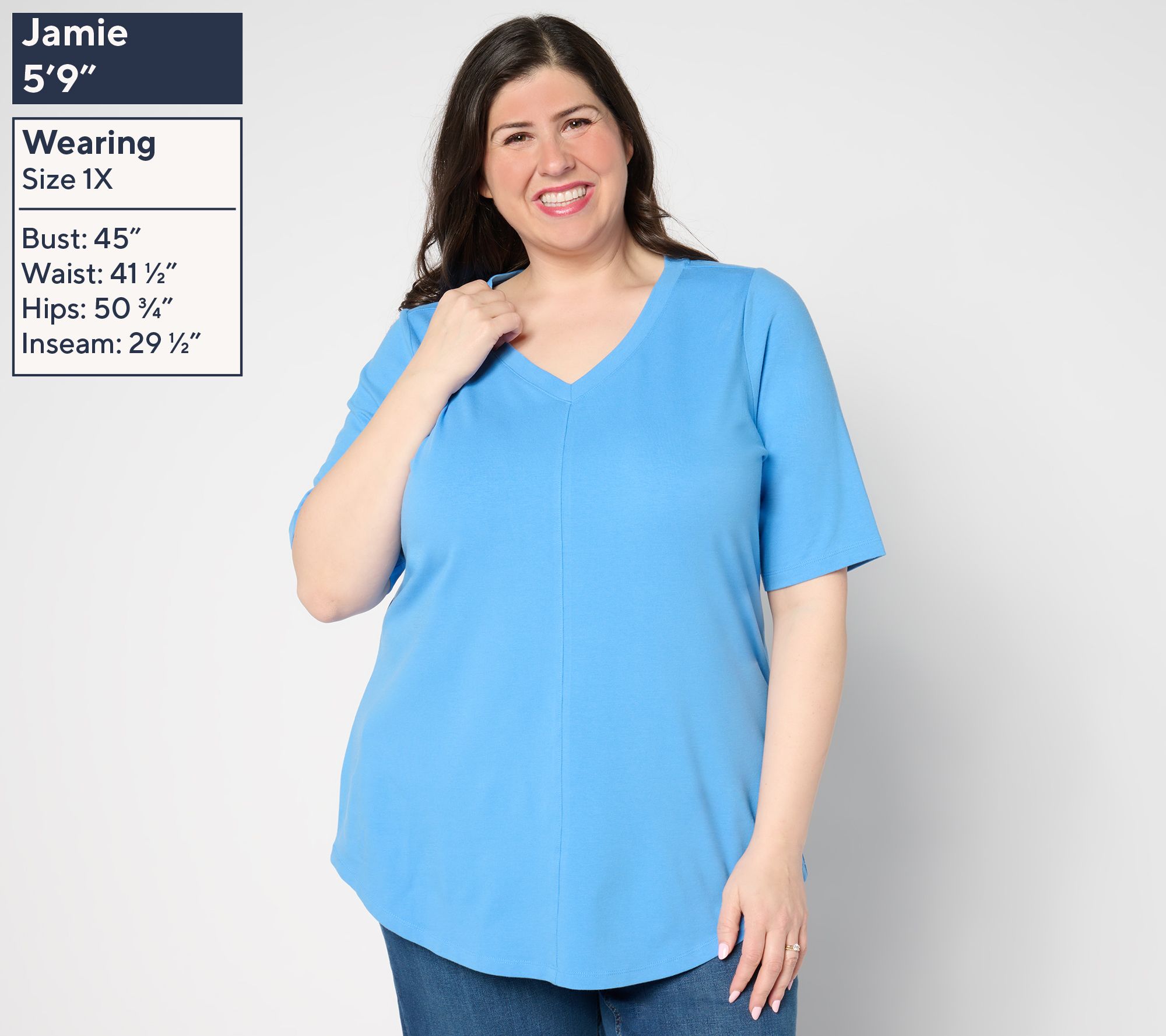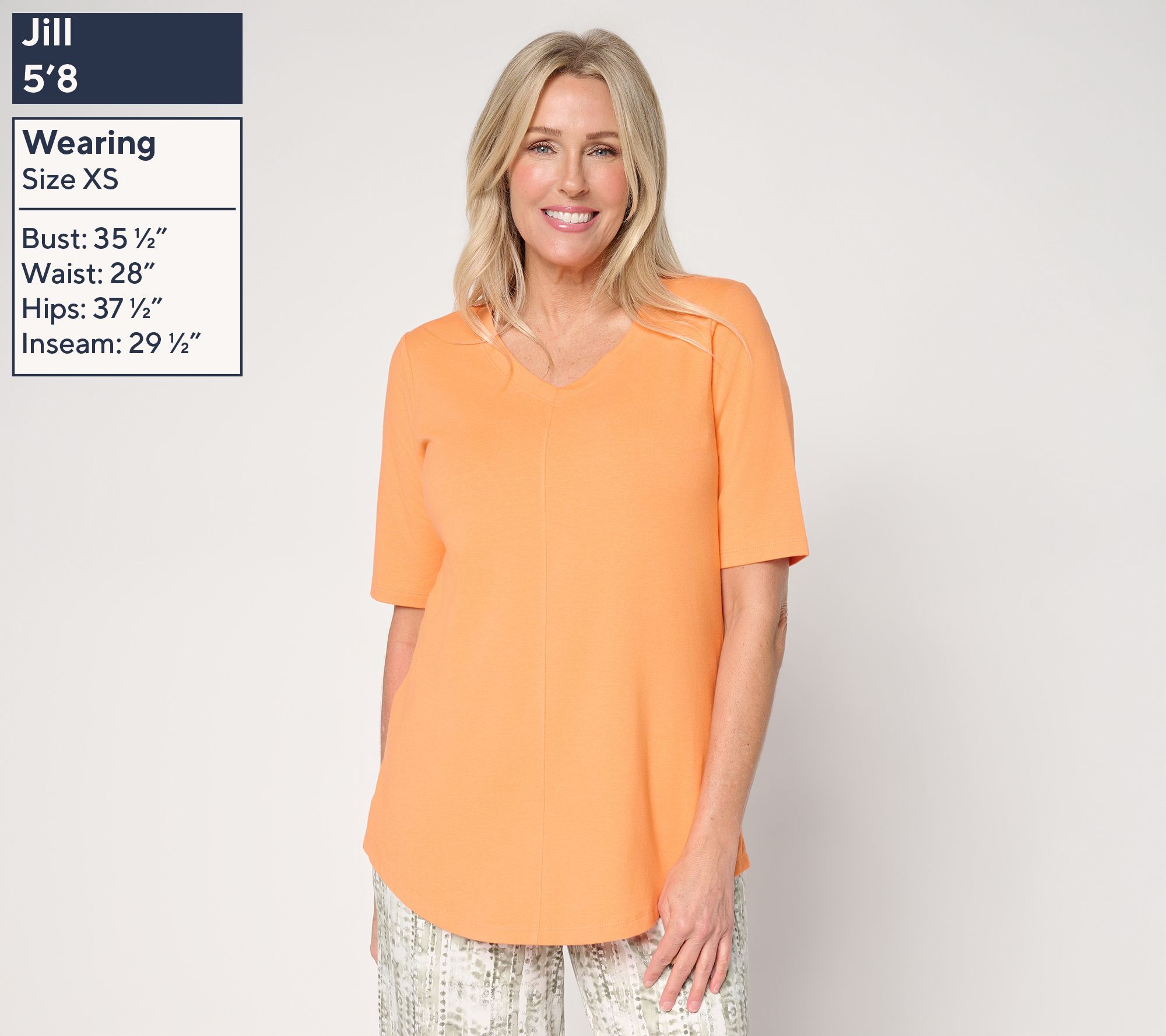 • Features: center front and back seam details, elbow-length sleeves, V-neckline, hi-low shirttail hem
