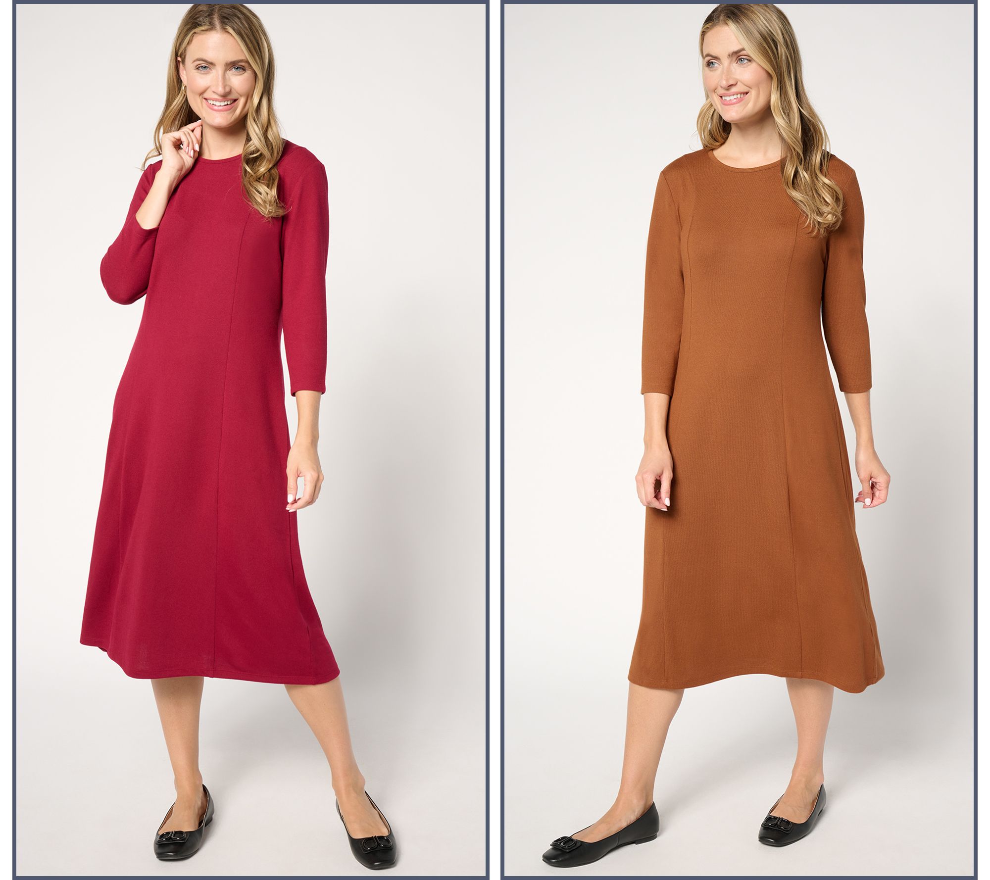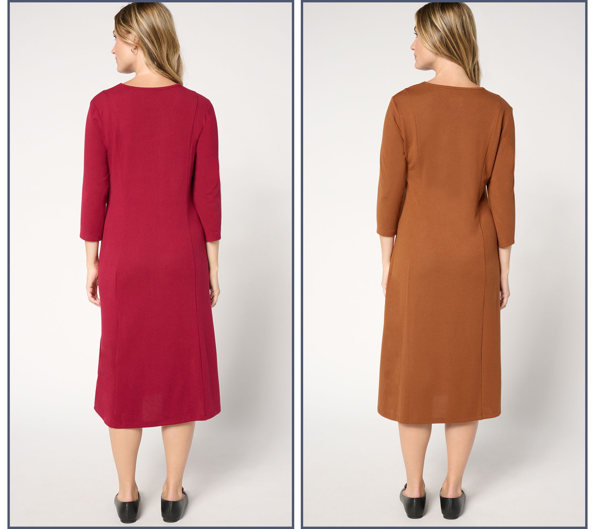 Work week and weekend wardrobe builders, rejoice! This pair of versatile midi dresses completes your closet of confident looks for just about any occasion. Simply layer on a blazer and you're ready for the office or accessorize with a statement necklace and your favorite heels for social gatherings or weekend getaways. And they're comfortably crafted in Heavenly Jersey knit with a semi-fitted silhouette that flatters and moves with you -- so you know you'll want to wear them as often as possible. Good thing there's two! From Denim & Co.® Fashions.