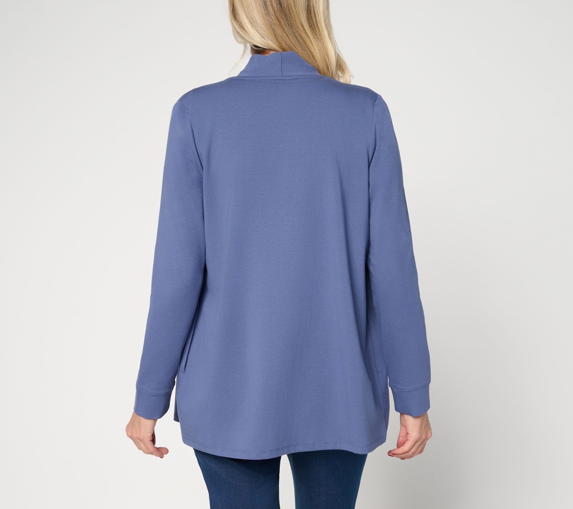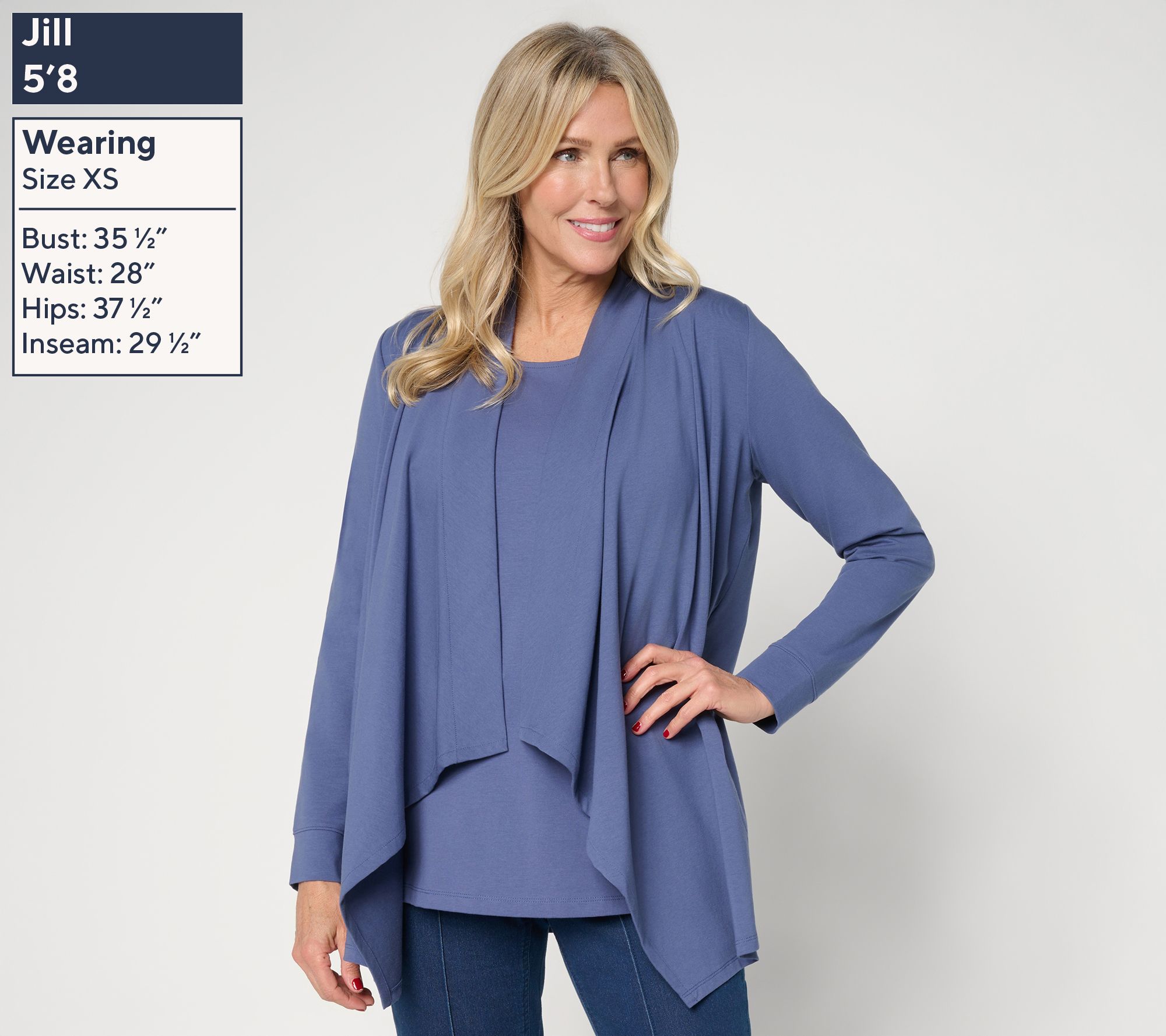 Whether you're dashing out for errands or lounging with a favorite show, this Perfect Jersey cardigan offers easy layering and an effortlessly polished vibe. The draped open front and soft stretch make it comfortable for all-day wear, with on-seam pockets ready for your essentials when you're on the move. From Denim & Co.® Fashions.