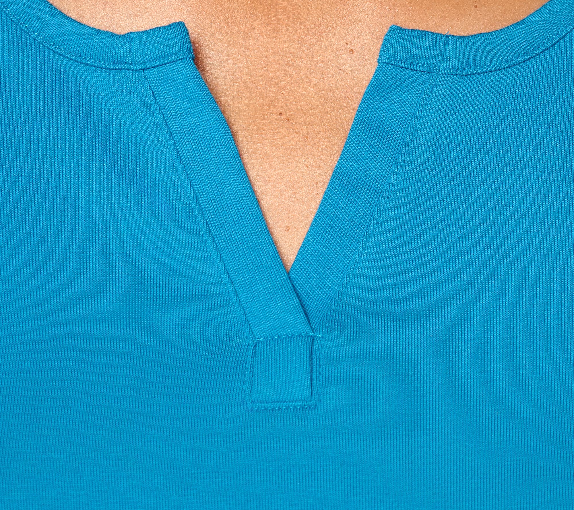 • Features: Y-neckline with placket, long sleeves, straight bottom hem, side slits