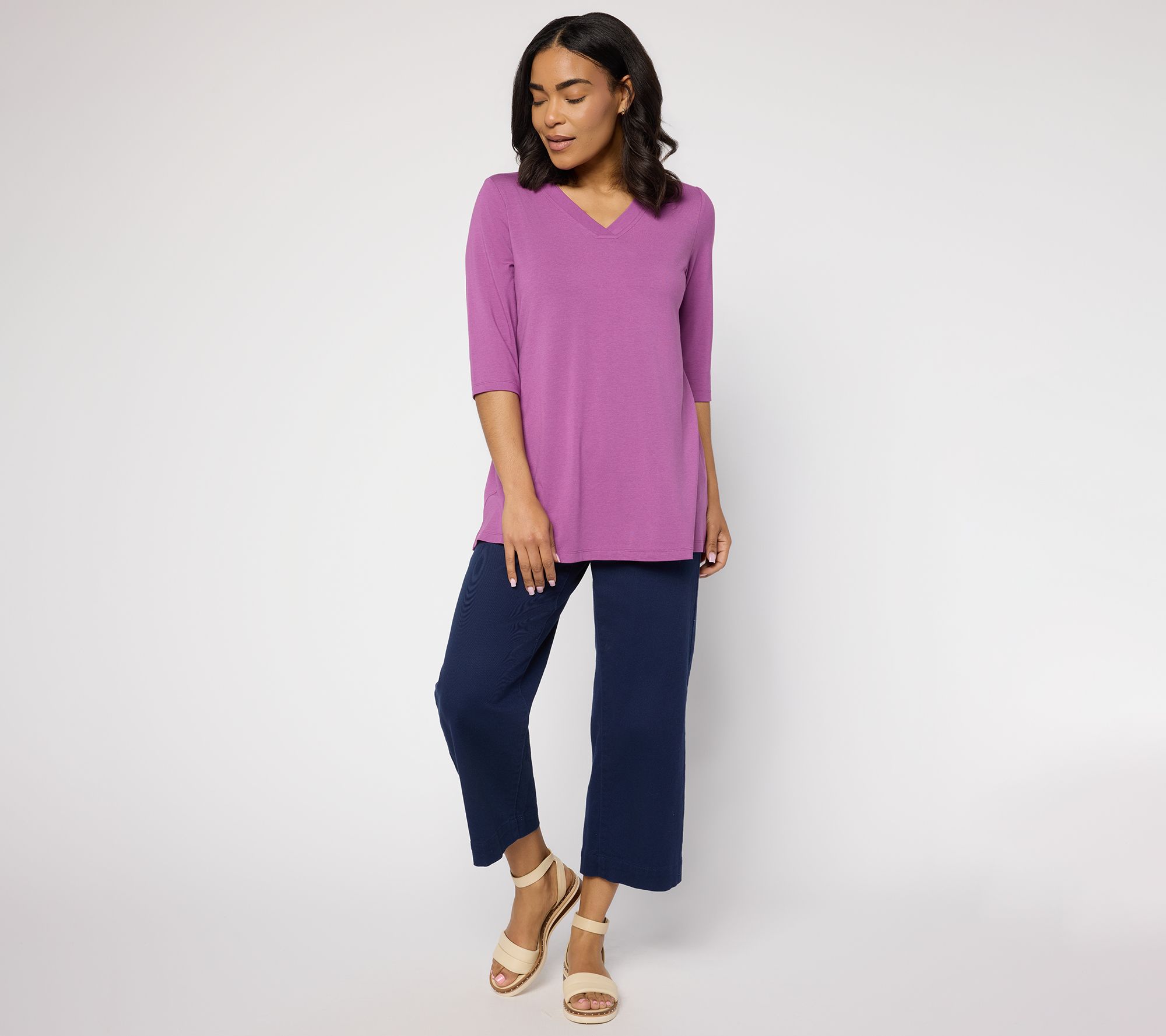 Shy on a few closet essentials this season? Ease into every day with this So Soft Jersey knit tunic. Whether you're heading out for coffee or tackling your to-do list, the flattering V-neckline and ballet-length sleeves offer just-right coverage and style you can rely on for casual plans -- any day of the week. From Denim & Co.® Fashions.