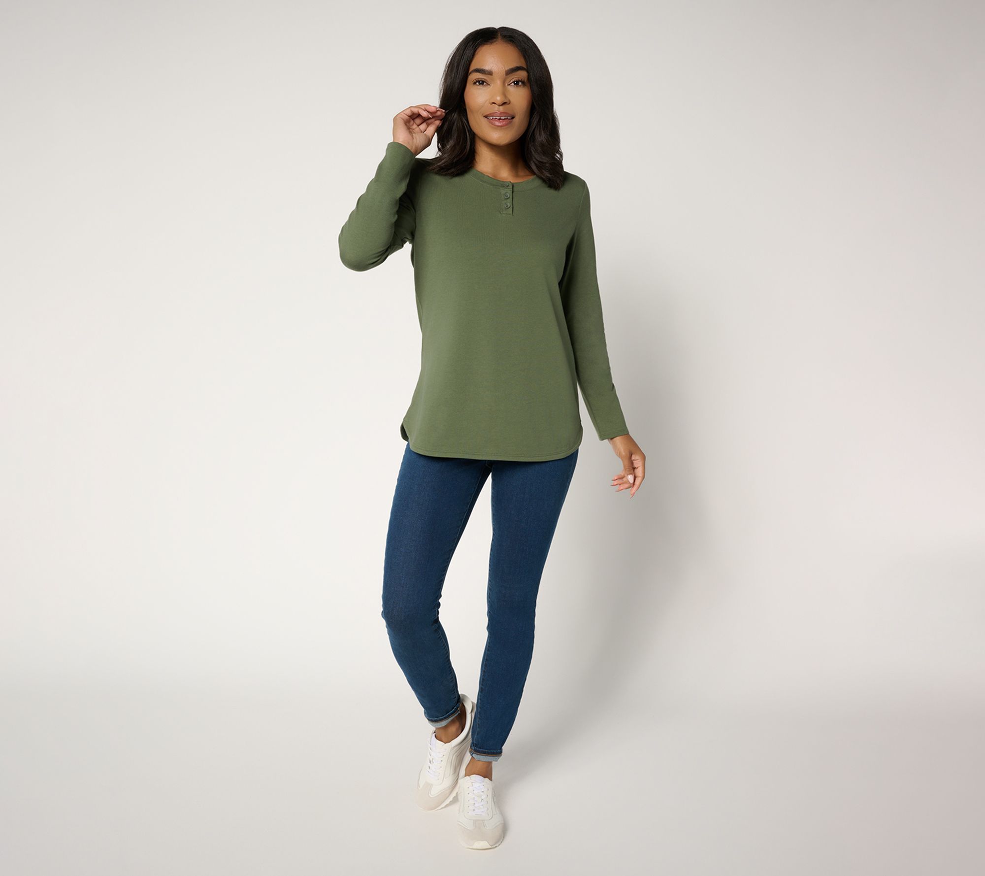 Hands down, this is the kind of throw-on-and-go tunic you'll reach for again and again. With its effortless henley neckline and curved hem, this versatile piece moves from weekday errands to weekend plans without skipping a beat. Pair it with your favorite jeans or leggings for a comfortable, polished look. From Denim & Co.® Fashions.