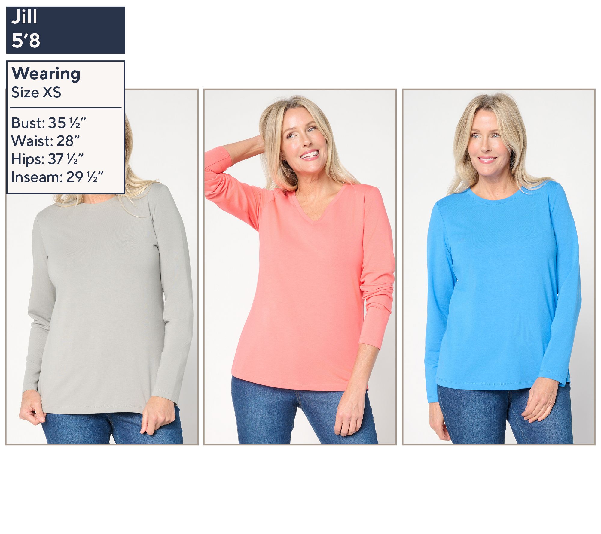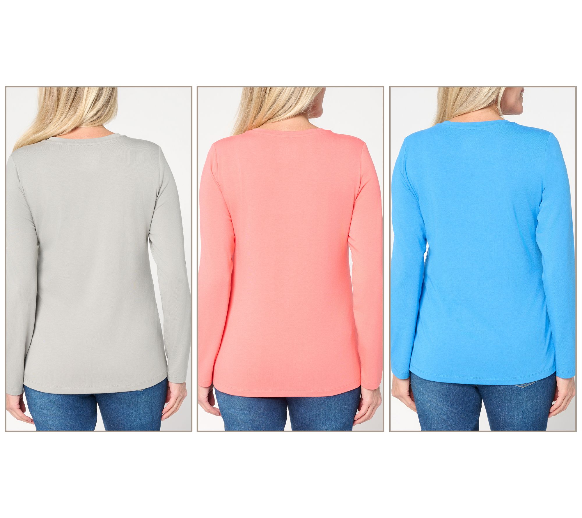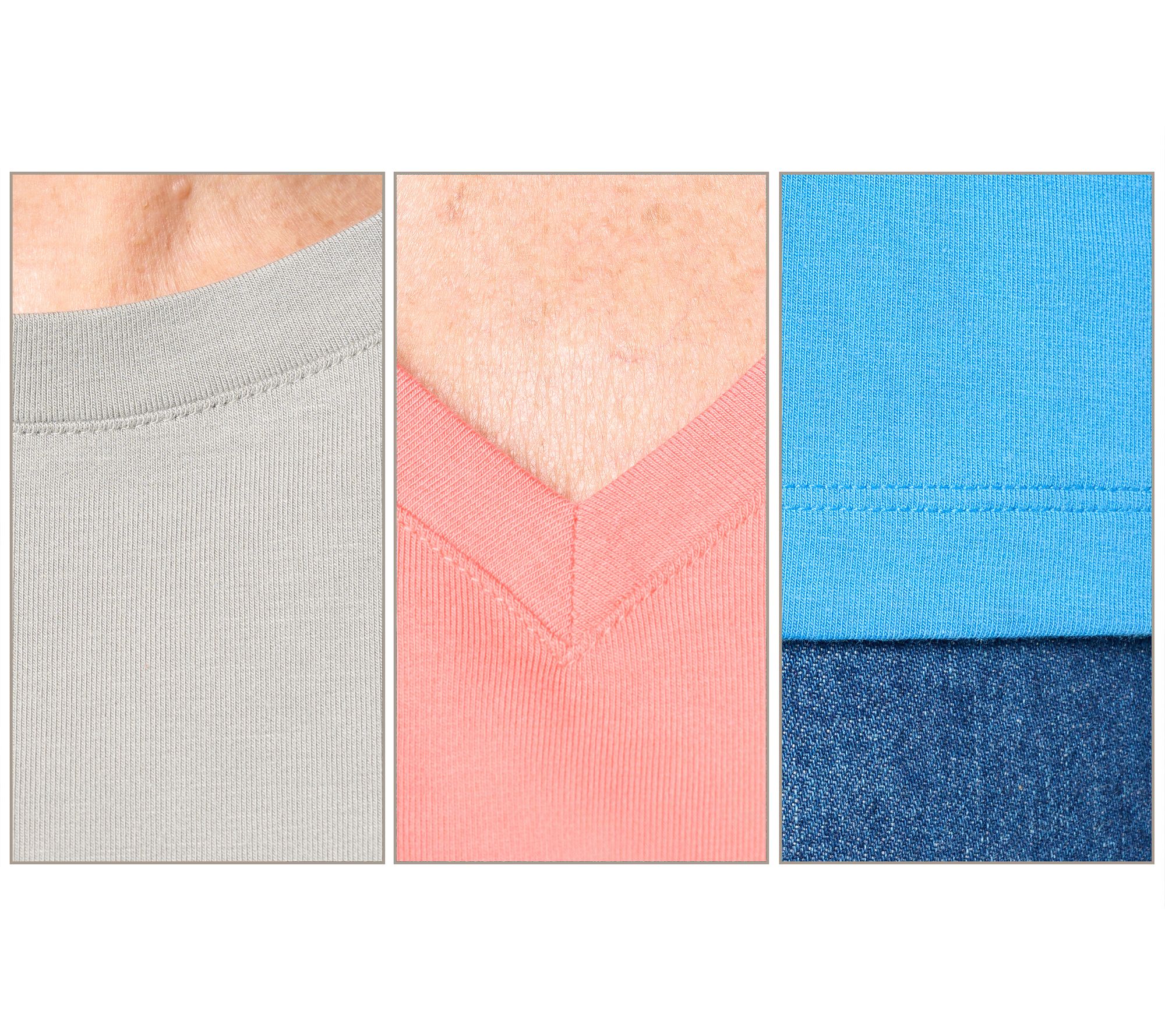 Includes three tops (one crew-, one round-, and one V-neckline)