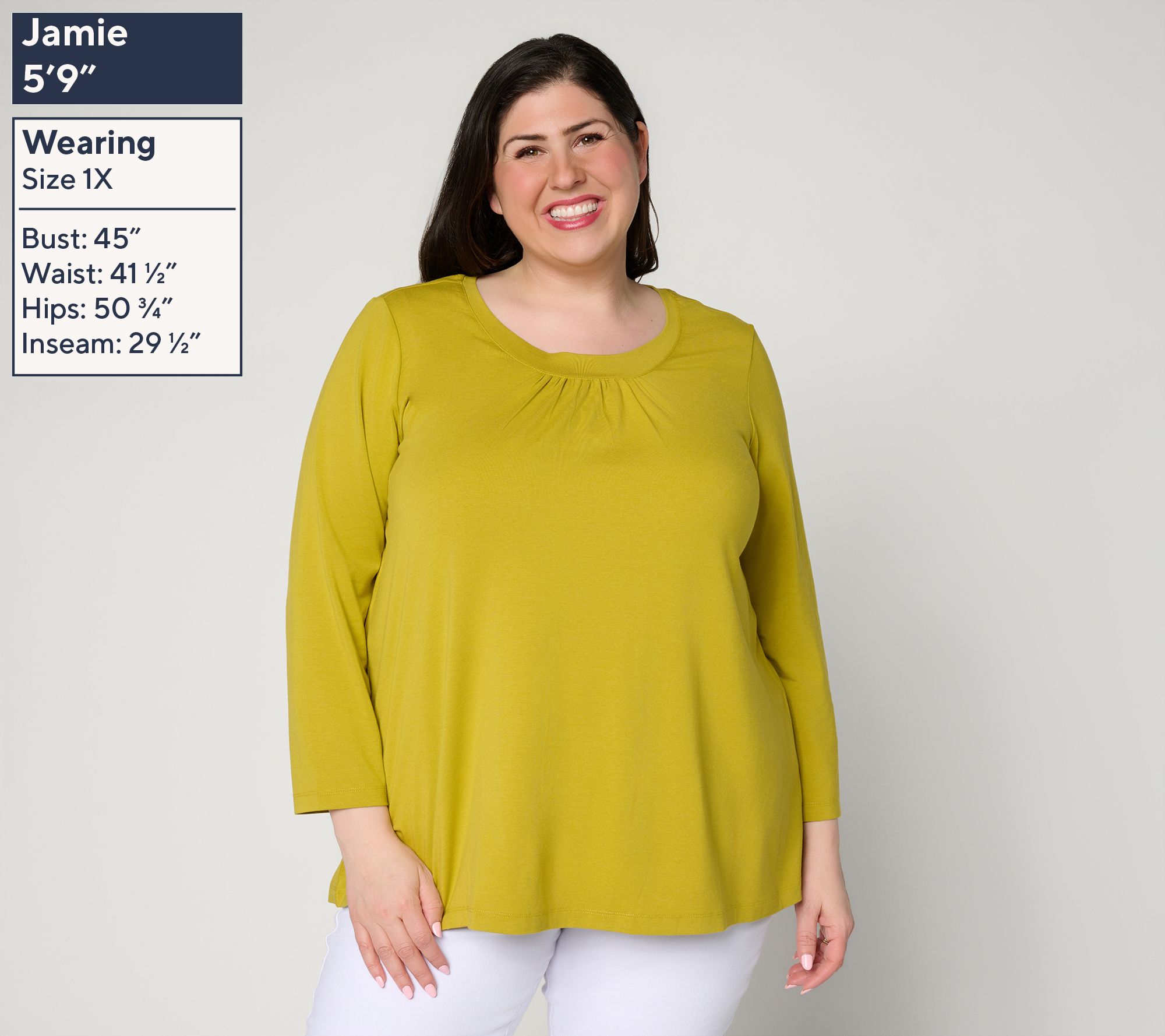 • Features: scoop neckline with ruching at front center, bracelet-length sleeves, swing-style body, clean finished bottom hemline