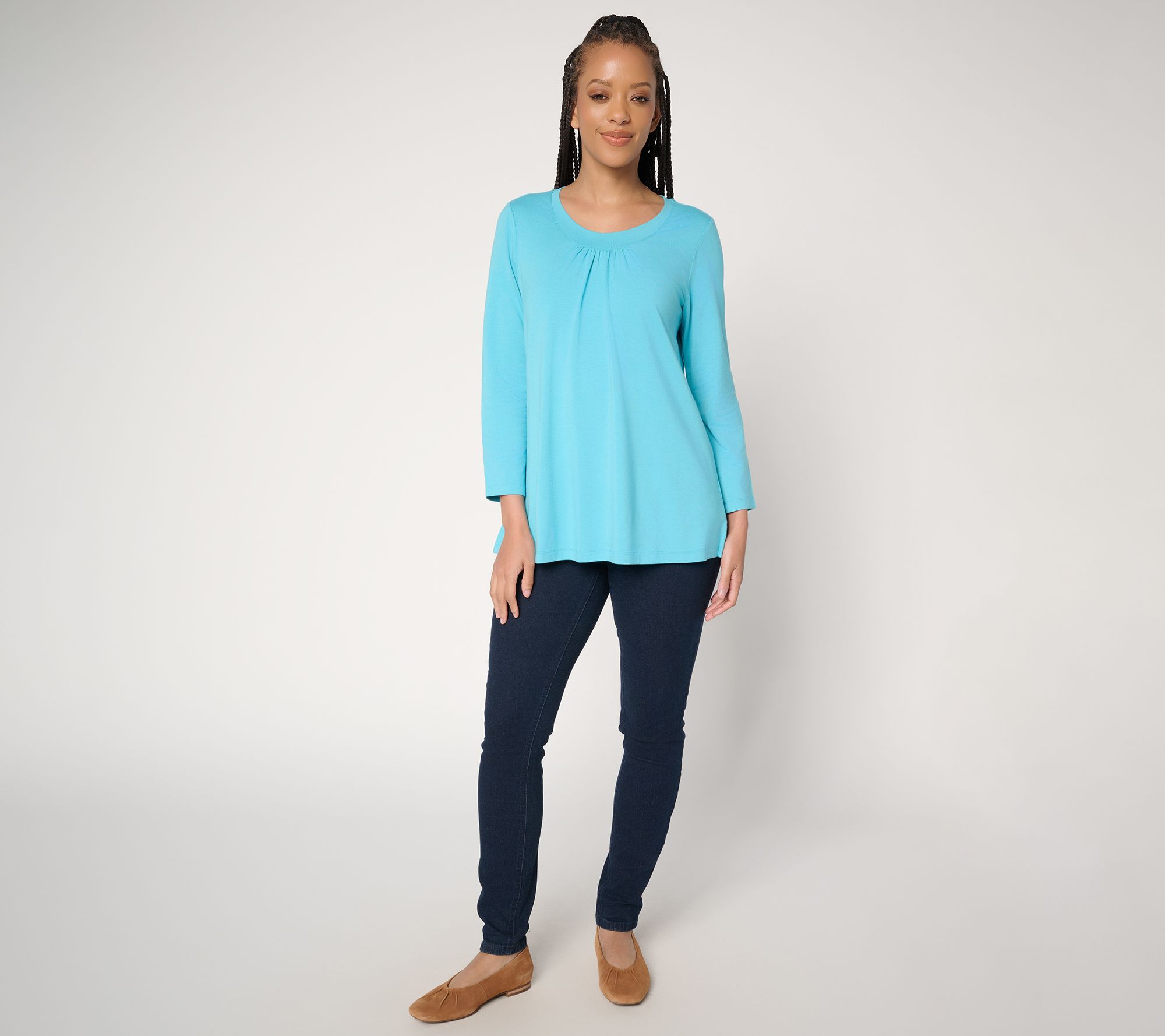 Get into the swing of things. Morning errands or relaxed evenings at home get a boost of cozy style with this swing top, made from ultra-soft knit jersey. Detailed ruching at the center and a wide scoop neckline add a subtle, graceful touch, while bracelet-length sleeves and a fluid silhouette keep you feeling comfortable wherever your day leads. From Denim & Co.® Fashions.