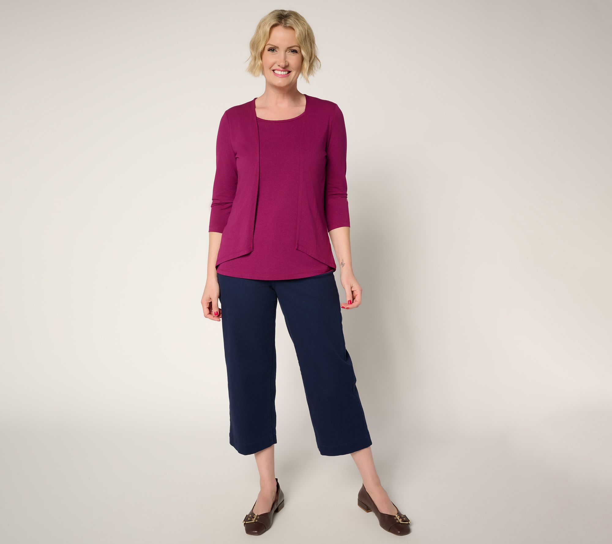 Ready for all your everyday moments, this smart cardigan and tank combo takes the guesswork out of style-savvy layering. The soft jersey fabric delivers that comfy, feel-good touch you love, while the cleverly constructed two-fer design provides a well-put together statement for any occasion. Wear it with tailored pants for a polished professional vibe or with denim if the day calls for a relaxed yet confident look. From Denim & Co.® Fashions.