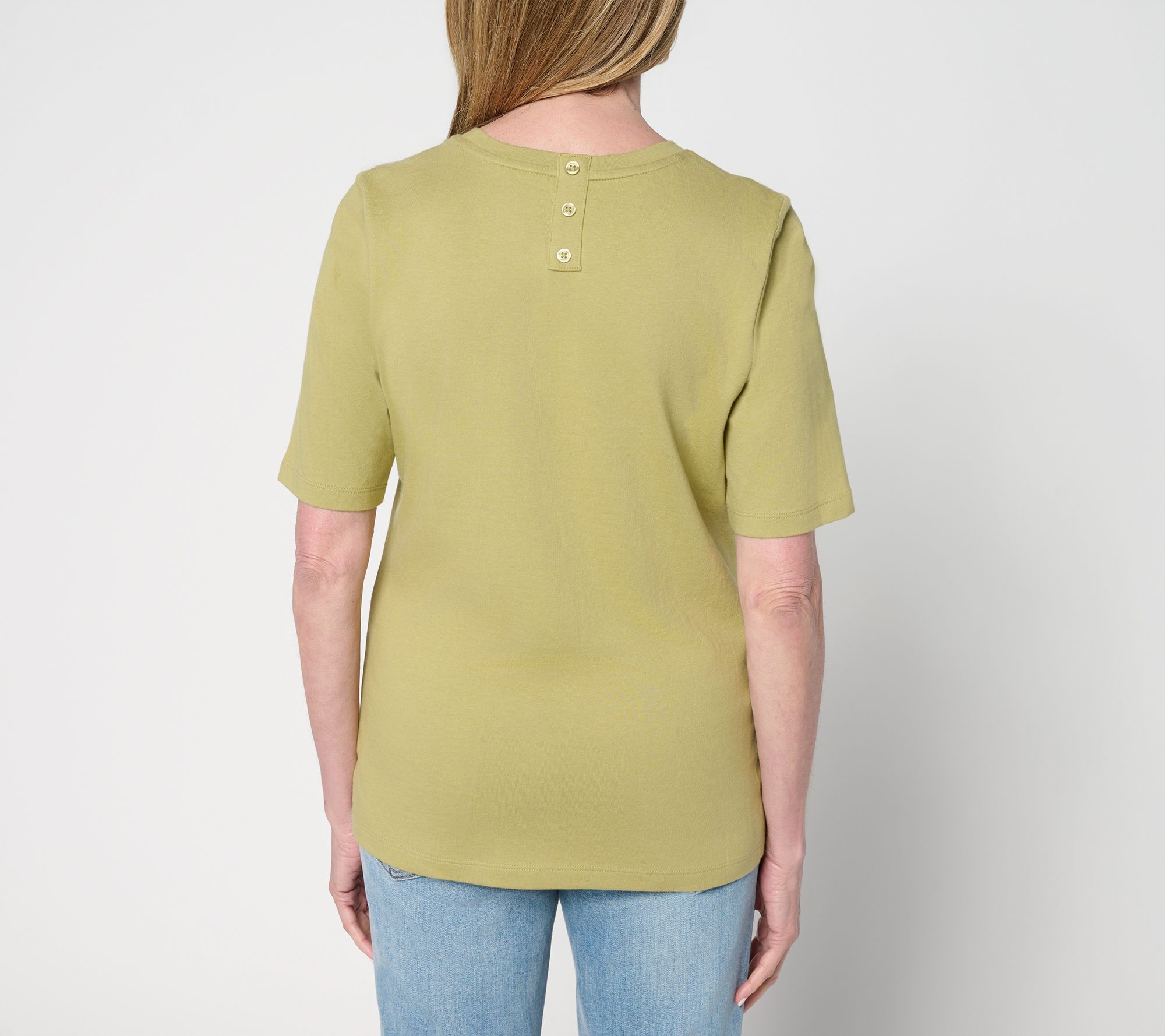 Give your everyday style a refresh with this cotton crew-neck top, finished with a row of playful buttons down the back. Elbow-length sleeves make it a versatile pick for workdays or weekend outings. From Denim & Co.®. Fashions.