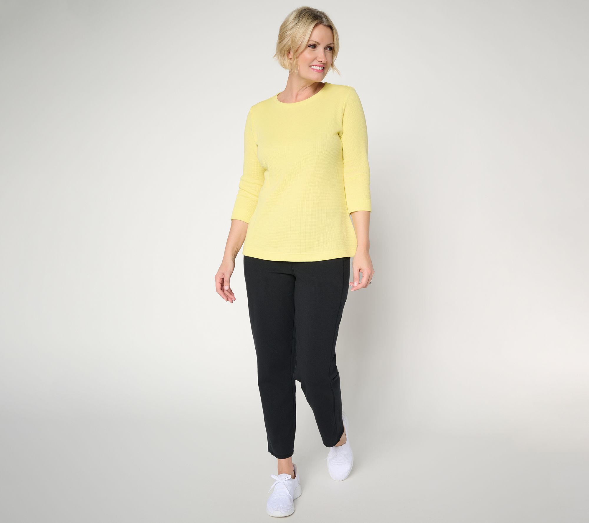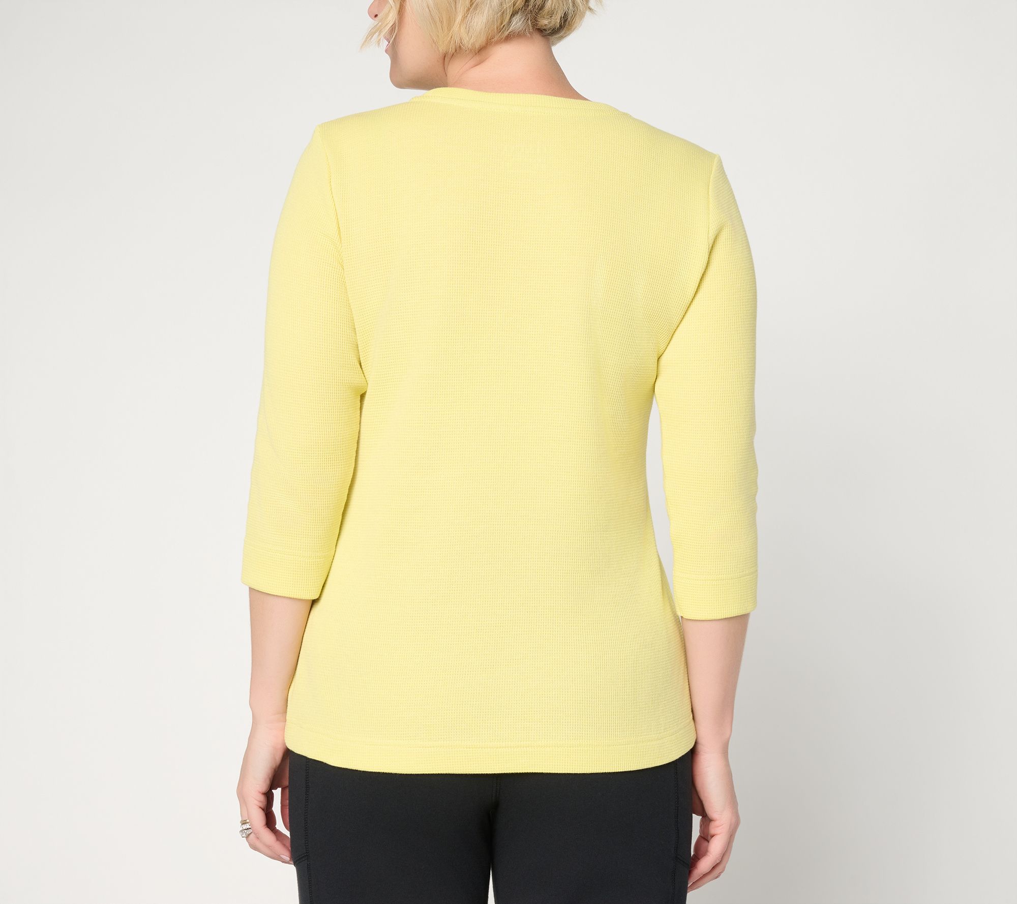 Catch up on coffee dates or tackle everyday errands in comfort with this essential waffle knit top. Designed with a round neckline, 3/4-length sleeves, and a straight bottom hem, it pairs seamlessly with jeans or casual pants for a look that's easy to wear at home or on the go. From Denim & Co.® Fashions.