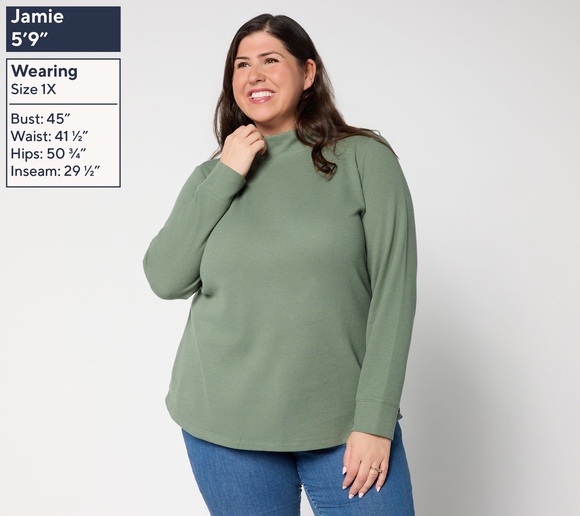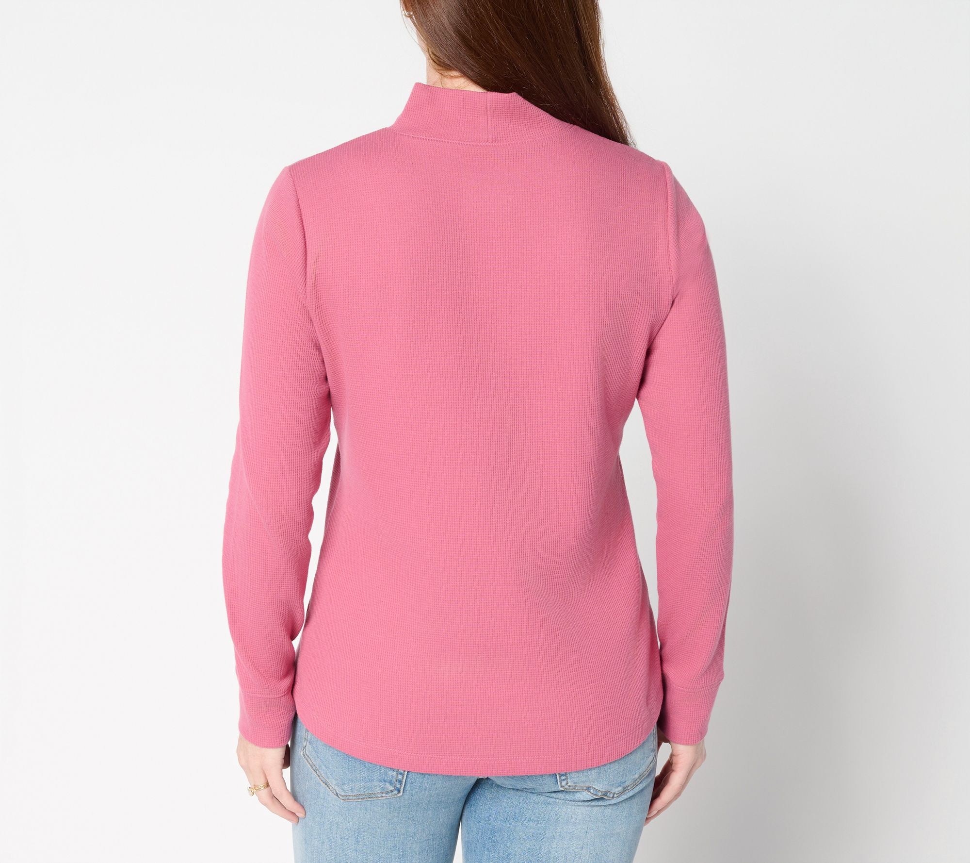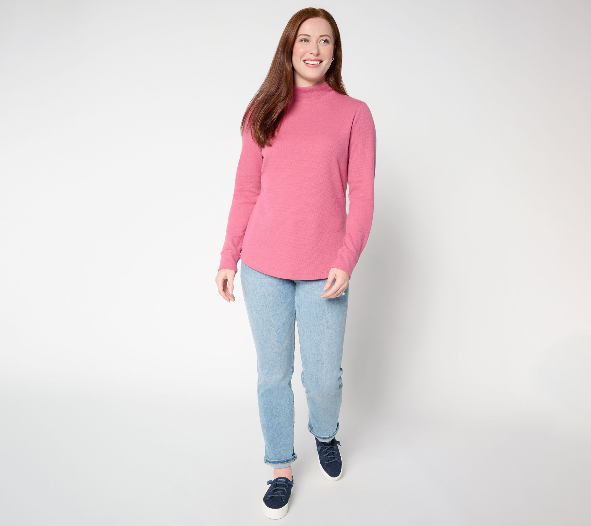 A morning walk or an afternoon meeting feels cozy in this semi-fitted waffle knit top, styled with a soft mock neckline and gently curved hem for a laid-back yet polished look. Comfortable long sleeves and an easy-wearing cotton blend make it an effortless choice for pairing with jeans or layering under your favorite jacket. From Denim & Co.® Fashions.