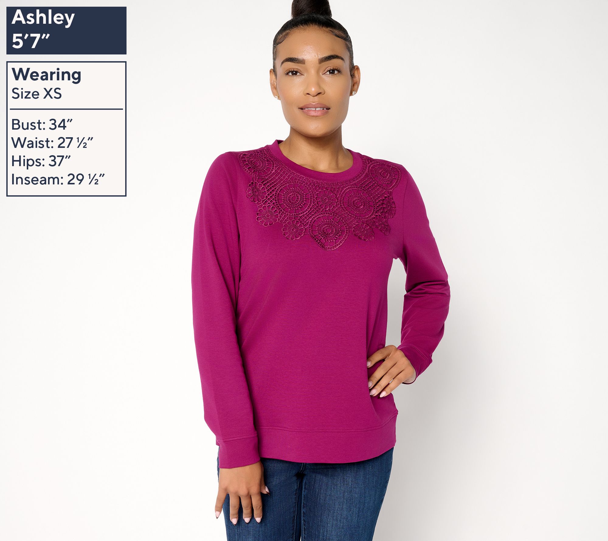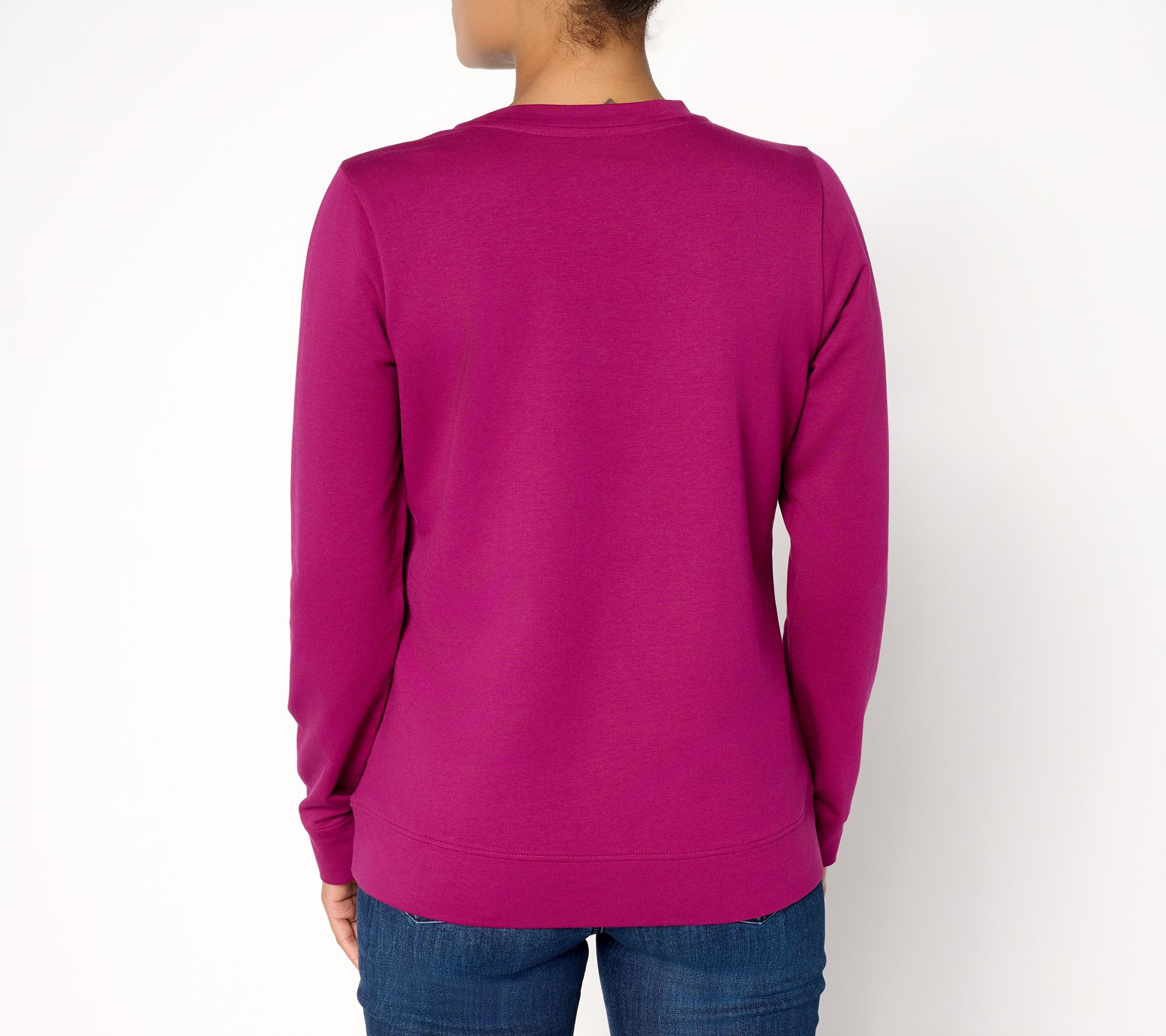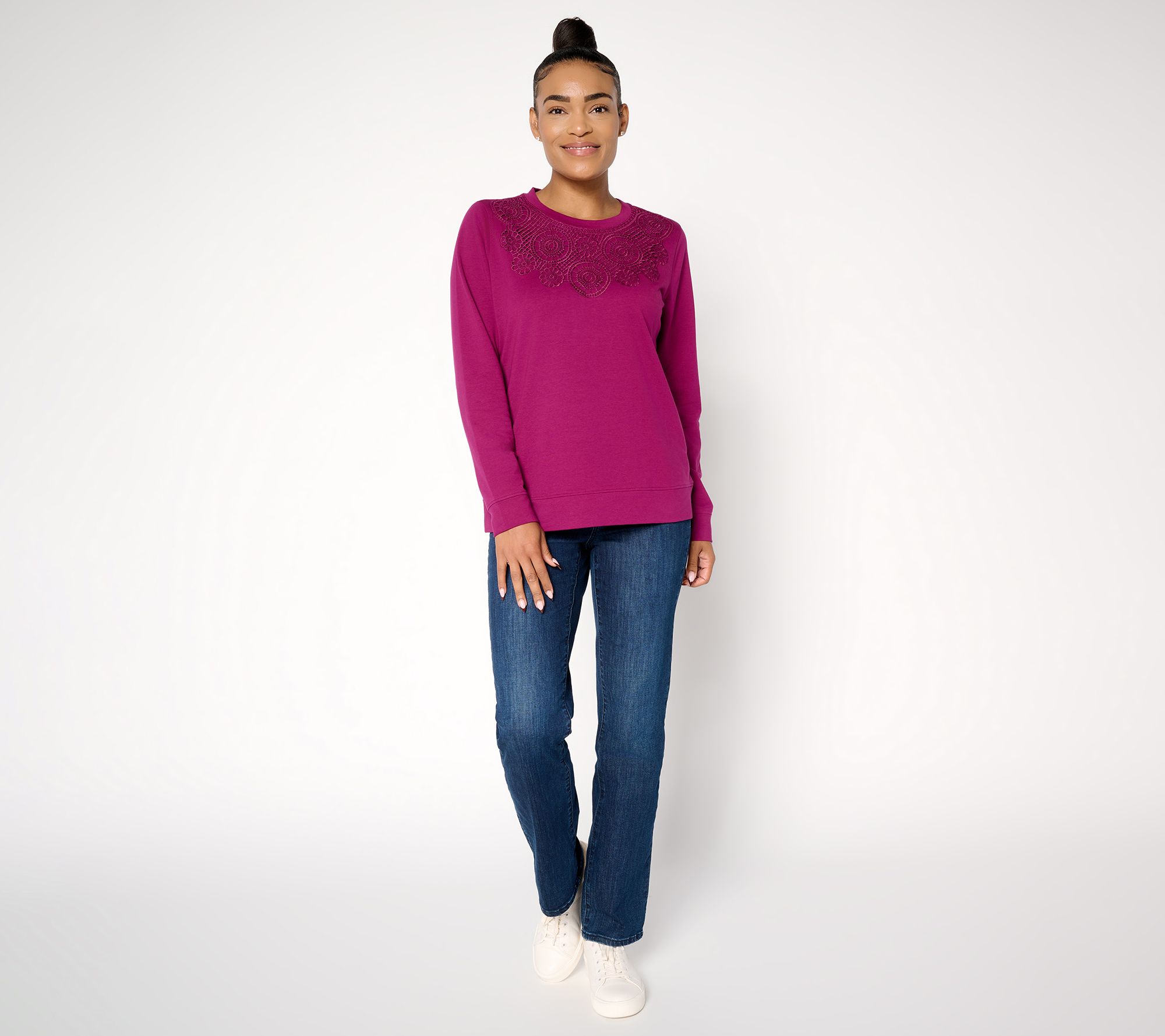 Whether you're heading out for a stroll or relaxing at home, this French terry pullover brings a cozy touch with delicate lace detailing at the shoulders and chest. The crew neckline and long sleeves with soft cuffed ends offer easy comfort, while a straight hem makes pairing with jeans or lounge pants a breeze. From Denim & Co.® Fashions.