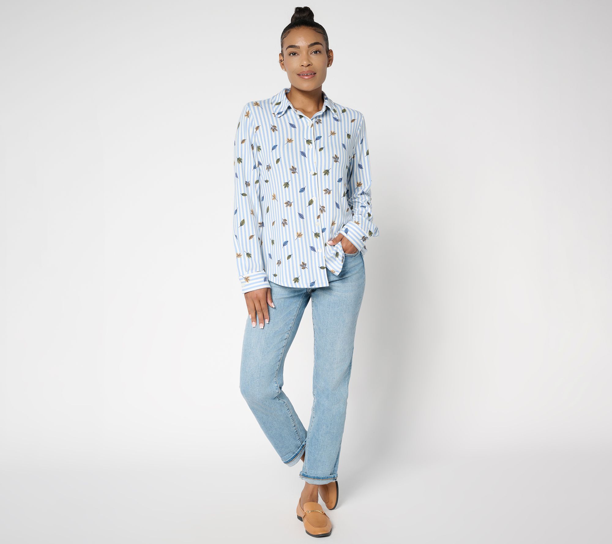 A stroll in the crisp autumn air calls for this knit blouse, styled with a collared neckline, classic button-front, and a rich leaf motif that brings warmth to every scene. The semi-fitted silhouette moves easily from work to weekend outings, while cuffed long sleeves and a center back pleat add effortless polish and comfort. From Denim & Co.® Fashions