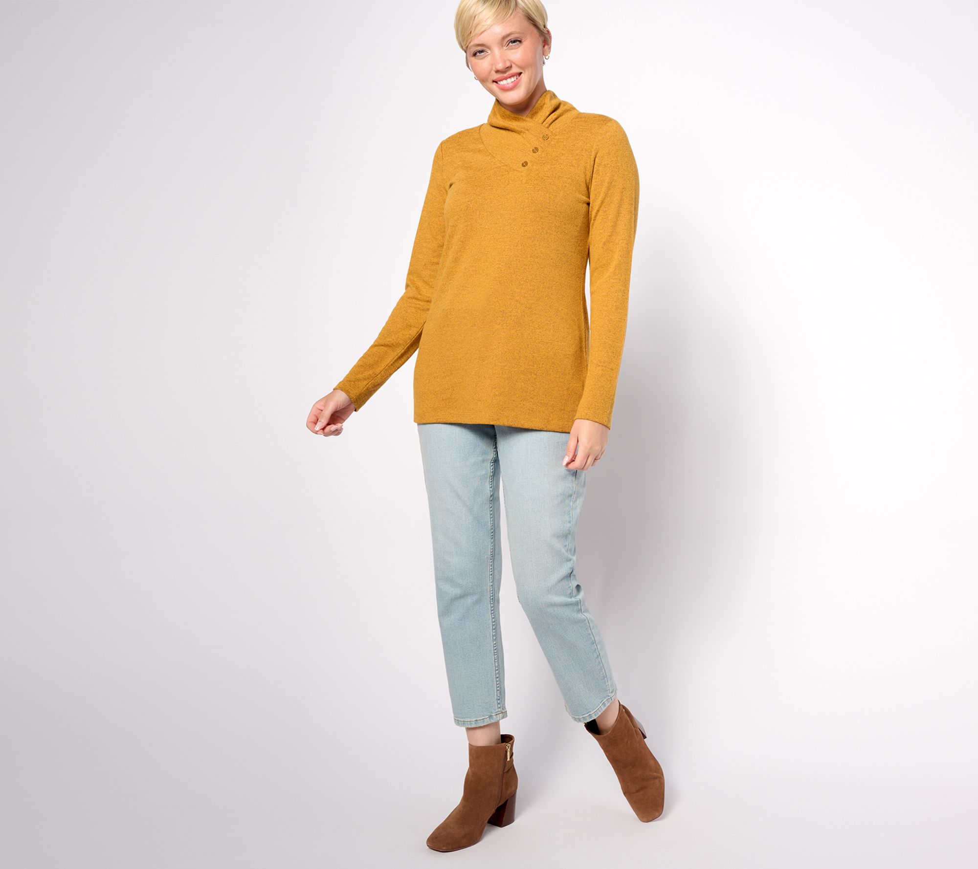 Colder weather can be cause for celebration when you've got this Heavenly Jersey knit top ready and waiting in your closet. Shiver a little less (and look way more chic) in long sleeves and a super-cute crossover cowl neck to warm your (out)look. From Denim & Co.® Fashions.