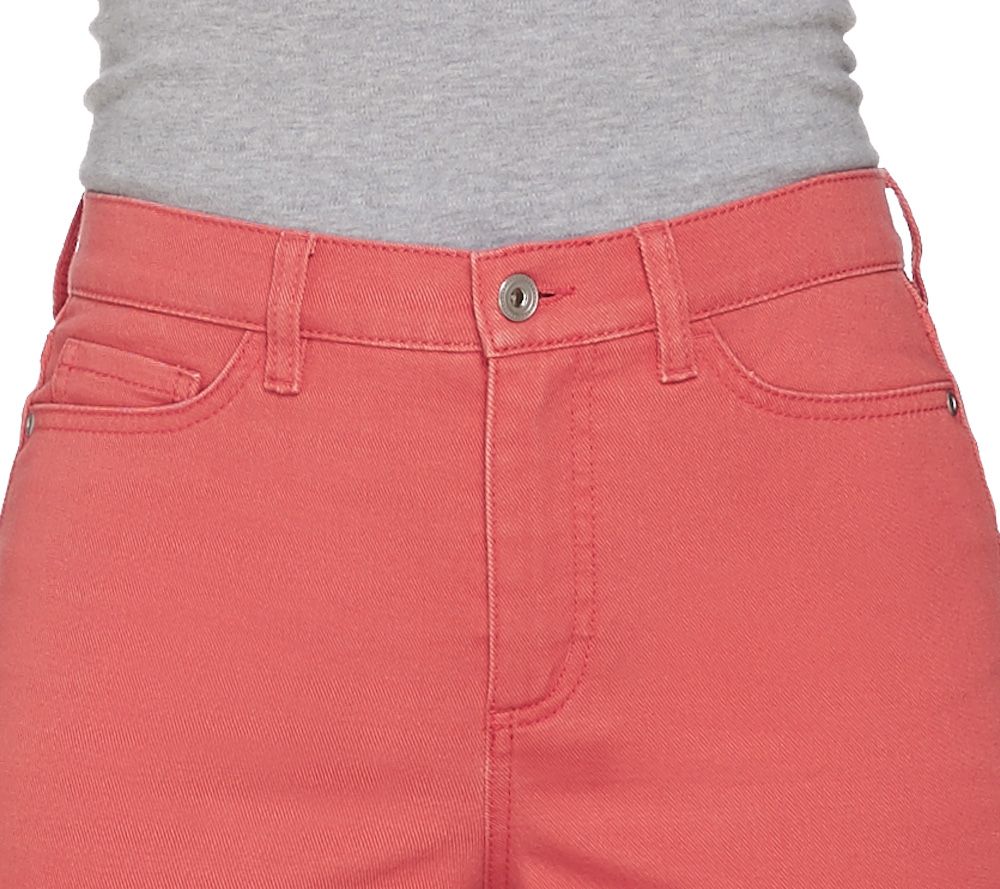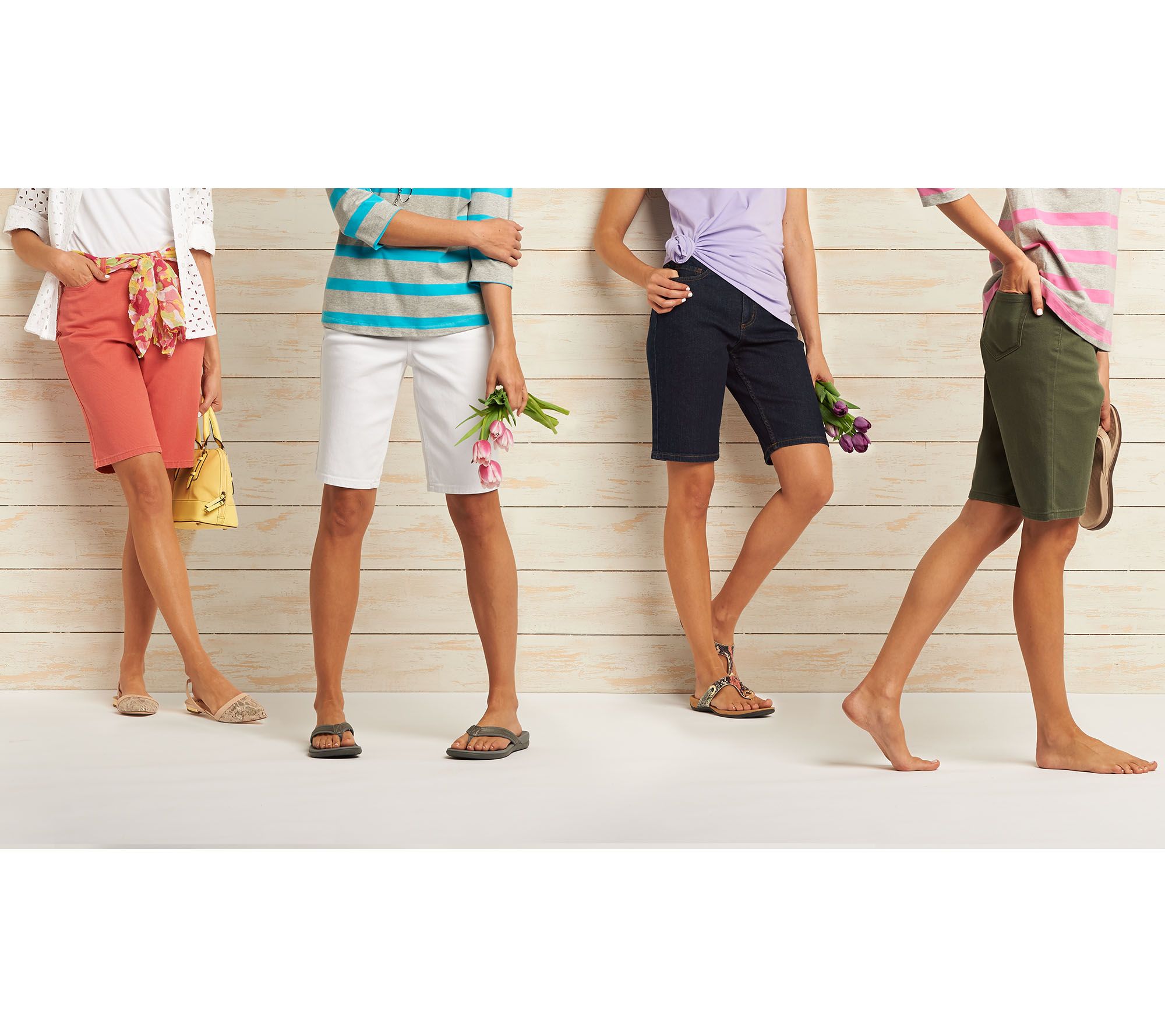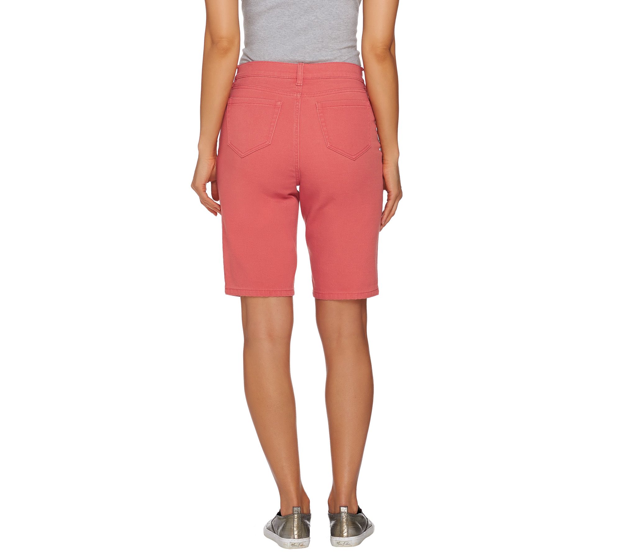 Throw on your sunnies and feel the breeze of the islands in these Denim & Co. "How Modern"(R) Bermuda shorts. At a length that's neither too short nor too long, the classic five-pocket colored denim design is as easy to wear as your favorite jeans. The fitted style also has a bit of stretch for a flattering fit. Plus, the length of a Bermuda short lets you enjoy confident, cool comfort at home or away. From Denim & Co.(R) Fashions.