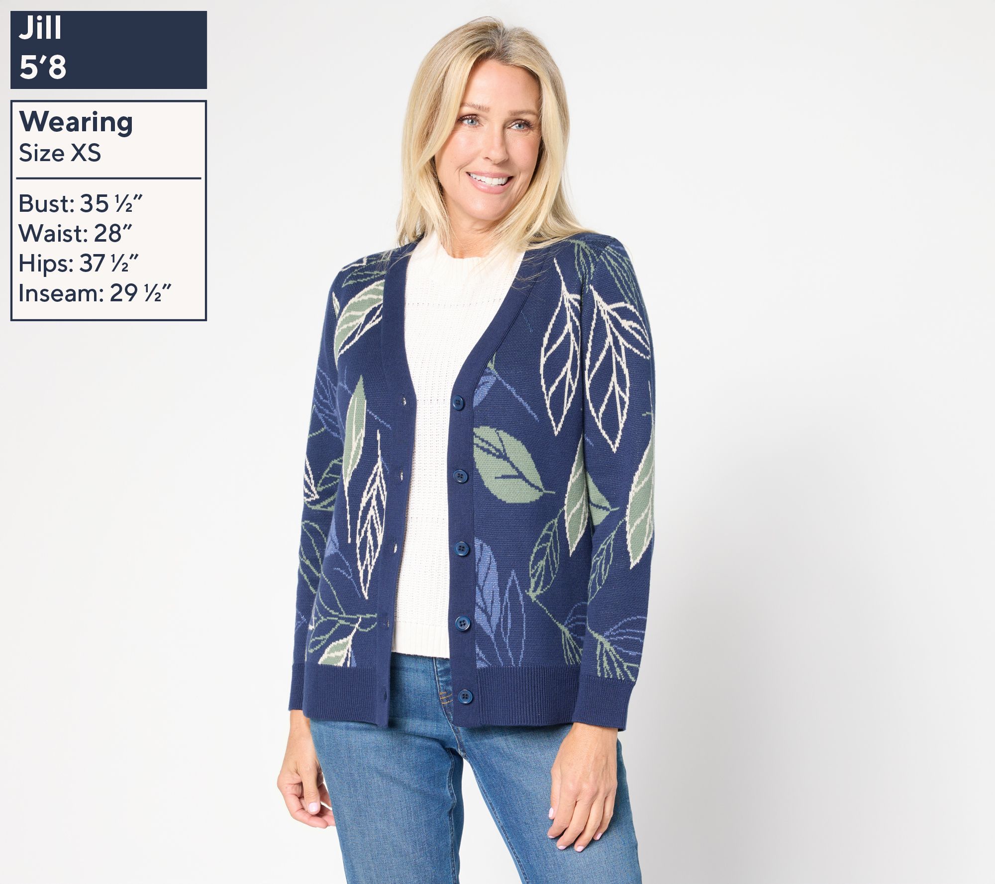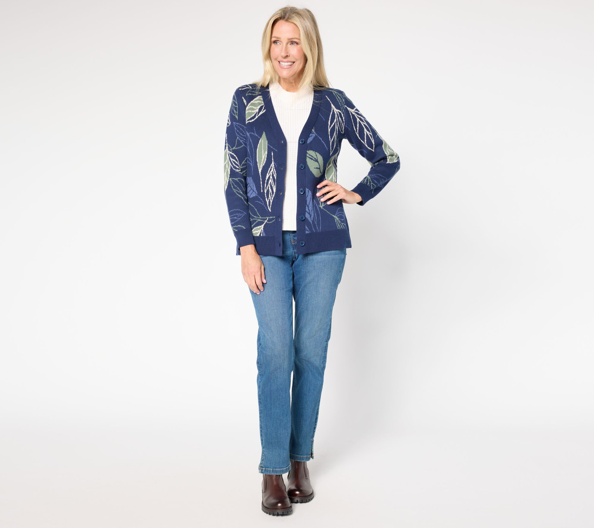 This leafy look is giving fall feels -- and we're *loving* it! Embrace the harvest hues and autumnal cues of this jacquard leaf design sweater cardi -- with a hint of metallic shimmer for extra style. This seasonal closet must-have brings cozy warmth to leaf-peeping, PSL meetings, and cooler-morning greetings. From Denim & Co.® Fashions.