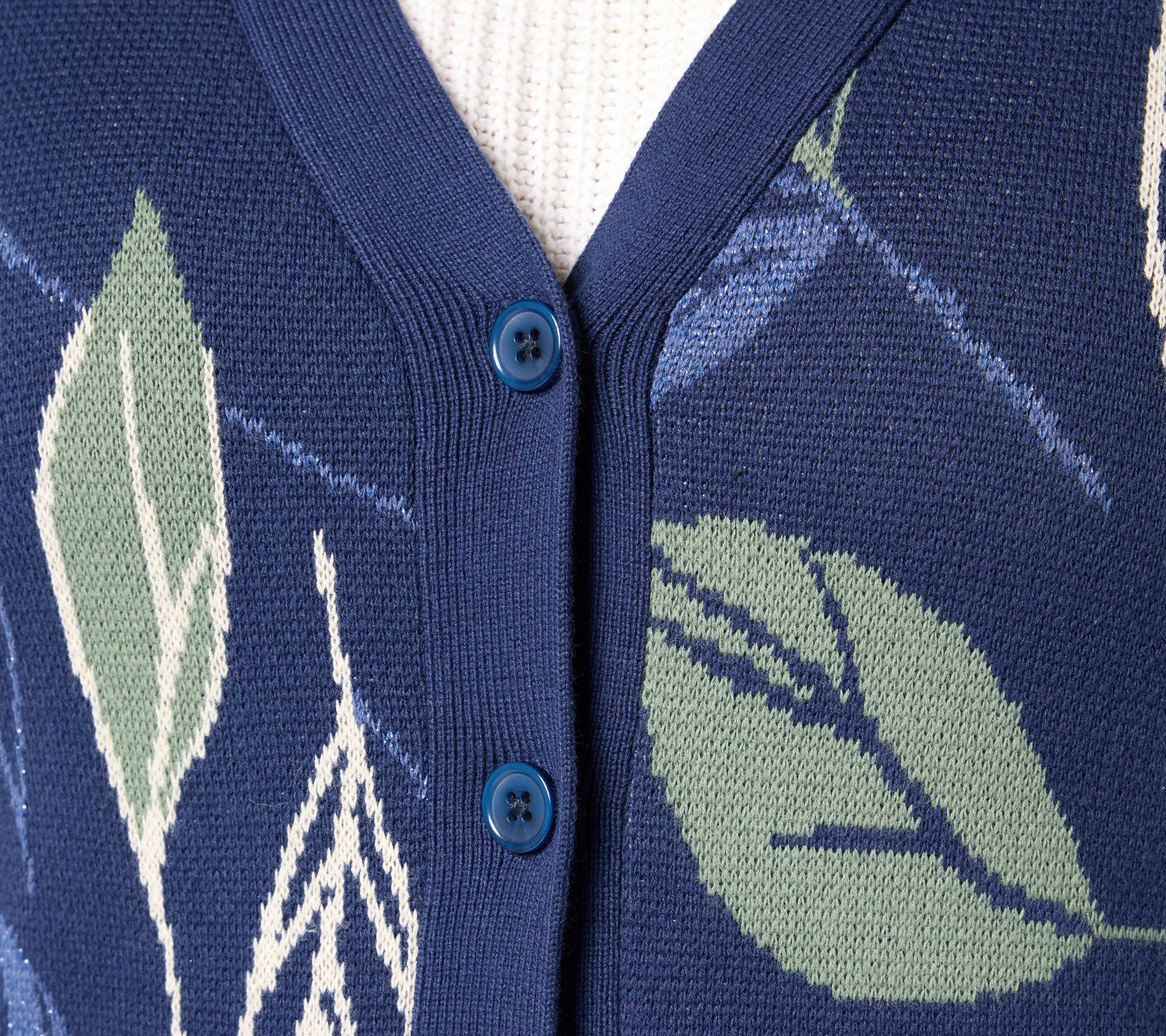 Features: jacquard leaf design, long sleeves, button-front closure, ribbed cuff and hem, subtle metallic yarn