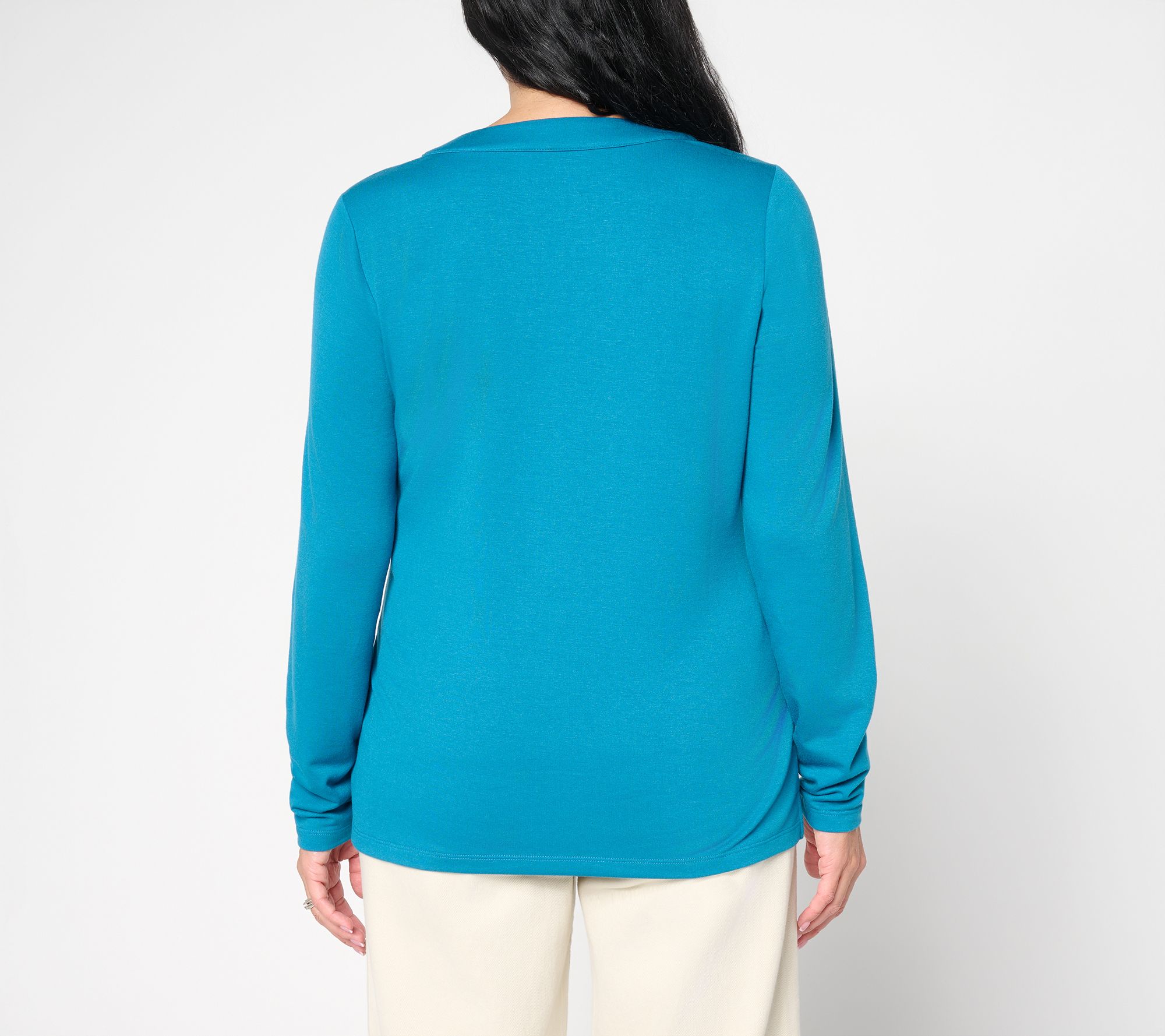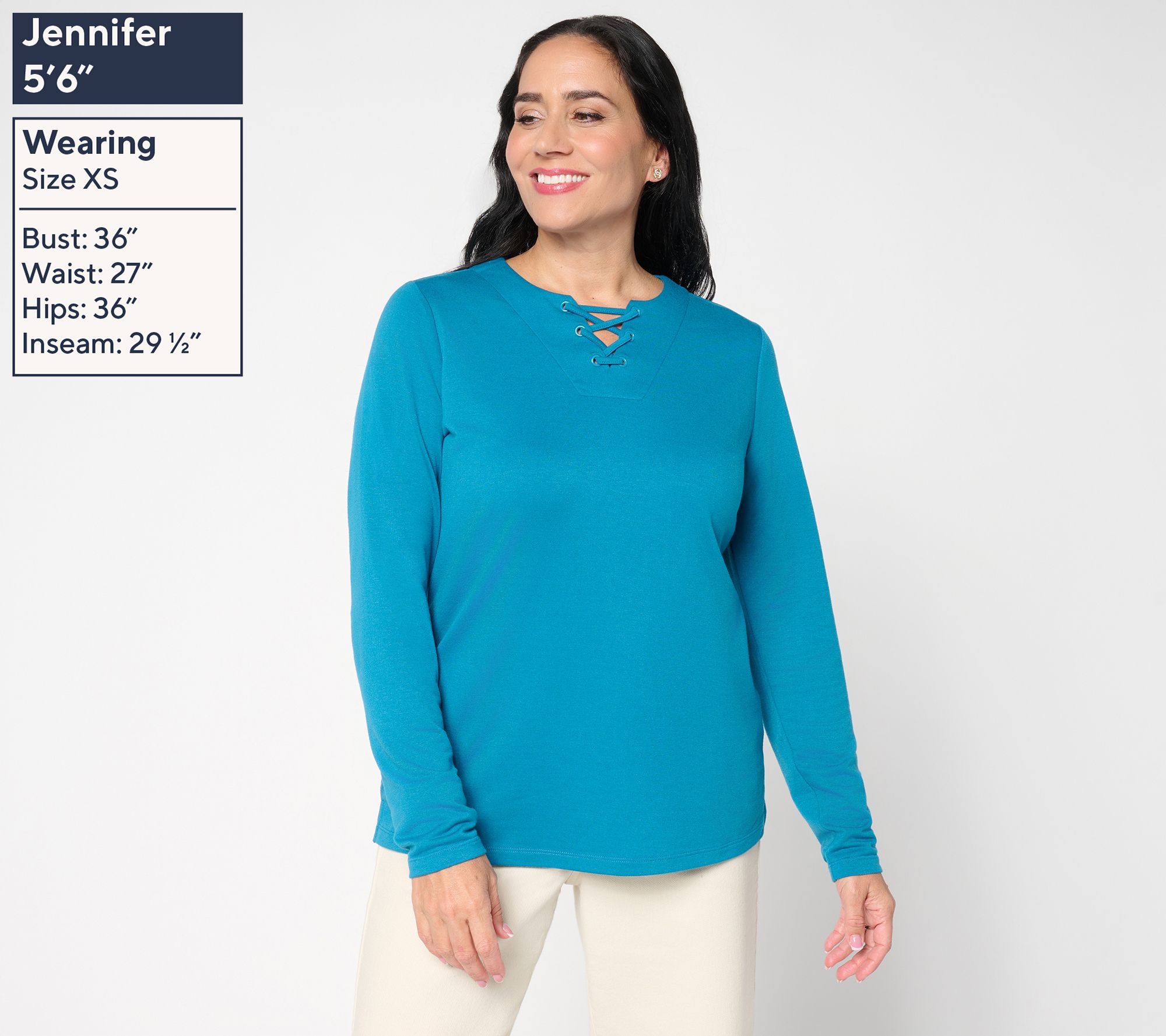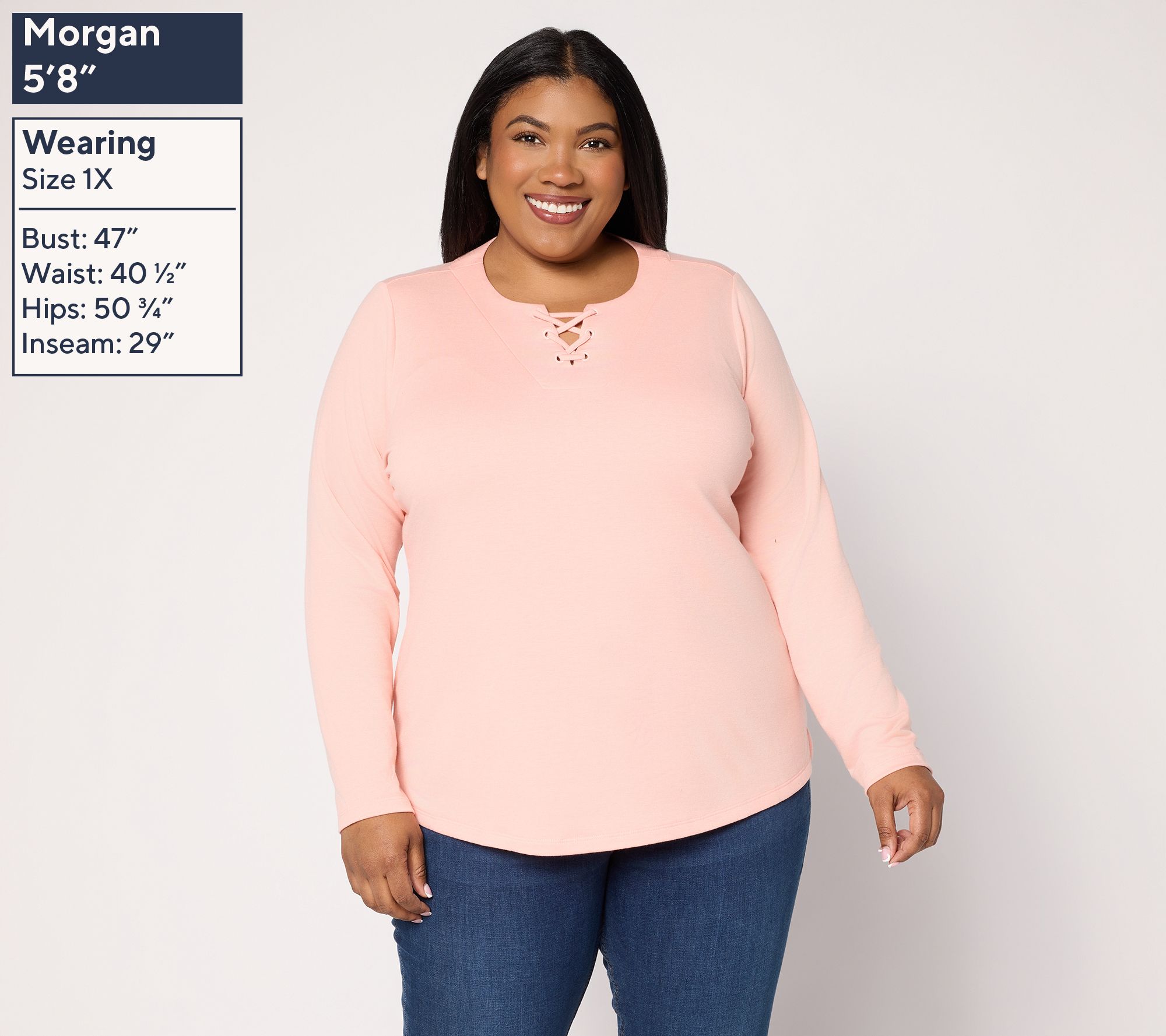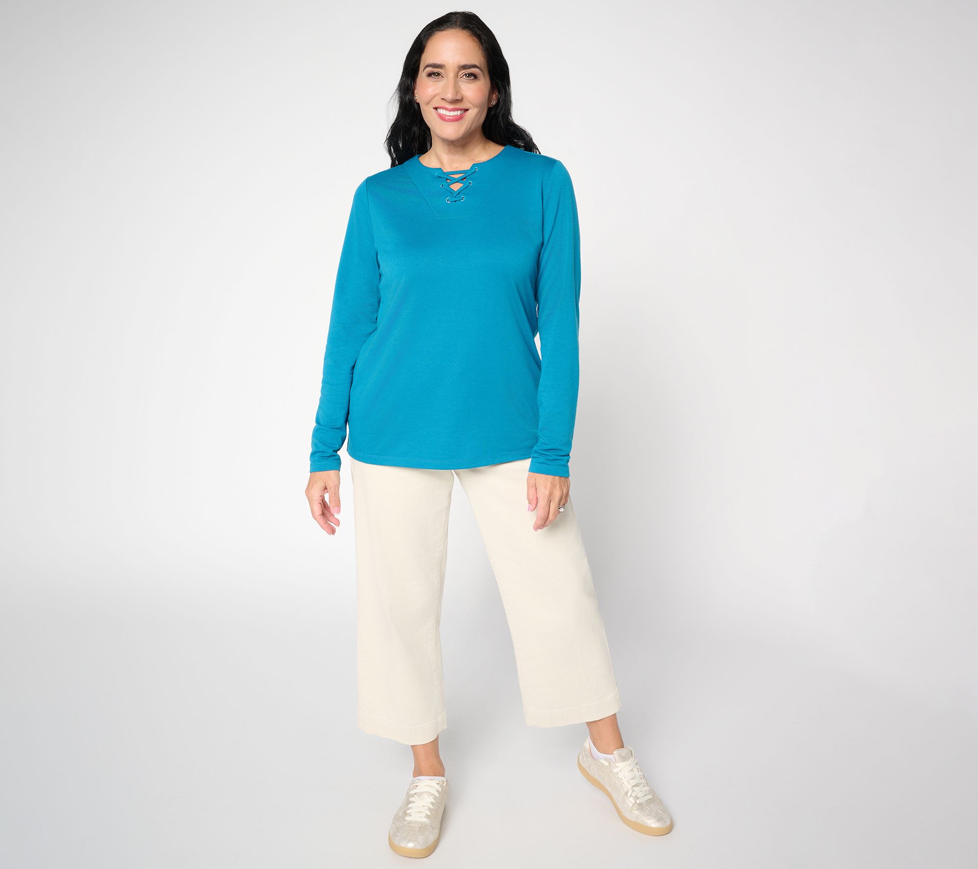 Casual meet-ups or casual Fridays feel just right in this knit top, designed with a split neckline and lace-up detail, and highlighted by gleaming grommets for a modern twist. The long sleeves and side-slit hem keep you comfortable through changing plans, making it a go-to for easy layering or stand-alone style. From Denim & Co.® Fashions.