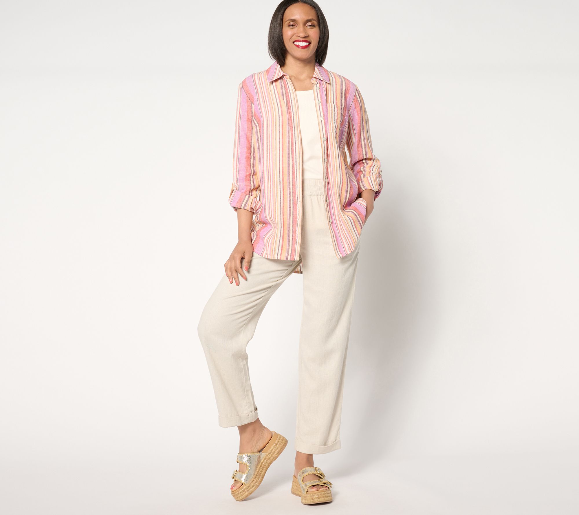 Oh, those summer nights (and days)! Let the vibe be lightweight and versatile -- from sunrise to post sunset -- in this linen-rich button-front tunic from Denim & Co.®'s Naturals collection. Crafted in beautifully saturated colors, lively stripes, and core neutrals, there's one (or three) for anyone who wants to stress less and summer more.