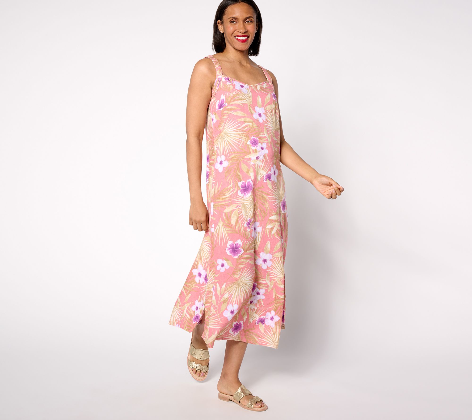 • Features: allover print, straps with adjuster, slip dress silhouette, side slits, maxi length