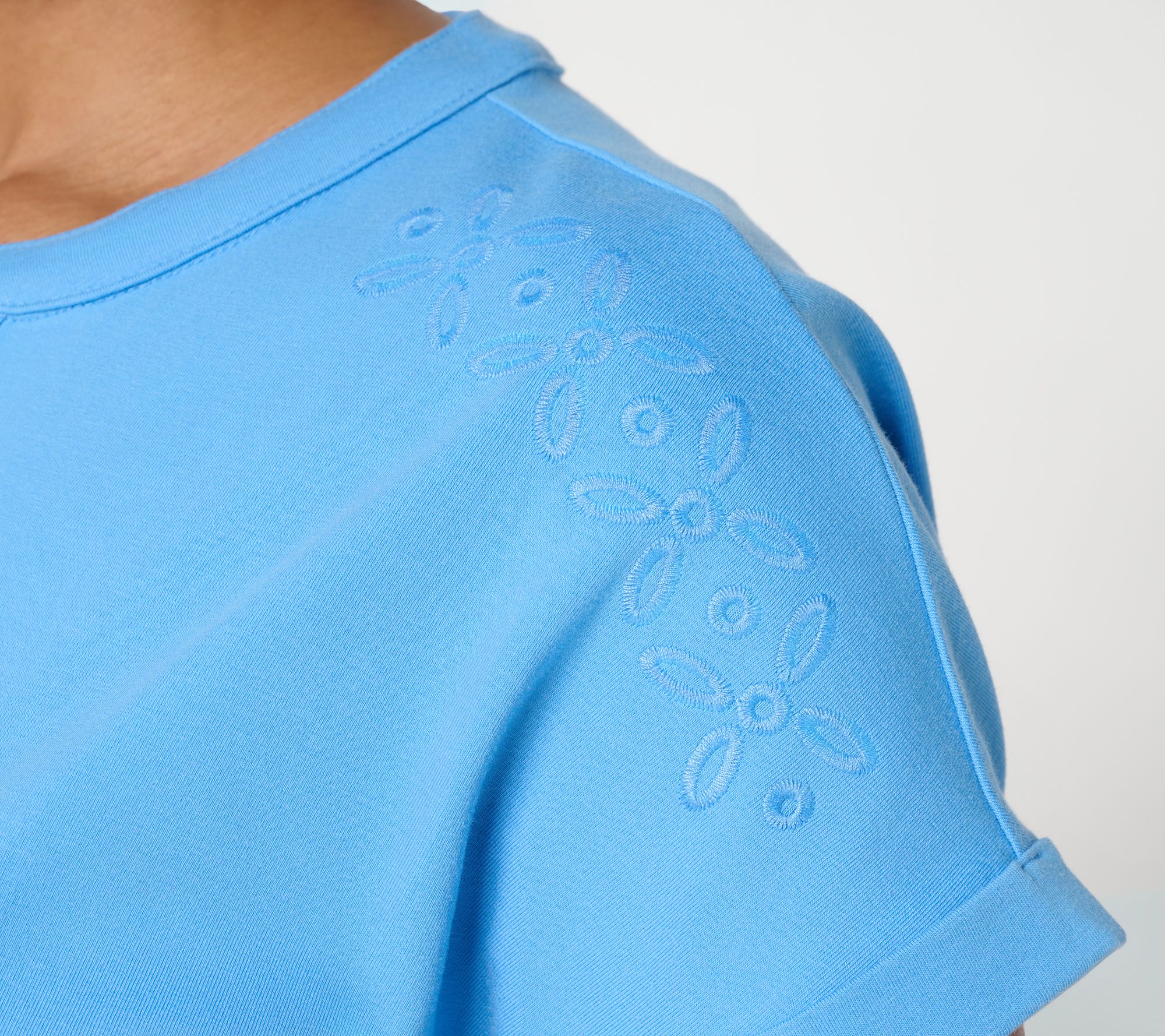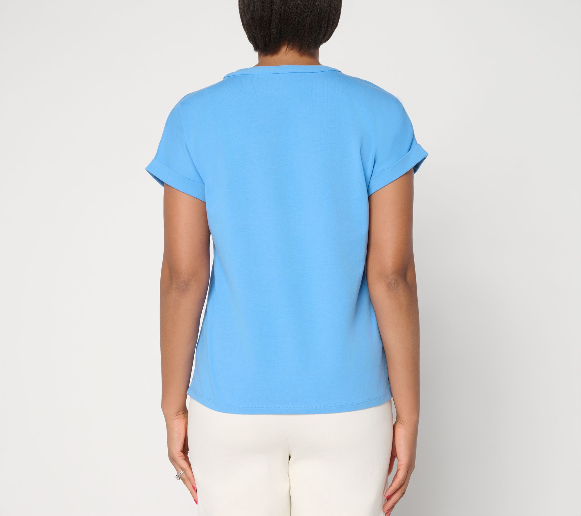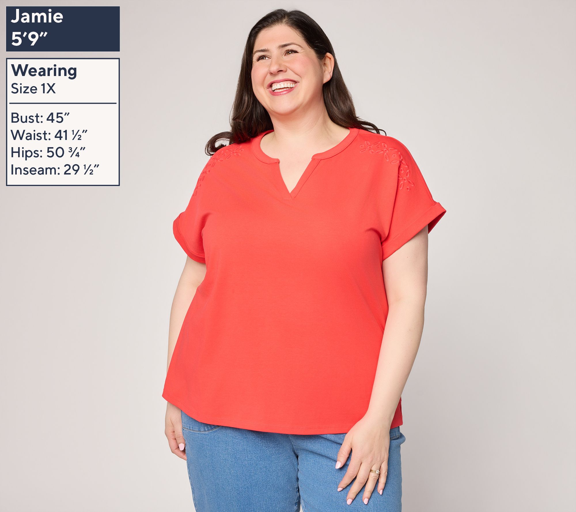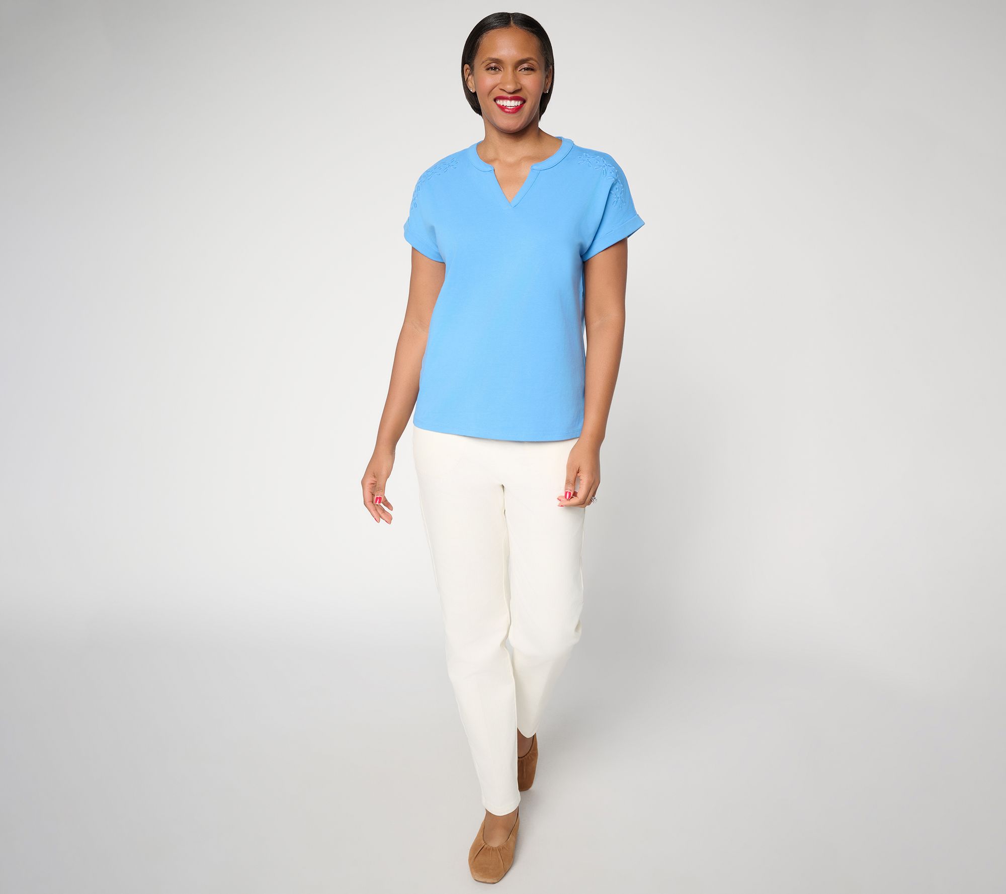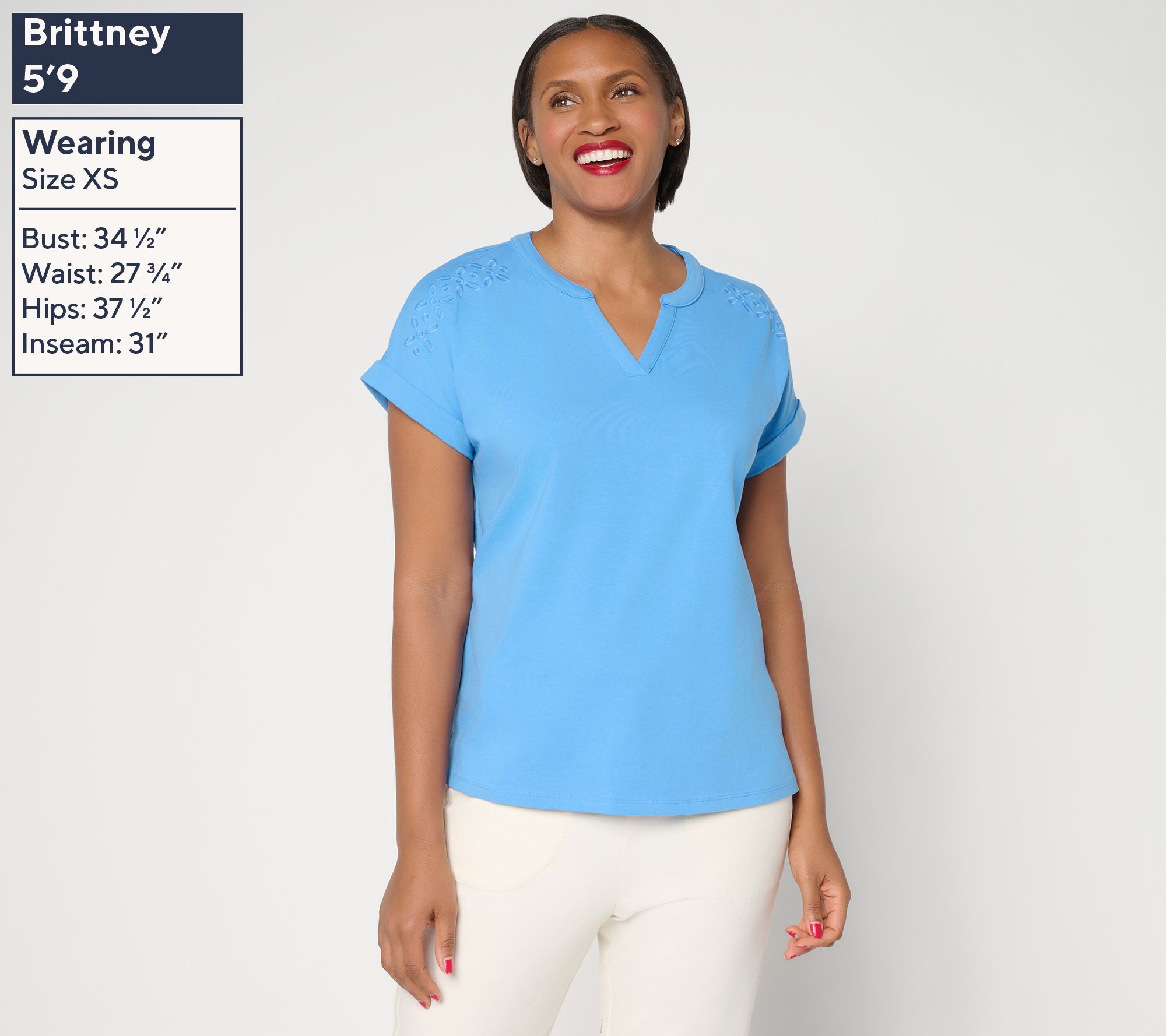 Sunny afternoons in the park or casual outings with friends feel much brighter in this cotton-rich knit top. Embroidery at the shoulders and short dolman sleeves give this top an easy, elevated finish. The split-V neckline and relaxed hem with side slits make it a go-to for effortless everyday style. From Denim & Co.® Fashions.
