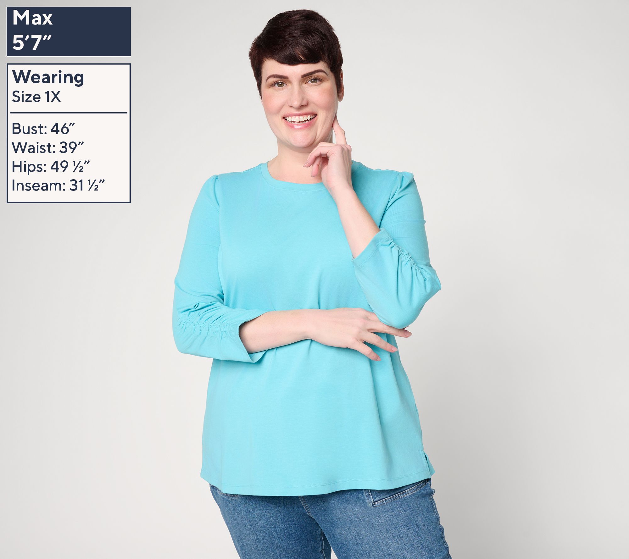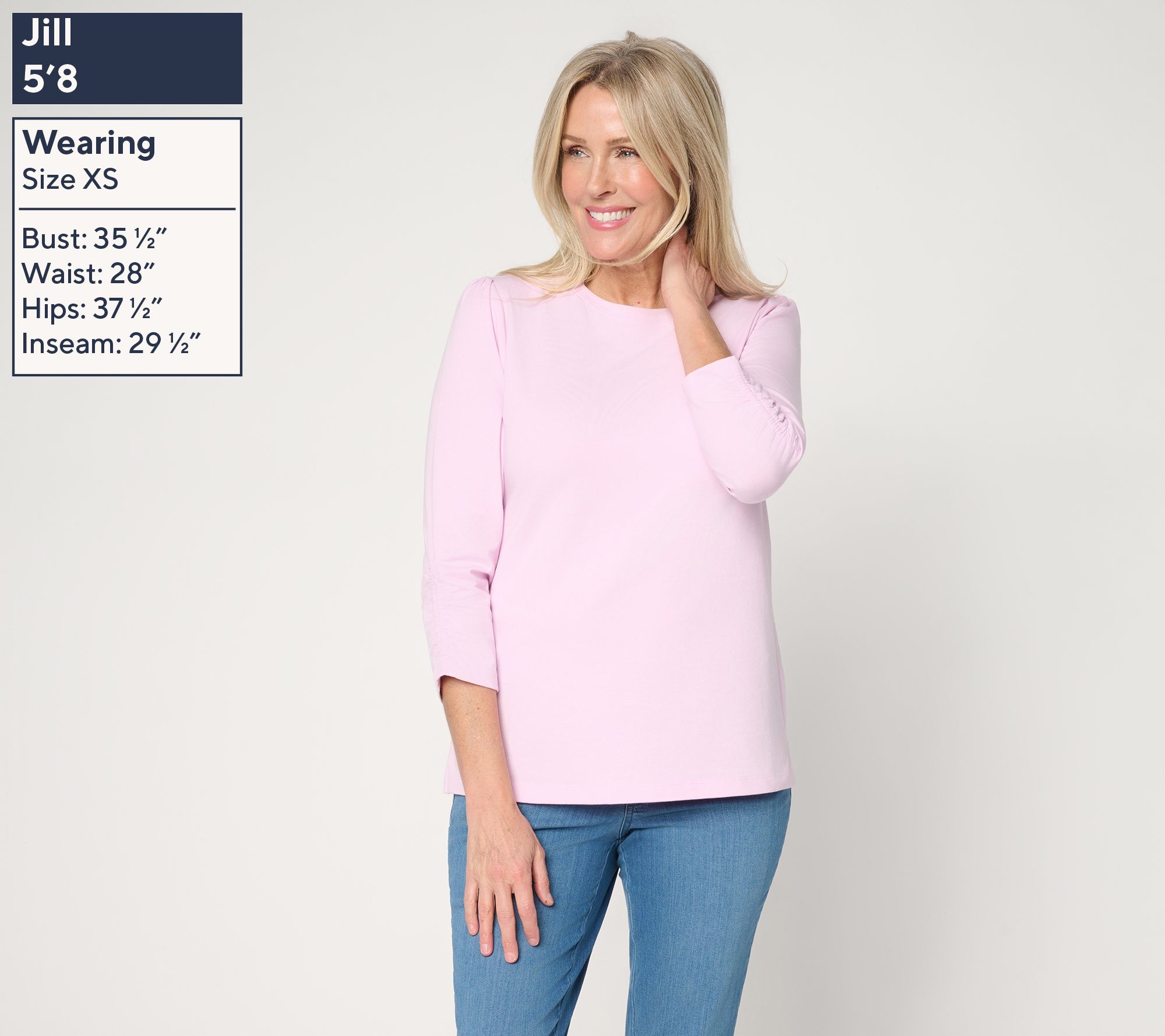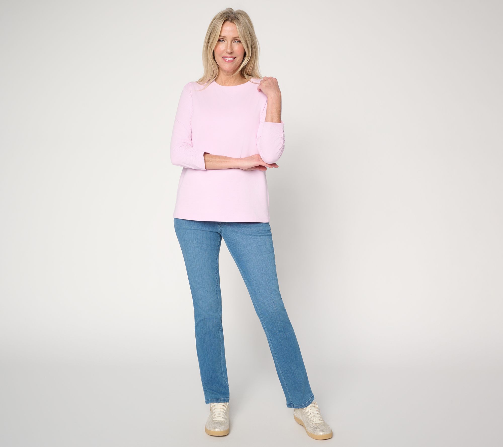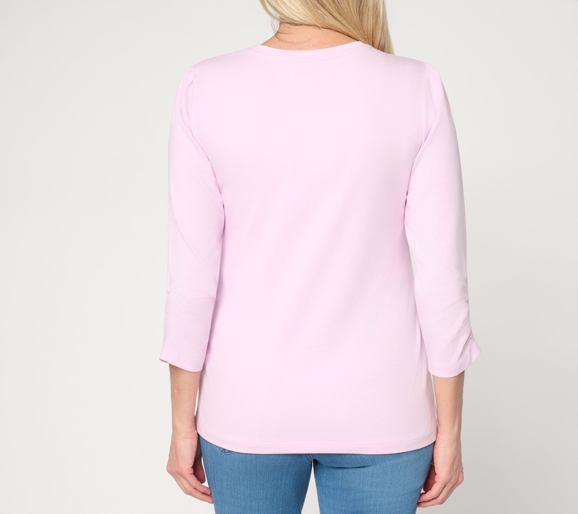 Perfect for everything from relaxed afternoons to busy days, this Perfect Jersey top boasts 3/4-length sleeves with subtle shirring and elastic details for a feminine touch. Its crew neckline and side-slit straight hem deliver easygoing comfort and versatile style that pairs smoothly with jeans, skirts, or shorts. From Denim & Co.® Fashions.