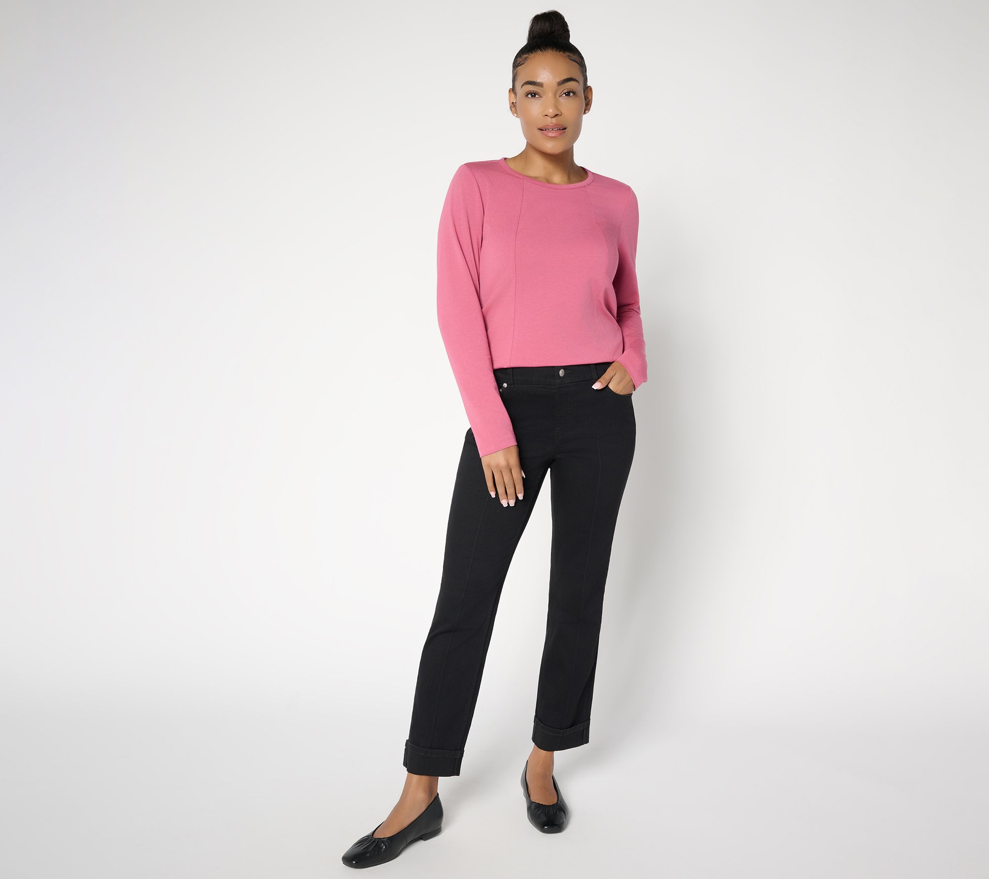 Crushing on the latest fall footwear? Frame your faves with these Easy Stretch ankle jeans, featuring folded cuffs to spotlight a fresh batch of retro sneakers, status-link loafers, or exotic-print boots. The soft stretch denim gives you freedom to move, while pintuck details offer a polished twist for day-to-night appearances. From Denim & Co.® Fashions.
