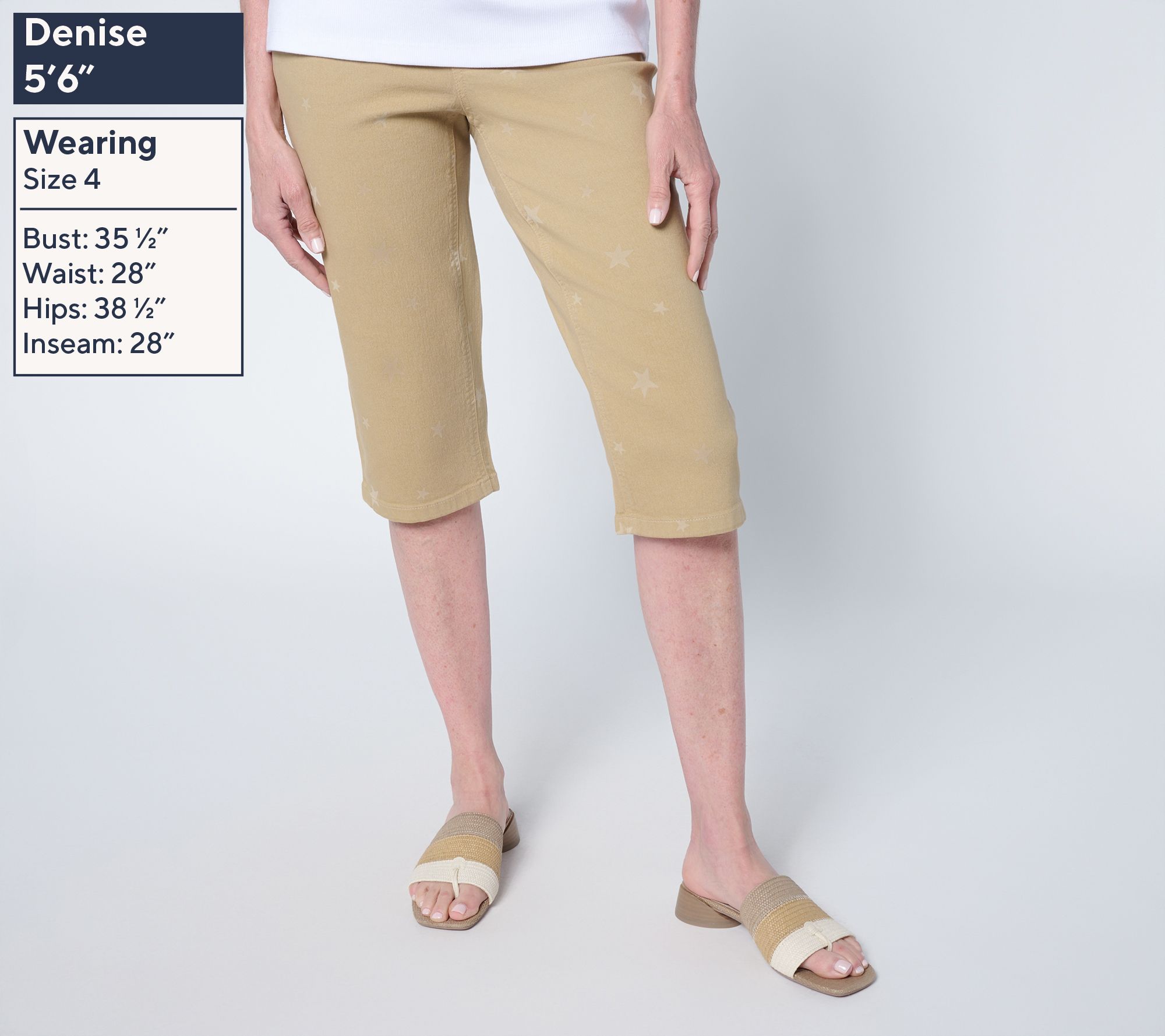 You're the star of the show, no matter where you go in these stretchy skimmers from Denim & Co. Sidestep the overexposure of shorts and beat the heat in pull-ons that feature a playful muted star print -- ideal for summery celebrations from Memorial Day to Labor Day. But don't save them just for star-spangled holidays -- the Americana-inspired print keeps your look fresh and fun all season long. From Denim & Co.® Fashions.