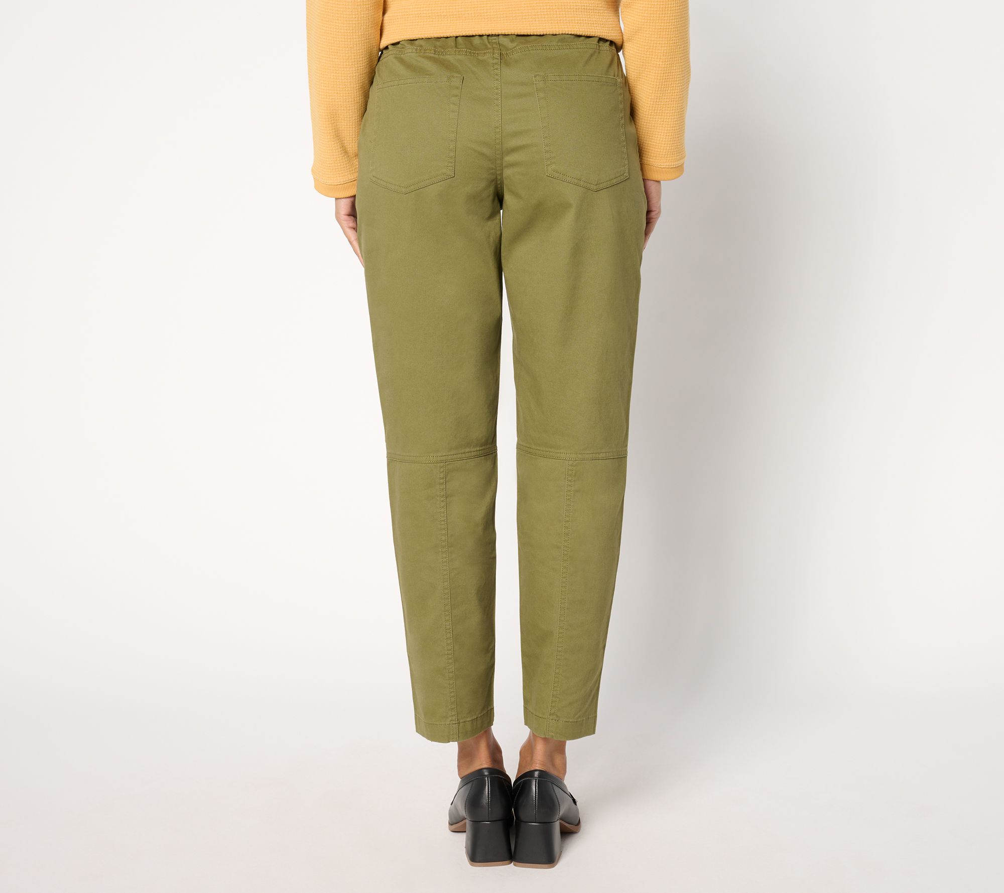 Features: functional button, flat elastic waistband, belt loops, front slash pockets, top applied back pockets, seaming detail on back of knee to hem, ankle length
