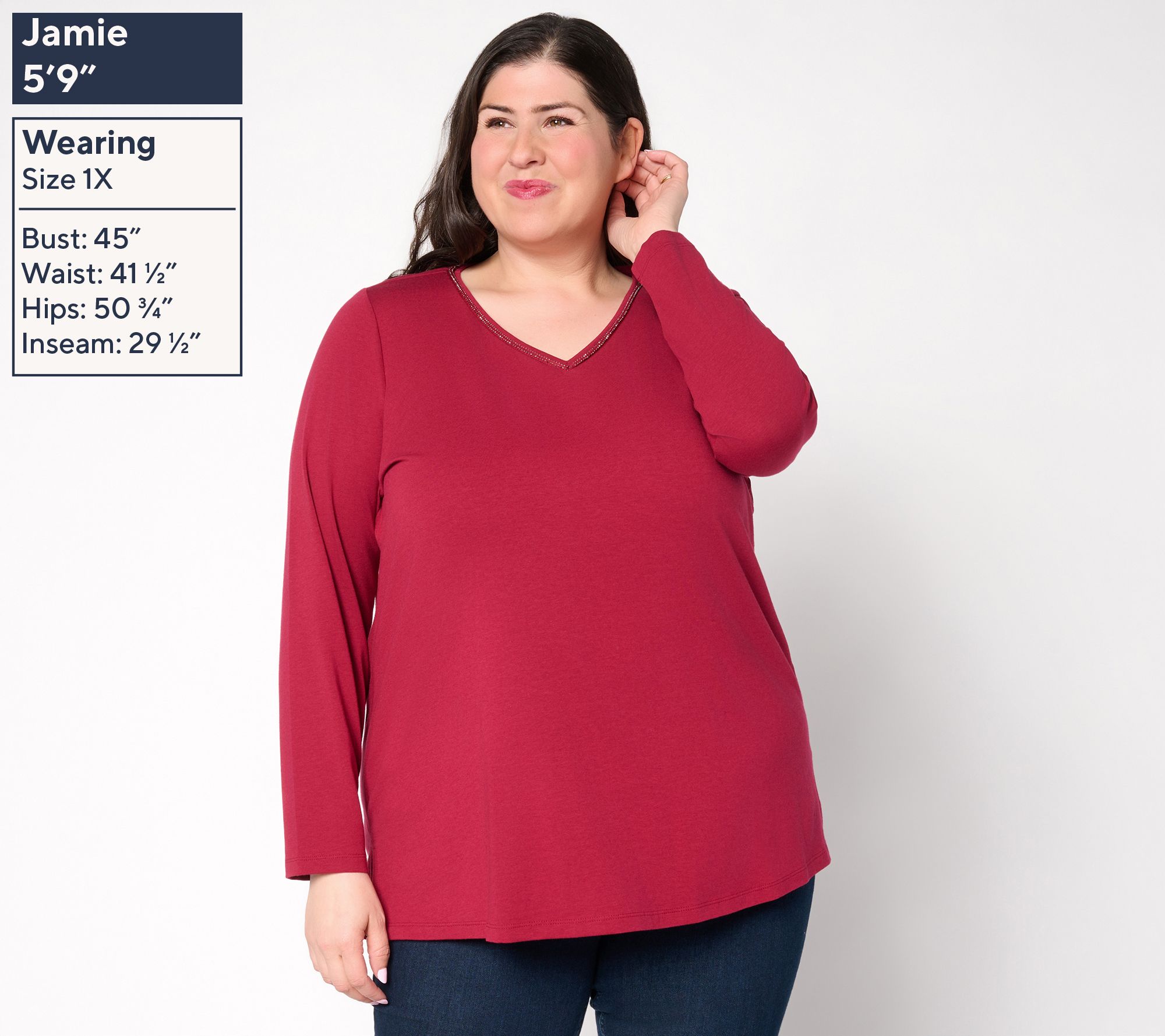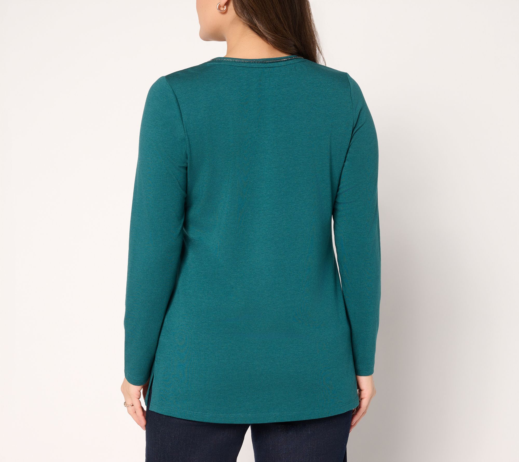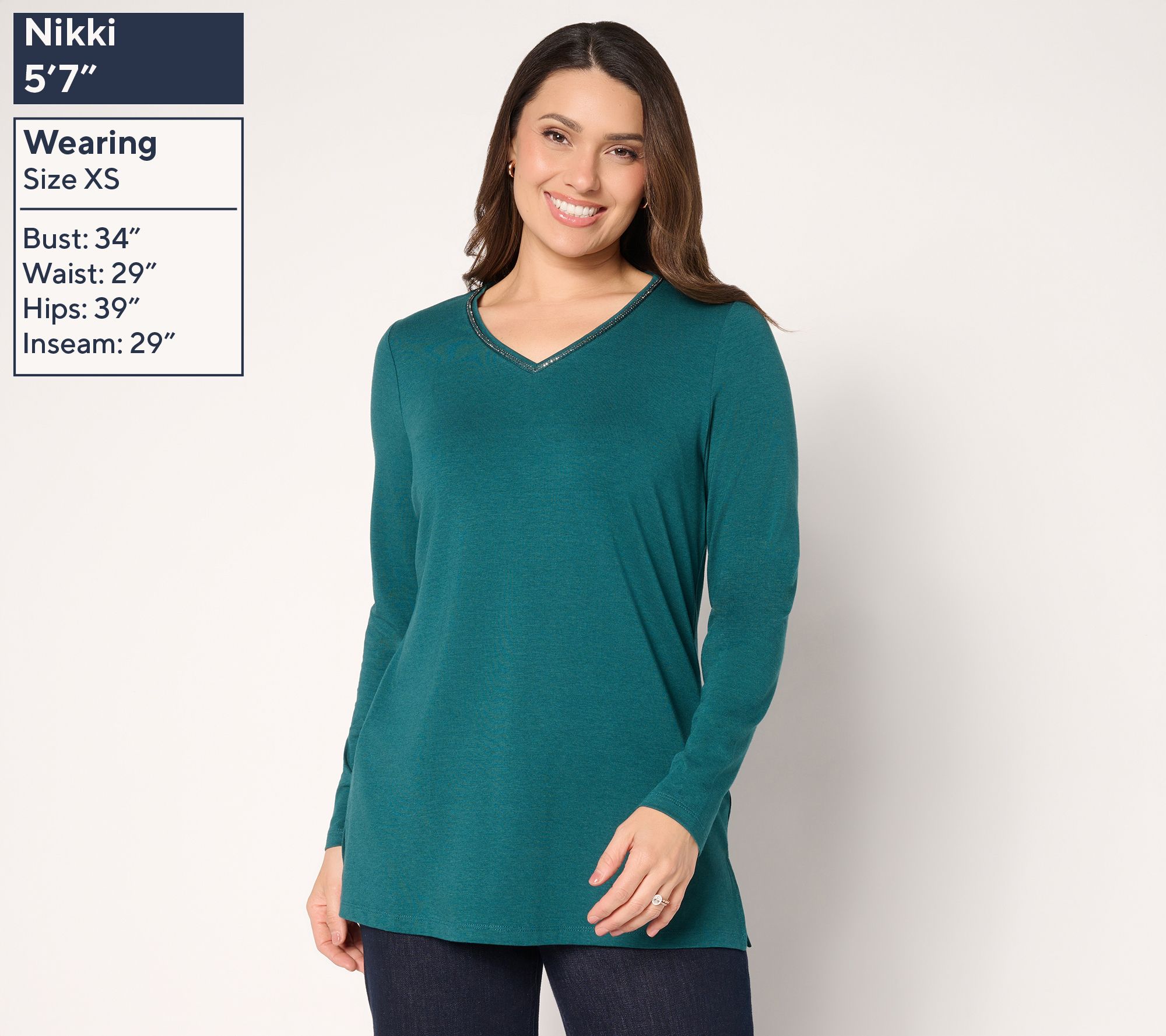 A busy workday, lunch with friends, or a relaxed evening -- this jersey tunic brings comfort and subtle elegance wherever you're headed. The shimmering beaded V-neckline offer an elevated touch, while side slits promise easy movement and day-long ease. From Denim & Co.® Fashions.